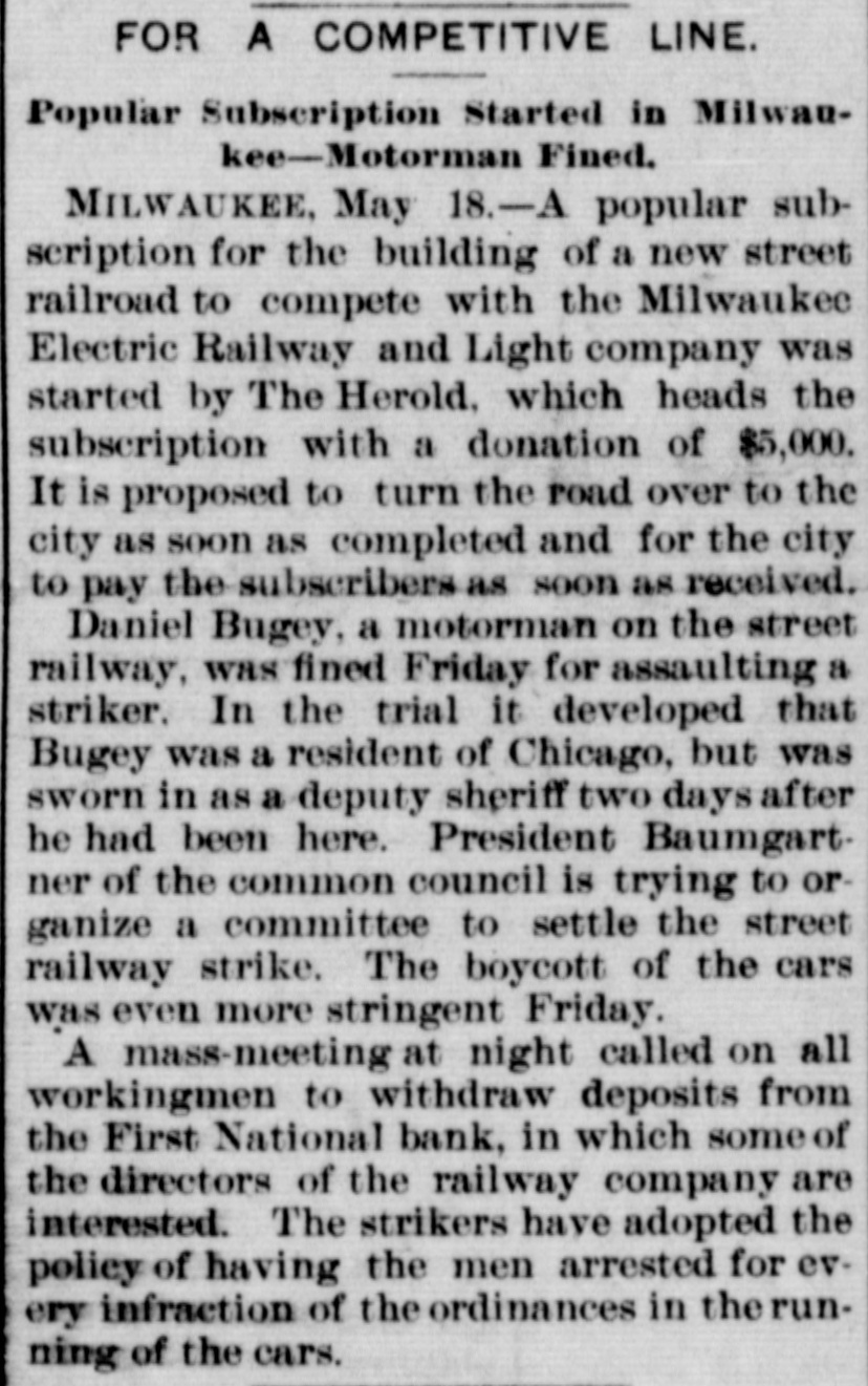 FOR A COMPETITIVE LINE. Popular Subscription Started in Milwaukee-Motorman Fined. MILWAUKEE. May 18.-A popular subscription for the building of a new street railroad to compete with the Milwaukee Electric Railway and Light company was started by The Herold, which heads the subscription with a donation of $5,000. It is proposed to turn the road over to the city as soon as completed and for the city to pay the subscribers as soon as received. Daniel Bugey, a motorman on the street railway, was fined Friday for assaulting a striker. In the trial it developed that Bugey was a resident of Chicago, but was sworn in as a deputy sheriff two days after he had been here. President Baumgartner of the common council is trying to organize a committee to settle the street railway strike. The boycott of the cars was even more stringent Friday. A mass-meeting at night called on all workingmen to withdraw deposits from the First National bank, in which some of the directors of the railway company are interested. The strikers have adopted the policy of having the men arrested for every infraction of the ordinances in the running of the cars.