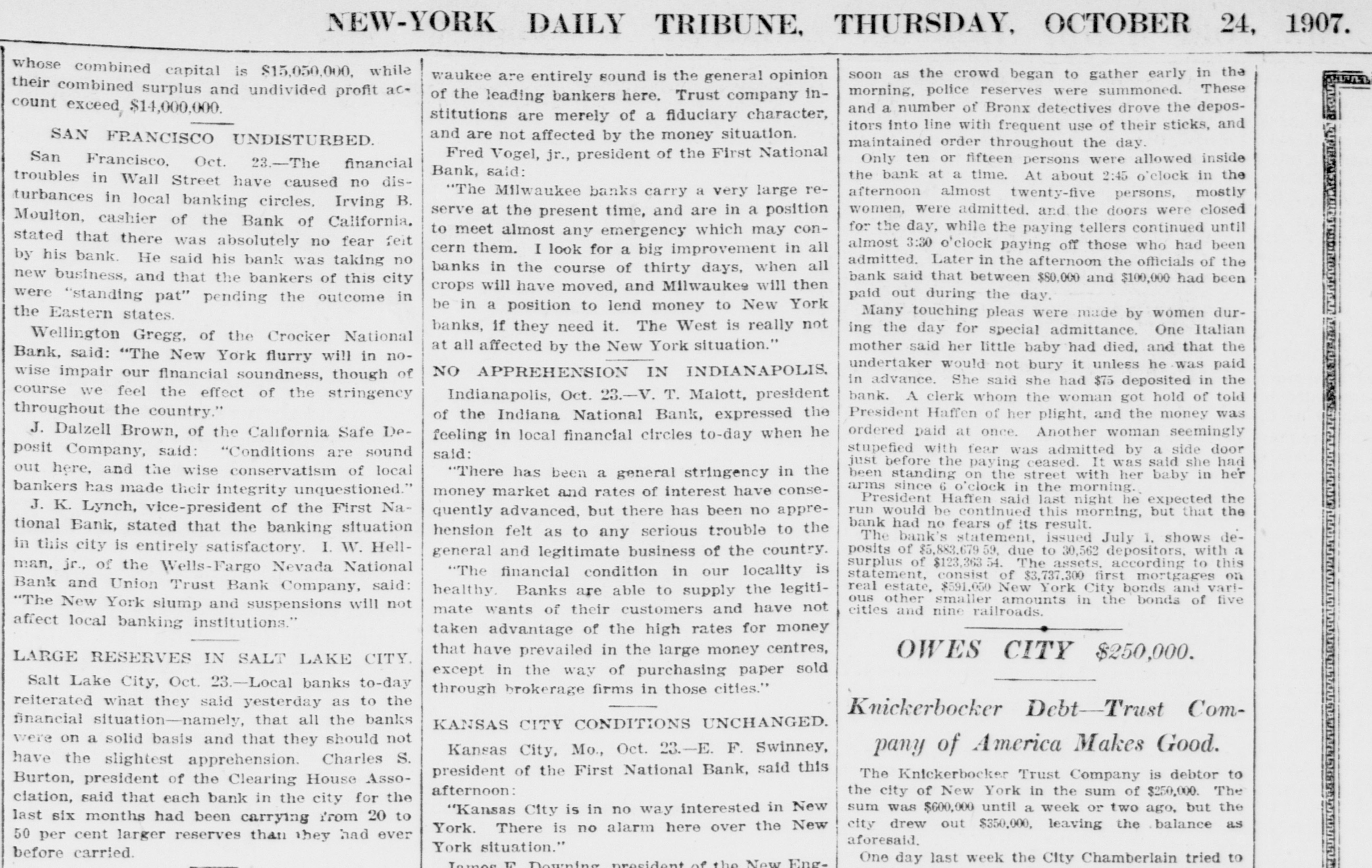 1907. NEW-YORK DAILY TRIBUNE, THURSDAY, OCTOBER 24, whose combined capital is $15,050,000, while soon as the crowd began to gather early in the waukee are entirely sound is the general opinion their combined surplus and undivided profit acmorning, police reserves were summoned. These of the leading bankers here. Trust company inand a number of Bronx detectives drove the deposcount exceed $14,000,000. stitutions are merely of a fiduciary character, itors into line with frequent use of their sticks, and and are not affected by the money situation. SAN FRANCISCO UNDISTURBED. maintained order throughout the day. Fred Vogel, jr., president of the First National Only ten or fifteen persons were allowed inside San Francisco, Oct. 23.-The financial Bank, said: the bank at a time. At about 2:45 o'clock in the troubles in Wall Street have caused no dis"The Milwaukee banks carry a very large reafternoon almost twenty-five persons, mostly turbances in local banking circles. Irving B. women, were admitted. and the doors were closed serve at the present time, and are in a position Moulton, cashier of the Bank of California. for the day, while the paying tellers continued until to meet almost any emergency which may constated that there was absolutely no fear feit almost 3:30 o'clock paying off those who had been cern them. I look for a big improvement in all admitted. Later in the afternoon the officials of the by his bank. He said his bank was taking no banks in the course of thirty days, when all bank said that between $80,000 and $100,000 had been new business, and that the bankers of this city crops will have moved, and Milwaukes will then paid out during the day. were "standing pat" pending the outcome in be in a position to lend money to New York Many touching pleas were made by women durthe Eastern states. banks, if they need it. The West is really not ing the day for special admittance. One Italian Wellington Gregg, of the Crocker National mother said her little baby had died, and that the at all affected by the New York situation." Bank, said: "The New York flurry will in noundertaker would not bury it unless he was paid NO APPREHENSION IN INDIANAPOLIS wise impair our financial soundness, though of in advance. She said she had $75 deposited in the course we feel the effect of the stringency Indianapolis, Oct. 23.-V. T. Malott, president bank. A clerk whom the woman got hold of told throughout the country." President Haffen of her plight, and the money was of the Indiana National Bank, expressed the ordered paid at once. Another woman seemingly J. Dalzell Brown, of the California Safe Defeeling in local financial circles to-day when he stupefied with fear was admitted by a side door posit Company, said: "Conditions are sound said: just before the paying ceased. It was said she had out here, and the wise conservatism of local "There has been a general stringency in the been standing on the street with her baby in her arms since 6 o'clock in the morning. bankers has made their integrity unquestioned." money market and rates of interest have consePresident Haffen said last night he expected the J. K. Lynch, vice-president of the First Narun would be continued this morning, but that the quently advanced, but there has been no apprebank had no fears of its result. tional Bank, stated that the banking situation hension felt as to any serious trouble to the The bank's statement, issued July 1. shows dein this city is entirely satisfactory. I. W. Hellposits of $5,883,679 due to 30,562 depositors, with a general and legitimate business of the country. surplus of $123,363 54. The assets. according to this man, jr., of the Wells-Fargo Nevada National "The financial condition in our locality is statement, consist of $3,737,300 first mortgages on Bank and Union Trust Bank Company, said: real estate, $591,050 New York City bonds and varihealthy. Banks are able to supply the legitious other smaller amounts in the bonds of five "The New York slump and suspensions will not mate wants of their customers and have not cities and nine railroads. affect local banking institutions." taken advantage of the high rates for money that have prevailed in the large money centres, OWES CITY $250,000. LARGE RESERVES IN SALT LAKE CITY except in the way of purchasing paper sold Salt Lake City, Oct. 23.-Local banks to-day through brokerage firms in those cities." reiterated what they said yesterday as to the Knickerbocker Debt-Trust Comfinancial situation-namely, that all the banks KANSAS CITY CONDITIONS UNCHANGED. were on a solid basis and that they should not pany of America Makes Good. Kansas City, Mo., Oct. 23.-E. F. Swinney, have the slightest apprehension. Charles S. president of the First National Bank, said this The Knickerbocker Trust Company is debtor to Burton, president of the Clearing House Assoafternoon: the city of New York in the sum of $250,000. The clation, said that each bank in the city for the sum was $600,000 until a week or two ago, but the "Kansas City is in no way interested in New last six months had been carrying from 20 to city drew out $350,000, leaving the balance as York. There is no alarm here over the New 50 per cent larger reserves than they had ever aforesaid. York situation." before carried. One day last week the City Chamberlain tried to IN Downing president of the New Eng-