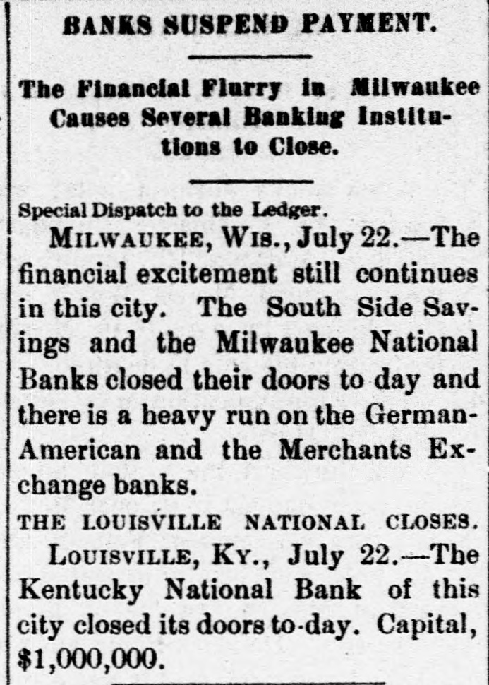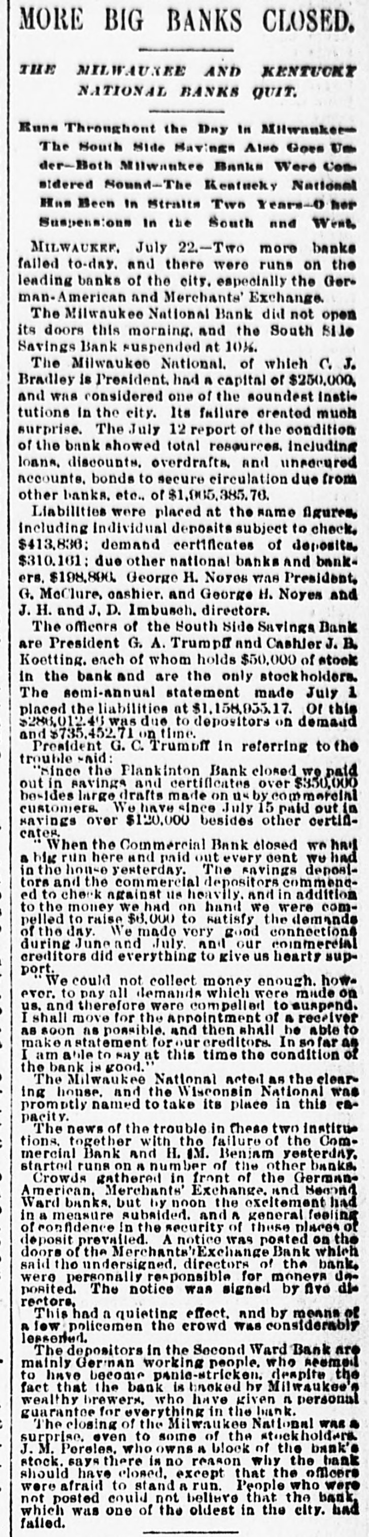 Sundry Banks Suspend. [By telegraph to the Dispatch.] MEMPHIS, TENN., July 22.-The Citizens' Bank of Jellico, Tenn., the only banking institution in that place, failed to open for business yesterday. No figures known. GREELEY, CoL., July 22.-The Union Bank made an assignment yesterdav. It 18 thought the step was voluntarily taken to avoid a contingency that might arise should some creditor take advantage of the attachment law. The bank is perfectly solvent and not a depositor will lose a dollar. VERNON, TEX., July 22.-The State National Bank of Vernon closed its doors yesterday. Every cent of money was paid out, except ten cents, before the doors were closed. The failure was due to inability to realize on securities. The directors state that depositors will be paid in full. LOUISVILLE, Kr., July 22.-The Kentucky National Bank, this city, closed its doors this morning. Capital stock $1,000,000. paid up. This bank is also a government depository and its last statement showed $190,000 to the credit of the government. The loans and discounts outstanding amounted to $1,719,966, and the surplus was $108,500. MILWAUKEE, WIS., July 22.-The SouthSide Savings Bank did not open its doors this morning. There is a heavy run on the German-American and Merchant's Exchange banks. KNOXVILLE, TENN., July 22.-The State National Bank closed this morning atter opening four minutes. A notice was posted on the door saying: This bank has closed for liquidation. Depositors will be paid in full." MILWAUKEE, WIS., July 22.-The Milwaukee National Bank closed its doors this morning. LAMPASAS, TEX.. July 22.-The private banking-house of J. & L. W. Galbraith failed to open its doors yesterday having made an assignment to J. I. Campbell. Liabilities $60,000; assets. $120,000. A run on the First National Bank started, but it was fortunately in a position to withstand all demands. The depositors in Galbraith's Bank will be paid in full. TOPEKA, KAN., July 22.-The First National Bank of Anthony closed its doors yesterday. Assets, $154,000; liabilities, $50,000. RUSSELL, KAN., July 22.-The First National Bank, of this place, closed this afternoon and was taken possession ot by C. M. Sawyer on the order of the Comptroller of the Currency. No statement is made.