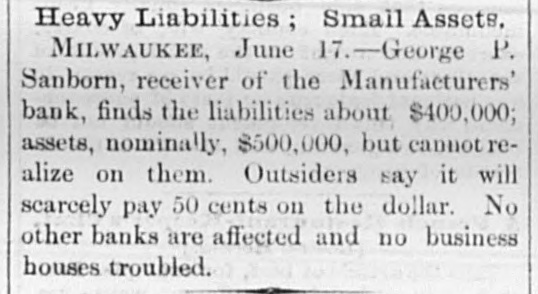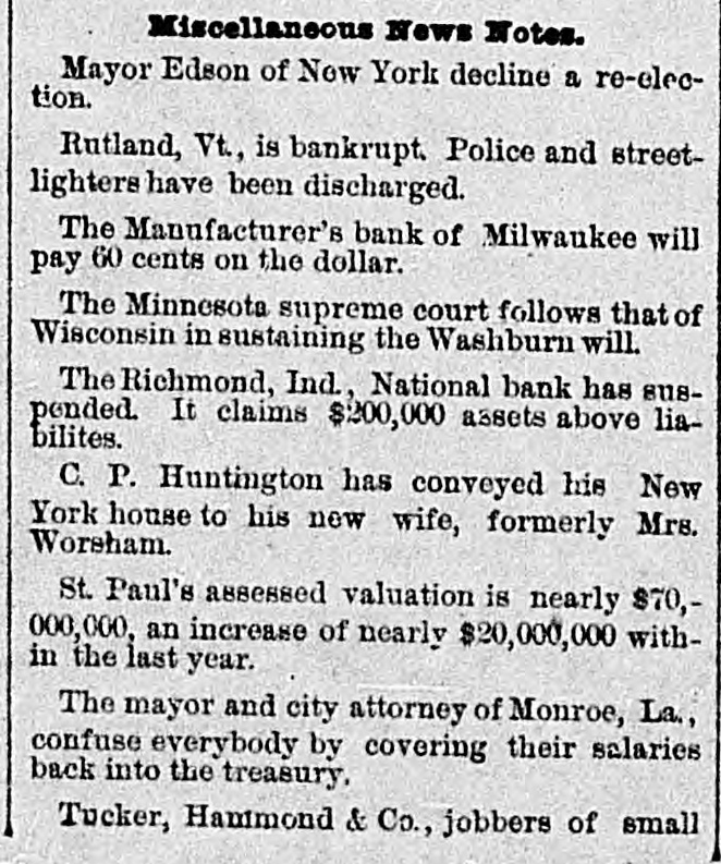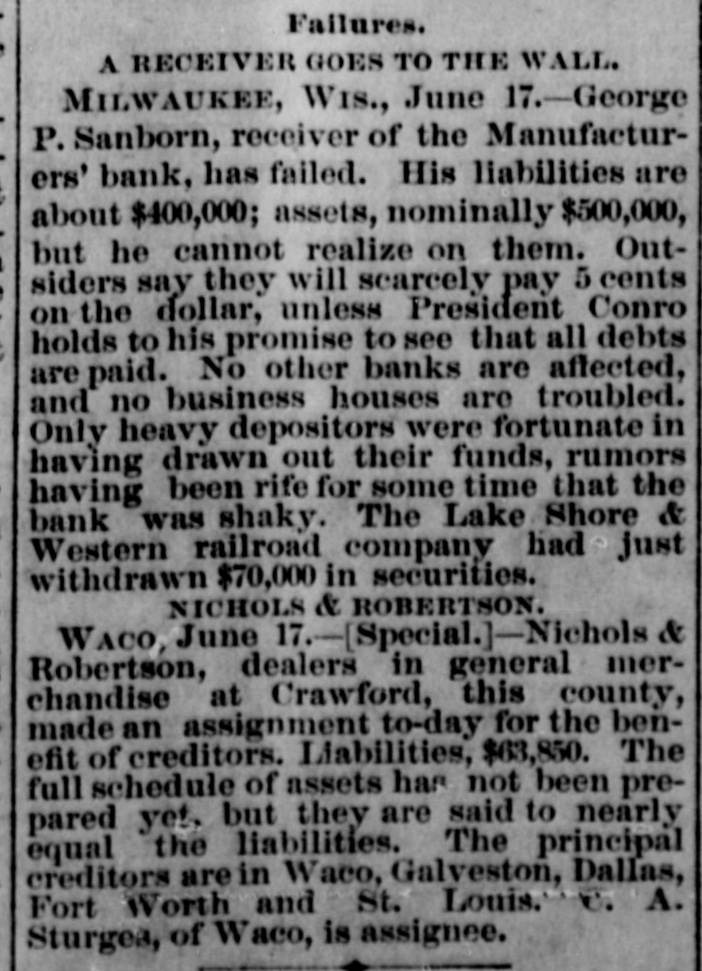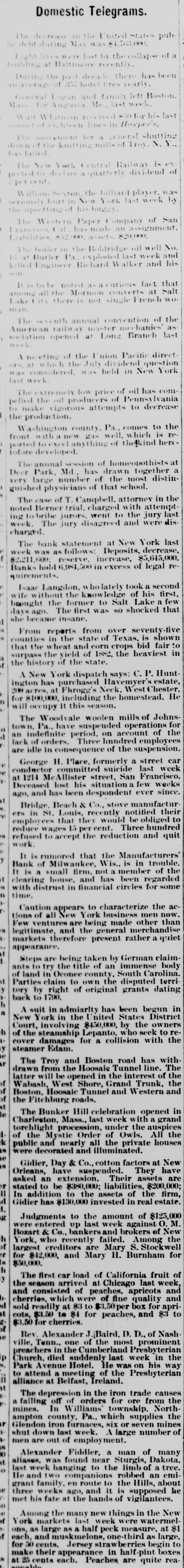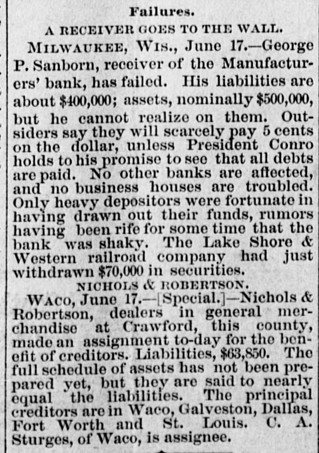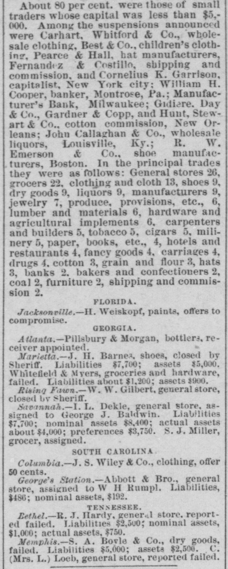 About 80 per cent. were those of small traders whose capital was less than $5,000. Among the suspensions announced were Carhart, Whitford & Co., wholesale clothing, Best & Co., children's clothing, Pearce & Hall, hat manufacturers, Fernandez & Costillo, shipping and commission, and Cornelius K. Garrison, capitalist, New York city; William H. Cooper, banker, Montrose, Pa.; Manufacturer's Bank, Milwaukee; Gidiere. Day & Co., Gardner & Copp, and Hunt, Stewart & Co., cotton commission, New Orleans; John Callaghan & Co., wholesale liquors, Louisville, Ky.; R. W. Emerson & Co., shoe manufacturers, Boston. In the principal trades they were as follows: General stores 26, grocers 22, clothing and cloth 13, shoes 9, dry goods 9, liquors 9, manufacturers 9, jewelry 7, produce, provisions, etc., 6, lumber and materials 6, hardware and agricultural implements 6. carpenters and builders 5, tobacco 5, cigars 5, milinery 5, paper, books, etc., 4, hotels and restaurants 4, fancy goods 4. carriages 4, drugs 4. cotton 3, grain and flour 3, hats 3, banks 2. bakers and confectioners 2, coal 2, furniture 2, shipping and commission 2. FLORIDA. Jacksonville.-H. Weiskopf, paints, offers to compromise. GEORGIA. Atlanta.-Pillsbury & Morgan, bottlers, receiver appointed. Marietta.-J. H. Barnes. shoes, closed by Sheriff. Liabilities $7,700; assets $5,000. Whitefield & Myers, groceries and hardware, failed. Liabilities about $1,200; assets $900. Rising Faren.-W. W. Gilbert, general store, closed by Sheriff. Savannah.-I. L. Dekle, general store, assigned to George J. Baldwin. Liabilities $7,700; nominal assets $8,400; actual assets about $4,000; preferences $3,750. S.J. Miller, grocer, assigned. SOUTH CAROLINA Columbia.-J. Wiley & Co., clothing, offer 50 cents. George's Station.-Abbott & Bro., general store, assigned to W H Rumpl. Liabilities, $486; nominal assets, $192. TENNESSEE. Bethel.-R. J. Hardy, general store. reported failed. Liabilities $2,500; nominal assets, $1,000; actual assets, $750. Memphis.-S. A. Bovle & Co., dry goods, failed. Liabilities $5,000; assets $2,500. C. (Mrs. L.) Loeb, general store, reported failed.