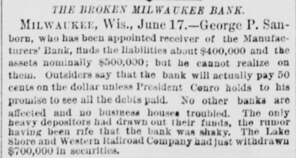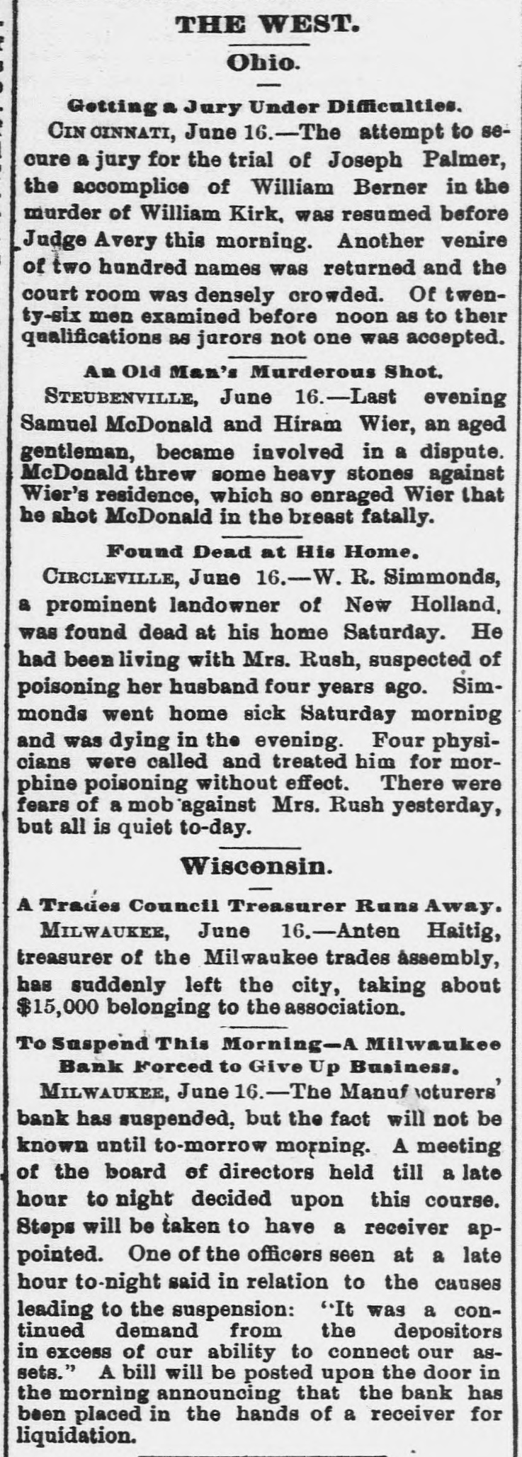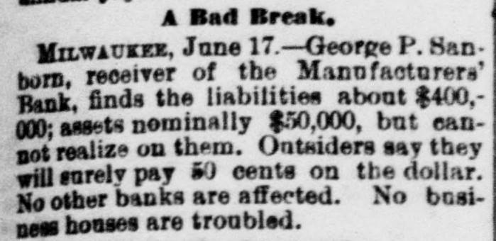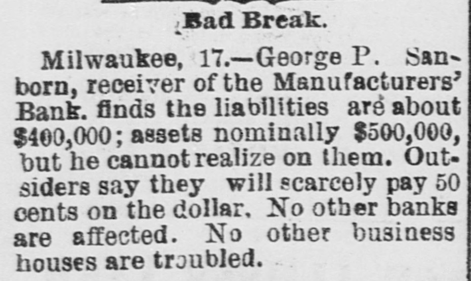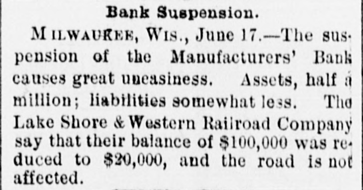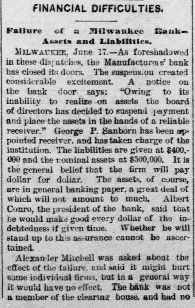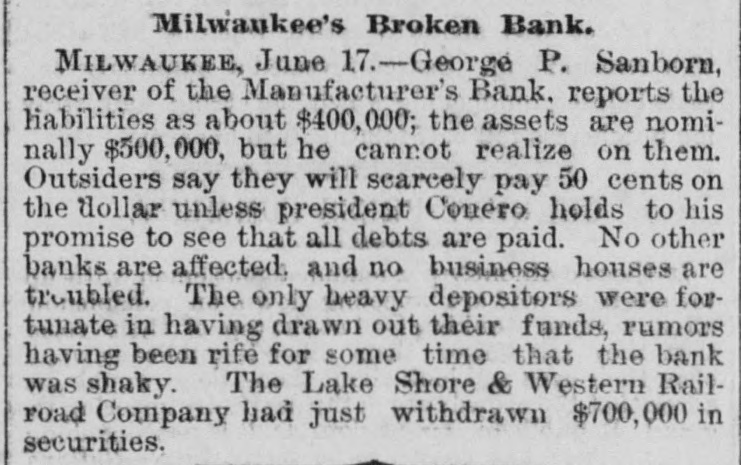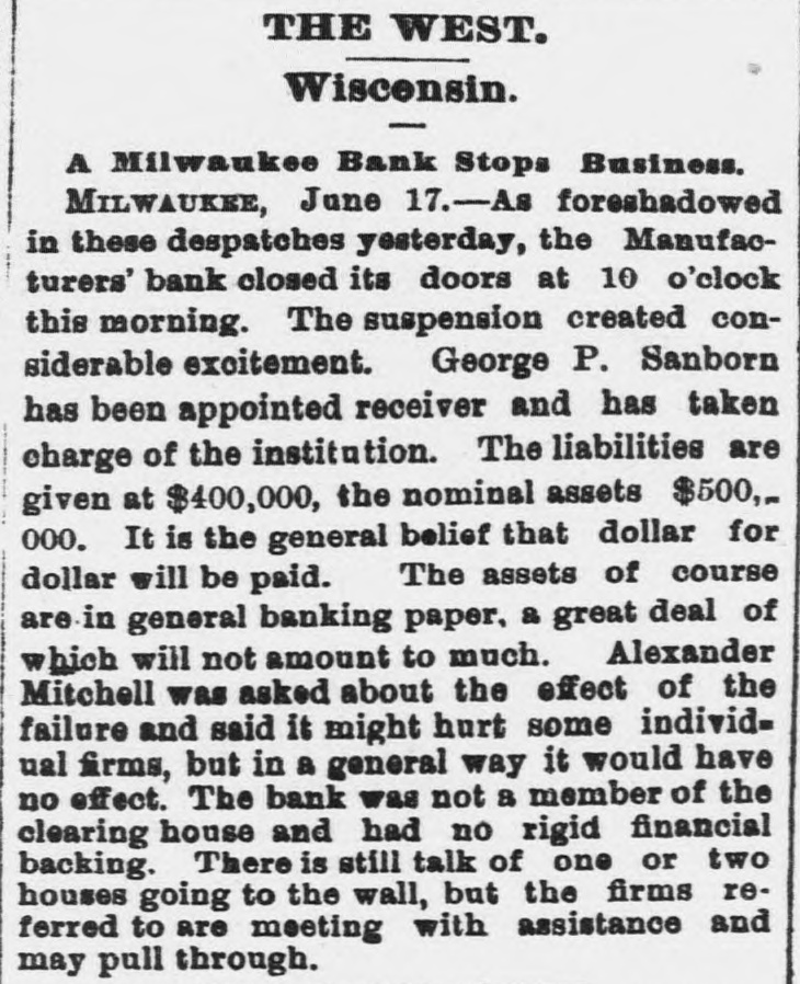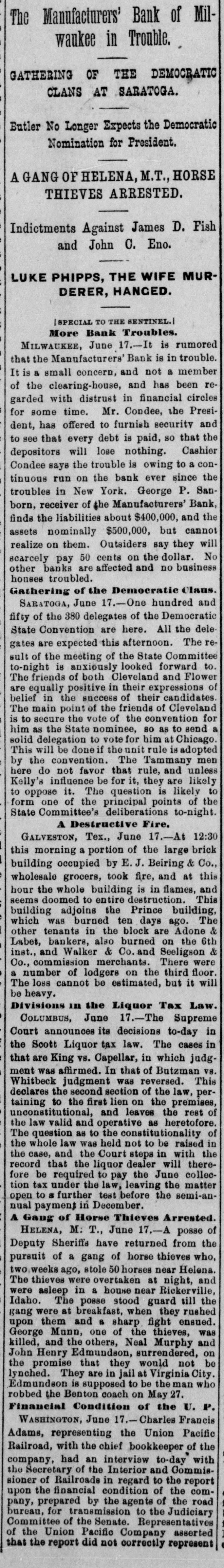 About 80 per cent. were those of small traders whose capital was less than $5,000. Among the suspensions announced were Carhart, Whitford & Co., wholesale clothing, Best & Co., children's clothing, Pearce & Hall, hat manufacturers, Fernandez & Costillo, shipping and commission, and Cornelius K. Garrison, capitalist, New York city; William H. Cooper, banker, Montrose, Pa.; Manufacturer's Bank, Milwaukee; Gidiere. Day & Co., Gardner & Copp, and Hunt, Stewart & Co., cotton commission, New Orleans; John Callaghan & Co., wholesale liquors, Louisville, Ky.; R. W. Emerson & Co., shoe manufacturers, Boston. In the principal trades they were as follows: General stores 26, grocers 22, clothing and cloth 13, shoes 9, dry goods 9, liquors 9, manufacturers 9, jewelry 7, produce, provisions, etc., 6, lumber and materials 6, hardware and agricultural implements 6. carpenters and builders 5, tobacco 5, cigars 5, milinery 5, paper, books, etc., 4, hotels and restaurants 4, fancy goods 4. carriages 4, drugs 4. cotton 3, grain and flour 3, hats 3, banks 2. bakers and confectioners 2, coal 2, furniture 2, shipping and commission 2. FLORIDA. Jacksonville.-H. Weiskopf, paints, offers to compromise. GEORGIA. Atlanta.-Pillsbury & Morgan, bottlers, receiver appointed. Marietta.-J. H. Barnes. shoes, closed by Sheriff. Liabilities $7,700; assets $5,000. Whitefield & Myers, groceries and hardware, failed. Liabilities about $1,200; assets $900. Rising Faren.-W. W. Gilbert, general store, closed by Sheriff. Savannah.-I. L. Dekle, general store, assigned to George J. Baldwin. Liabilities $7,700; nominal assets $8,400; actual assets about $4,000; preferences $3,750. S.J. Miller, grocer, assigned. SOUTH CAROLINA Columbia.-J. Wiley & Co., clothing, offer 50 cents. George's Station.-Abbott & Bro., general store, assigned to W H Rumpl. Liabilities, $486; nominal assets, $192. TENNESSEE. Bethel.-R. J. Hardy, general store. reported failed. Liabilities $2,500; nominal assets, $1,000; actual assets, $750. Memphis.-S. A. Bovle & Co., dry goods, failed. Liabilities $5,000; assets $2,500. C. (Mrs. L.) Loeb, general store, reported failed.