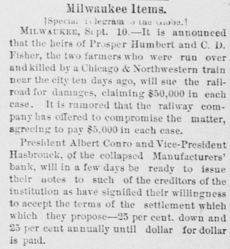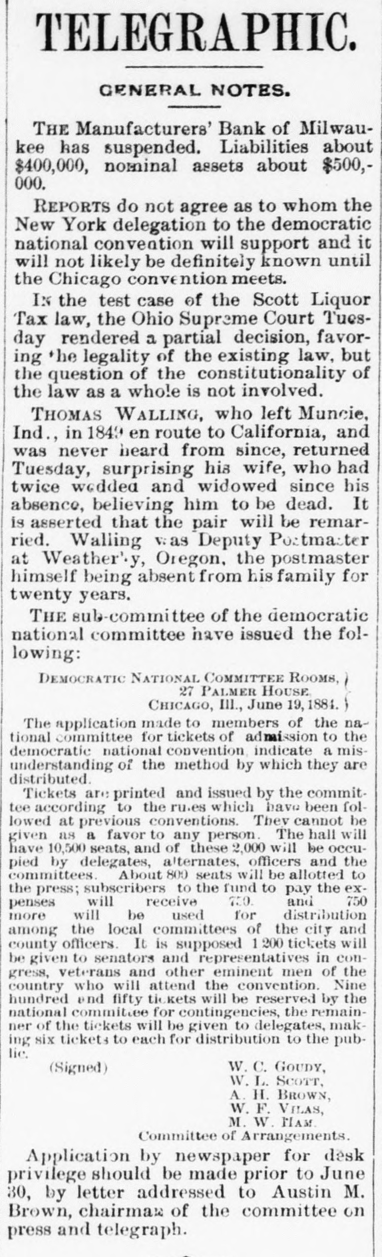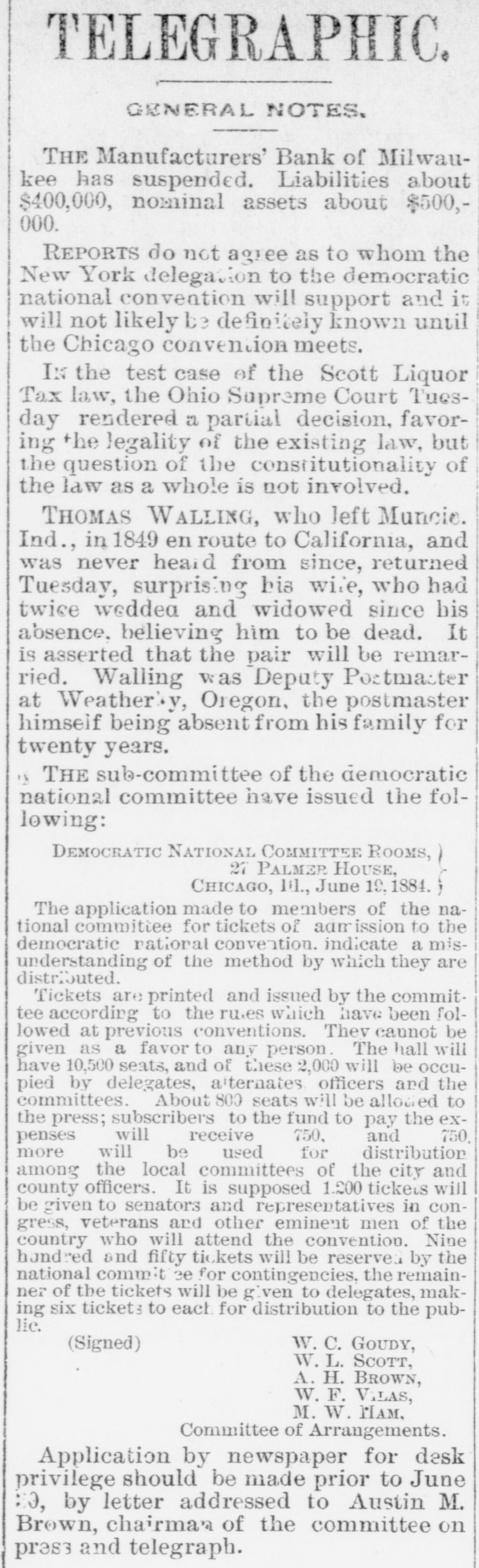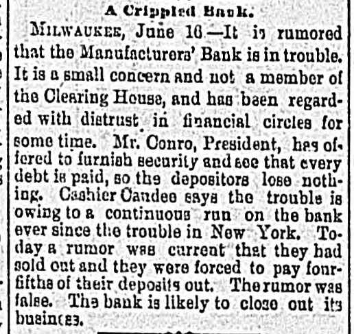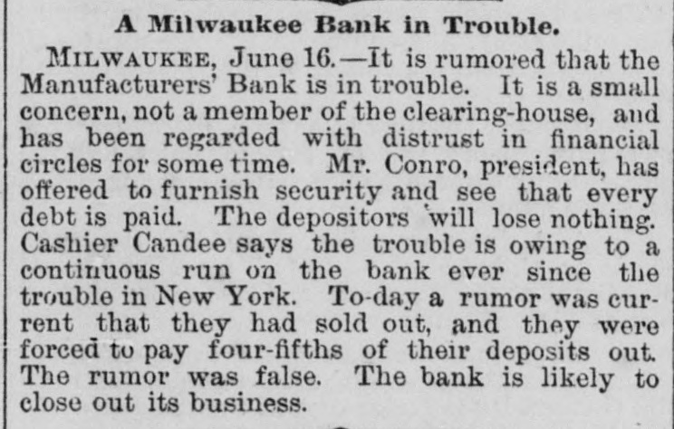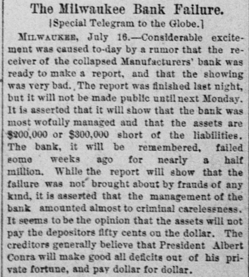 About 80 per cent. were those of small traders whose capital was less than $5,000. Among the suspensions announced were Carhart, Whitford & Co., wholesale clothing, Best & Co., children's clothing, Pearce & Hall, hat manufacturers, Fernandez & Costillo, shipping and commission, and Cornelius K. Garrison, capitalist, New York city; William H. Cooper, banker, Montrose, Pa.; Manufacturer's Bank, Milwaukee; Gidiere. Day & Co., Gardner & Copp, and Hunt, Stewart & Co., cotton commission, New Orleans; John Callaghan & Co., wholesale liquors, Louisville, Ky.; R. W. Emerson & Co., shoe manufacturers, Boston. In the principal trades they were as follows: General stores 26, grocers 22, clothing and cloth 13, shoes 9, dry goods 9, liquors 9, manufacturers 9, jewelry 7, produce, provisions, etc., 6, lumber and materials 6, hardware and agricultural implements 6. carpenters and builders 5, tobacco 5, cigars 5, milinery 5, paper, books, etc., 4, hotels and restaurants 4, fancy goods 4. carriages 4, drugs 4. cotton 3, grain and flour 3, hats 3, banks 2. bakers and confectioners 2, coal 2, furniture 2, shipping and commission 2. FLORIDA. Jacksonville.-H. Weiskopf, paints, offers to compromise. GEORGIA. Atlanta.-Pillsbury & Morgan, bottlers, receiver appointed. Marietta.-J. H. Barnes. shoes, closed by Sheriff. Liabilities $7,700; assets $5,000. Whitefield & Myers, groceries and hardware, failed. Liabilities about $1,200; assets $900. Rising Faren.-W. W. Gilbert, general store, closed by Sheriff. Savannah.-I. L. Dekle, general store, assigned to George J. Baldwin. Liabilities $7,700; nominal assets $8,400; actual assets about $4,000; preferences $3,750. S.J. Miller, grocer, assigned. SOUTH CAROLINA Columbia.-J. Wiley & Co., clothing, offer 50 cents. George's Station.-Abbott & Bro., general store, assigned to W H Rumpl. Liabilities, $486; nominal assets, $192. TENNESSEE. Bethel.-R. J. Hardy, general store. reported failed. Liabilities $2,500; nominal assets, $1,000; actual assets, $750. Memphis.-S. A. Bovle & Co., dry goods, failed. Liabilities $5,000; assets $2,500. C. (Mrs. L.) Loeb, general store, reported failed.