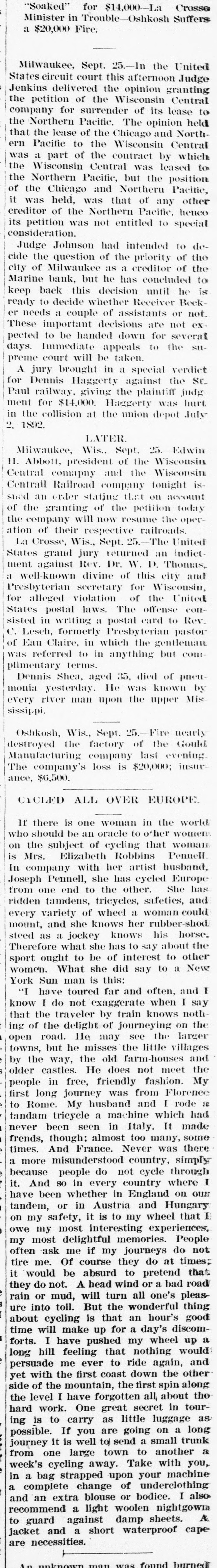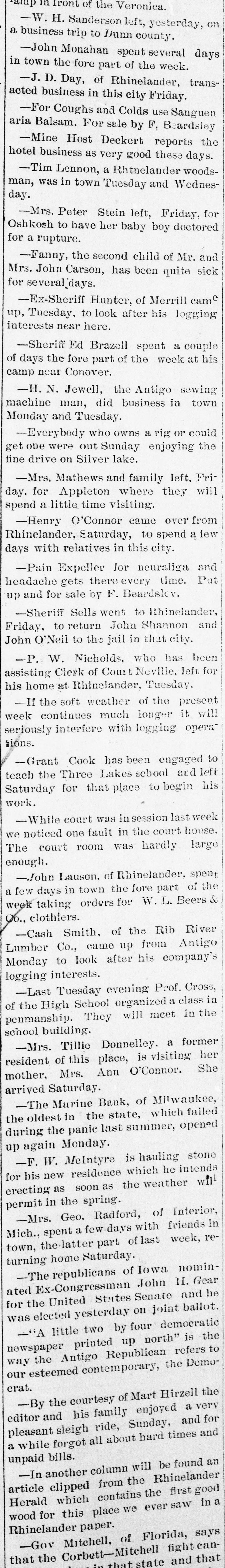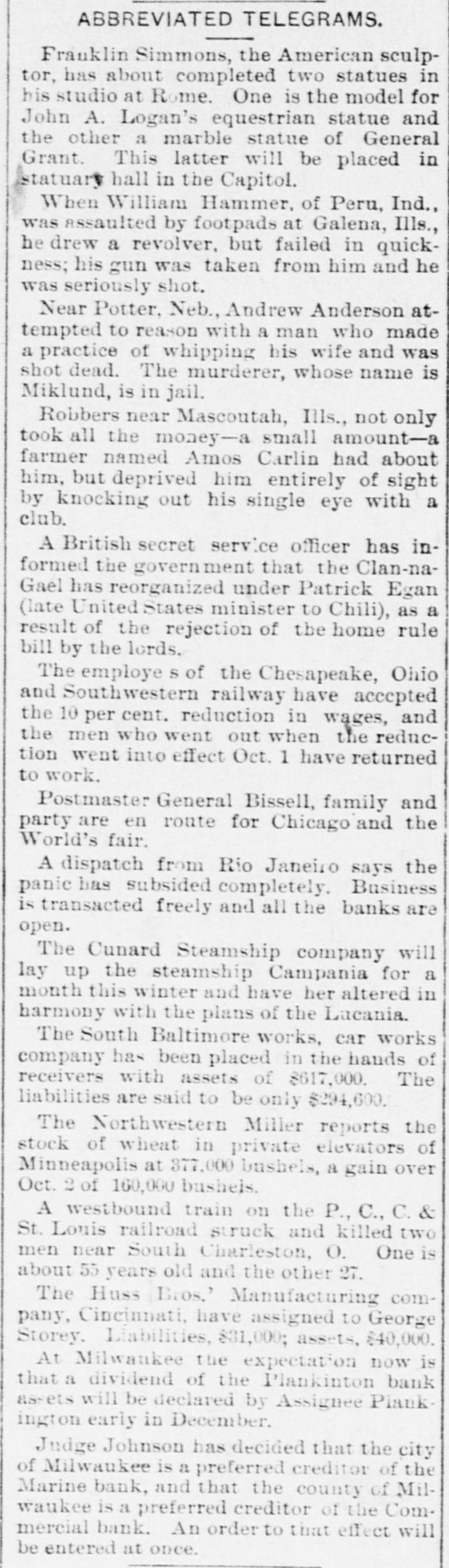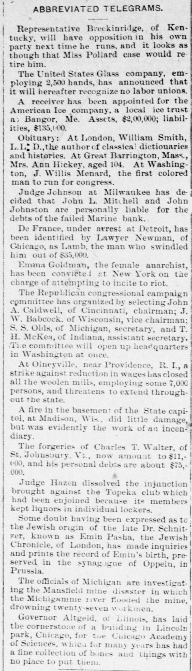 ABBREVIATED TELEGRAMS. Representative Breckinridge, of Kentucky, will have opposition in his own party next time he runs, and it looks as though that Miss Pollard case would retire him. The United States Glass company, employing 2,500 hands, has announced that it will hereafter recognize no labor unions. A receiver has been appointed for the American Ice company, a local ice trust a) Bangor, Me. Assets, $2,00,000; liabilities, $135,000. Obituary: At London, William Smith, L.L. D., the author of classical dictiouaries and histories. At Great Barrington, Mass., Mrs. Ann Hickey, aged 104. At Washington, J. Willis Menard, the first colored man to run for congress. Judge Johnson at Milwaukee has decided that John L. Mitchell and John Johnston are personally liable for the debts of the failed Marine bank. De France, under arrest at Detroit, has been identified by Lawyer Newman, of Chicago, as Lamb, the man who swindled him out of $35,000. Emma Goldman, the female anarchist, has been convicted at New York on the charge of attempting to incite to riot. The Republican congressional campaign committee has organized by selecting John A. Caldwell, of Cincinnati, chairman; J. W. Babcock. of Wisconsin, vice chairman; S.S. Olds, of Michigan, secretary, and T. H. McKea, of Indiana, assistant secretary. The committee will open up headquarters in Washington at once. At Olneyville, near Providence, R. I., a strike against reduction in wages has closed all the woolen mills, employing some 7,000 persons, and threatens to extend throughout the state. A fire in the basement of the State capitol, at Madison, Wis., did little damage, but was evidently the work of an incendiary. The forgeries of Charles T. Walter, of St. Johnsbury, Vt., now amount to $11,000, and his personal debts are about $75,000. Judge Hazen dissolved the injunction brought against the Topeka club which had been enjoined because its members kept liquors in individual lockers. Some doubt having been expressed as to the Jewish origin of the late Dr. Schnitzer, known as Emin Pasha, the Jewish Chronicle, of London, has made inquiries and prints the record of Emin's birth, preserved in the synagogue of Oppelu, in Prussia. The officials of Michigan are investigating the Mansfield mine disaster in which the Michigamme river flooded the mine, drowning twenty-seven workmen. Governor Altgeld, of Illinois, has laid the cornerstone of a building in Lincoln park, Chicago, for the Chicago Academy of Sciences, which for many years has had a fine collection of bones and things with no place to put them.