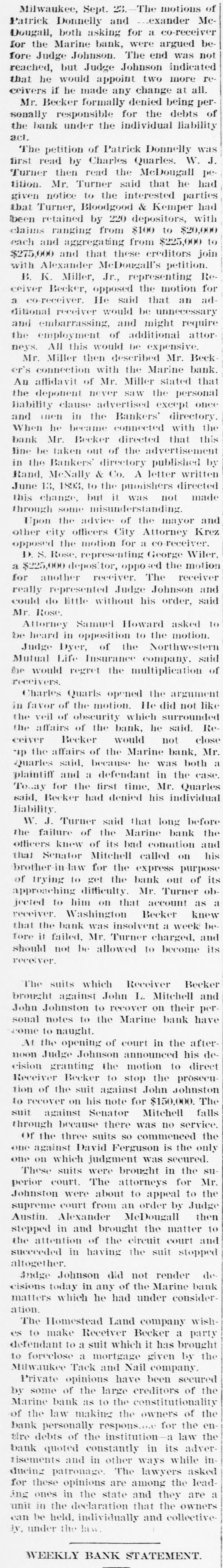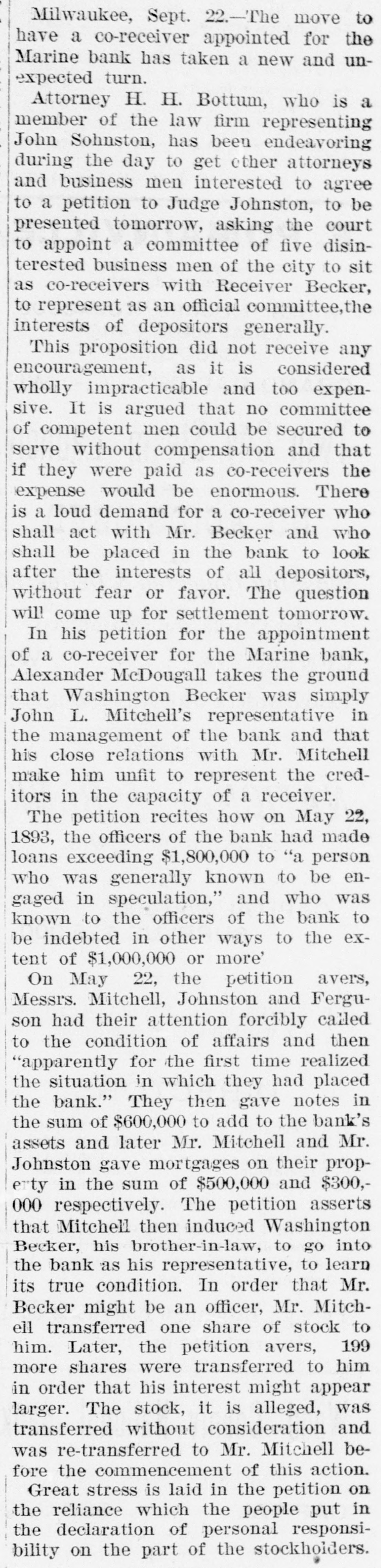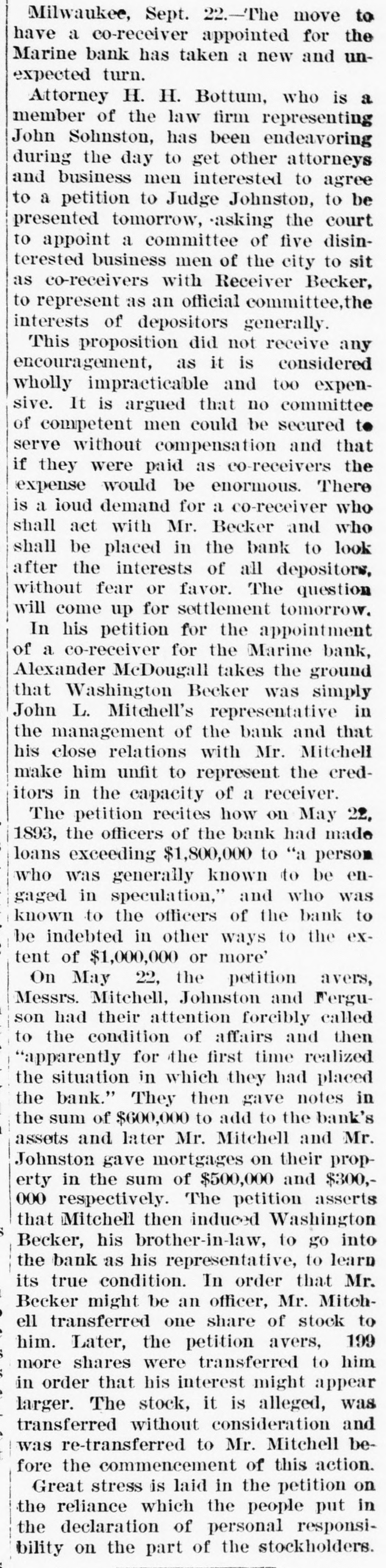 ABBREVIATED TELEGRAMS. Representative Breckinridge, of Kentucky, will have opposition in his own party next time he runs, and it looks as though that Miss Pollard case would retire him. The United States Glass company, employing 2,500 hands, has announced that it will hereafter recognize no labor unions. A receiver has been appointed for the American Ice company, a local ice trust a) Bangor, Me. Assets, $2,00,000; liabilities, $135,000. Obituary: At London, William Smith, L.L. D., the author of classical dictiouaries and histories. At Great Barrington, Mass., Mrs. Ann Hickey, aged 104. At Washington, J. Willis Menard, the first colored man to run for congress. Judge Johnson at Milwaukee has decided that John L. Mitchell and John Johnston are personally liable for the debts of the failed Marine bank. De France, under arrest at Detroit, has been identified by Lawyer Newman, of Chicago, as Lamb, the man who swindled him out of $35,000. Emma Goldman, the female anarchist, has been convicted at New York on the charge of attempting to incite to riot. The Republican congressional campaign committee has organized by selecting John A. Caldwell, of Cincinnati, chairman; J. W. Babcock. of Wisconsin, vice chairman; S.S. Olds, of Michigan, secretary, and T. H. McKea, of Indiana, assistant secretary. The committee will open up headquarters in Washington at once. At Olneyville, near Providence, R. I., a strike against reduction in wages has closed all the woolen mills, employing some 7,000 persons, and threatens to extend throughout the state. A fire in the basement of the State capitol, at Madison, Wis., did little damage, but was evidently the work of an incendiary. The forgeries of Charles T. Walter, of St. Johnsbury, Vt., now amount to $11,000, and his personal debts are about $75,000. Judge Hazen dissolved the injunction brought against the Topeka club which had been enjoined because its members kept liquors in individual lockers. Some doubt having been expressed as to the Jewish origin of the late Dr. Schnitzer, known as Emin Pasha, the Jewish Chronicle, of London, has made inquiries and prints the record of Emin's birth, preserved in the synagogue of Oppelu, in Prussia. The officials of Michigan are investigating the Mansfield mine disaster in which the Michigamme river flooded the mine, drowning twenty-seven workmen. Governor Altgeld, of Illinois, has laid the cornerstone of a building in Lincoln park, Chicago, for the Chicago Academy of Sciences, which for many years has had a fine collection of bones and things with no place to put them.