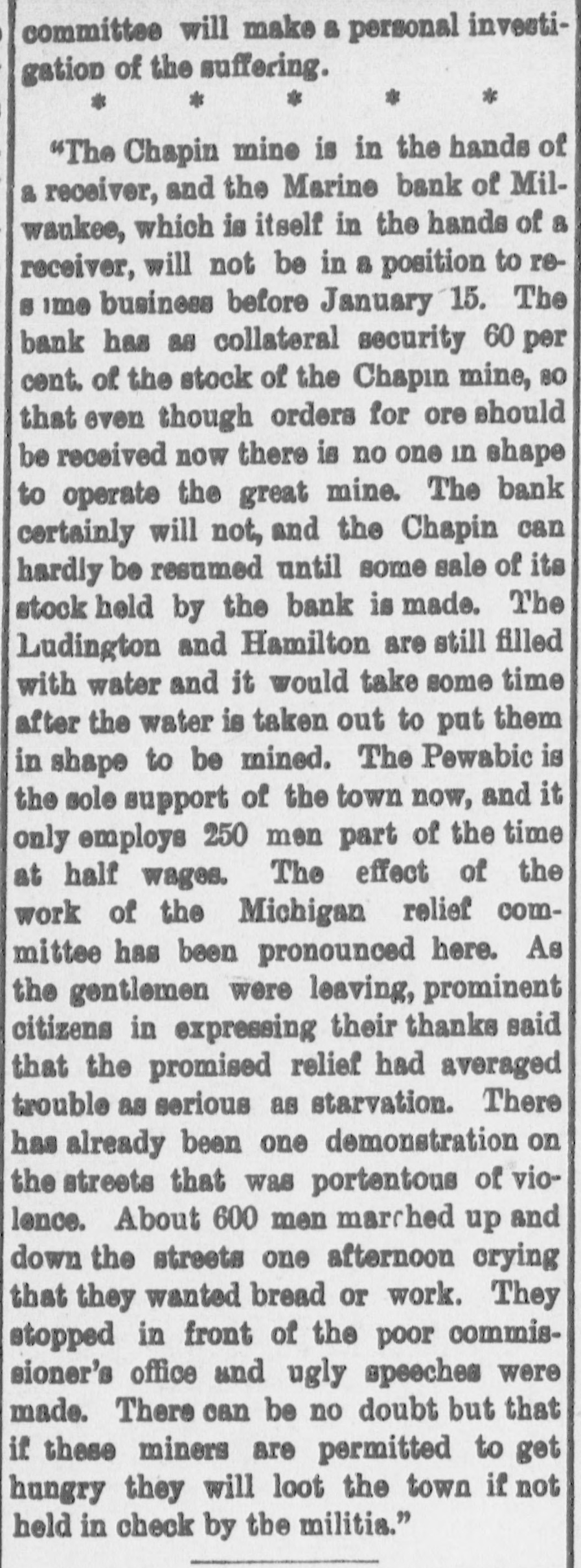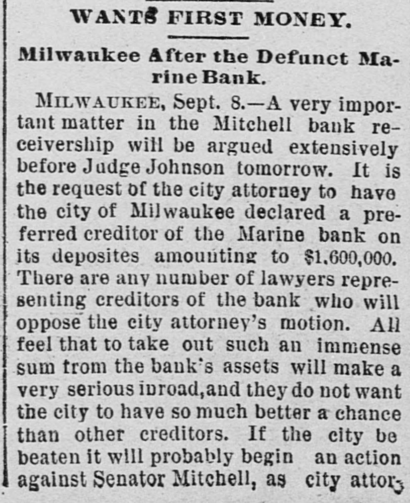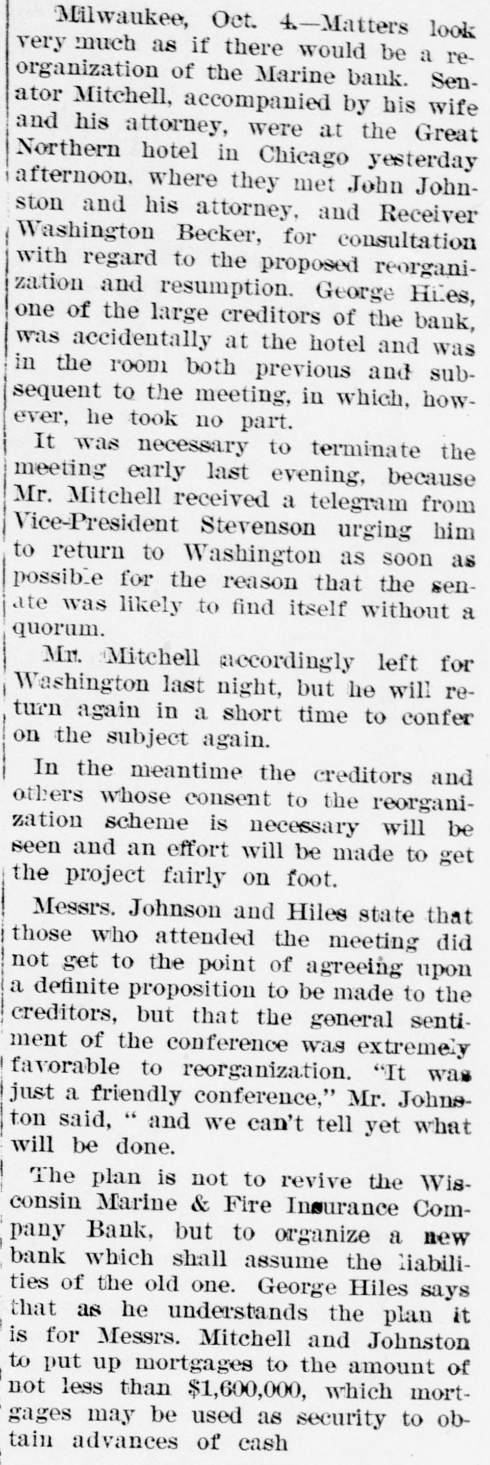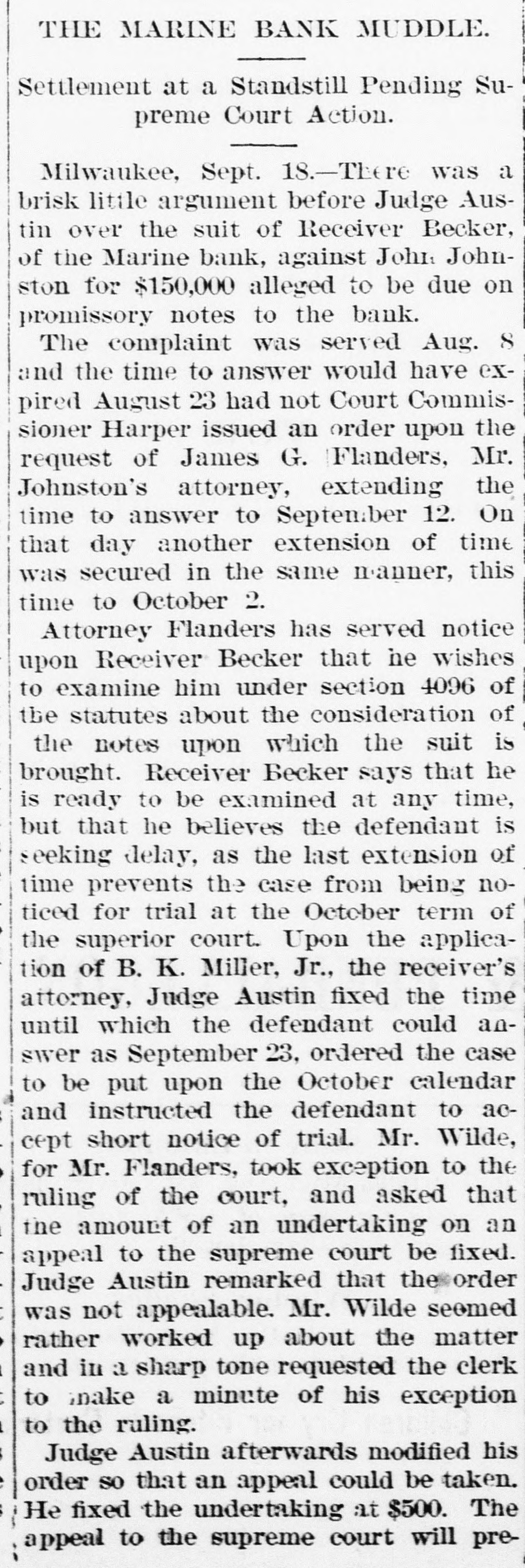 ABBREVIATED TELEGRAMS. Representative Breckinridge, of Kentucky, will have opposition in his own party next time he runs, and it looks as though that Miss Pollard case would retire him. The United States Glass company, employing 2,500 hands, has announced that it will hereafter recognize no labor unions. A receiver has been appointed for the American Ice company, a local ice trust a) Bangor, Me. Assets, $2,00,000; liabilities, $135,000. Obituary: At London, William Smith, L.L. D., the author of classical dictiouaries and histories. At Great Barrington, Mass., Mrs. Ann Hickey, aged 104. At Washington, J. Willis Menard, the first colored man to run for congress. Judge Johnson at Milwaukee has decided that John L. Mitchell and John Johnston are personally liable for the debts of the failed Marine bank. De France, under arrest at Detroit, has been identified by Lawyer Newman, of Chicago, as Lamb, the man who swindled him out of $35,000. Emma Goldman, the female anarchist, has been convicted at New York on the charge of attempting to incite to riot. The Republican congressional campaign committee has organized by selecting John A. Caldwell, of Cincinnati, chairman; J. W. Babcock. of Wisconsin, vice chairman; S.S. Olds, of Michigan, secretary, and T. H. McKea, of Indiana, assistant secretary. The committee will open up headquarters in Washington at once. At Olneyville, near Providence, R. I., a strike against reduction in wages has closed all the woolen mills, employing some 7,000 persons, and threatens to extend throughout the state. A fire in the basement of the State capitol, at Madison, Wis., did little damage, but was evidently the work of an incendiary. The forgeries of Charles T. Walter, of St. Johnsbury, Vt., now amount to $11,000, and his personal debts are about $75,000. Judge Hazen dissolved the injunction brought against the Topeka club which had been enjoined because its members kept liquors in individual lockers. Some doubt having been expressed as to the Jewish origin of the late Dr. Schnitzer, known as Emin Pasha, the Jewish Chronicle, of London, has made inquiries and prints the record of Emin's birth, preserved in the synagogue of Oppelu, in Prussia. The officials of Michigan are investigating the Mansfield mine disaster in which the Michigamme river flooded the mine, drowning twenty-seven workmen. Governor Altgeld, of Illinois, has laid the cornerstone of a building in Lincoln park, Chicago, for the Chicago Academy of Sciences, which for many years has had a fine collection of bones and things with no place to put them.