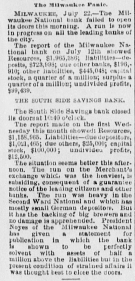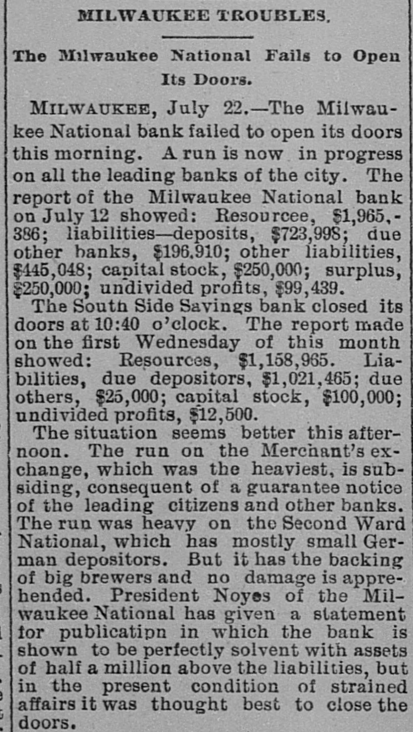 MILWAUKEE TROUBLES, The Milwaukee National Fails to Open Its Doors. MILWAUKEE, July 22.-The Milwaukee National bank failed to open its doors this morning. A run is now in progress on all the leading banks of the city. The report of the Milwaukee National bank on July 12 showed: Resourcee, $1,965,386; liabilities-deposits, $723,998; due other hanks, $196,910; other liabilities, $445,048; capital stock, $250,000; surplus, $250,000; undivided profits, $99,439. The South Side Savings bank closed its doors at 10:40 o'clock. The report made on the first Wednesday of this month showed: Resources, $1,158,965. Liabilities, due depositors, $1,021,465; due others, $25,000; capital stock, $100,000; undivided profits, $12,500. The situation seems better this afternoon. The run on the Merchant's exchange, which was the heaviest, is subsiding, consequent of a guarantee notice of the leading citizens and other banks. The run was heavy on the Second Ward National, which has mostly small German depositors. But it has the backing of big brewers and no damage is apprehended. President Noyes of the Milwaukee National has given a statement for publication in which the bank is shown to be perfectly solvent with assets of half a million above the liabilities, but in the present condition of strained affairs it was thought best to close the doors.