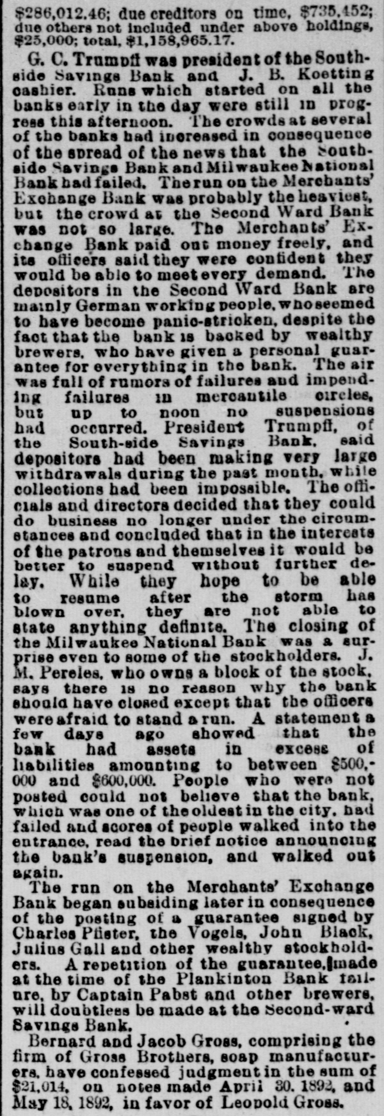 $286,012.46; due creditors on time, $735,452; due others not included under above holdings, $25,000; total, $1,158,965.17. G. C. Trumpff was president of the Southside Savings Bank and J. B. Koetting cashier. Runs which started on all the banks early in the day were still in progress this afternoon. The crowds at several of the banks had increased in consequence of the spread of the news that the Southside Savings Bank and Mil waukee National Bank had failed. Therun on the Merchants' Exchange Bank was probably the heaviest, but the crowd at the Second Ward Bank was not so large. The Merchants' Exchange Bank paid out money freely, and its officers said they were confident they would be able to meet every demand. The depositors in the Second Ward Bank are mainly German working people, whoseemed to have become panio-stricken, despite the fact that the bank 18 backed by wealthy brewers, who have given a personal guarantee for everything in the bank. The air was full of rumors of failures and impending failures in mercantile circles, but up to noon no suspensions had occurred. President Trumpff, of the South-side Savings Bank. said depositors had been making very large withdrawals during the past month. while collections had been impossible. The officials and directors decided that they could do business no longer under the circumstances and concluded that in the interests of the patrons and themselves it would be better to suspend without further delay. While they hope to be able to resume after the storm has blown over, they are not able to state anything definite. The closing of the Milwaukee National Bank was a surprise even to some of the stockholders. J. M. Pereles, who owns a block of the stock. says there 18 no reason why the bank should have closed except that the officers vereafraid to stand a run. A statement a few days ago showed that the bank had assets in excess of liabilities amounting to between $500,000 and $600,000. People who were not posted could not believe that the bank, which was one of the oldest in the city. had failed and scores of people walked into the entrance, read the brief notice announcing the bank's suspension, and walked out again. The run on the Merchants' Exchange Bank began subsiding later in consequence of the posting of a guarantee signed by Charles Pfister, the Vogels, John Black, Julius Gall and other wealthy stockholders. A repetition of the guarantee, made at the time of the Plankinton Bank tailare, by Captain Pabst and other brewers, will doubtlees be made at the Second-ward Savings Bank. Bernard and Jacob Gross, comprising the firm of Gross Brothers, soap manufacturers. have confessed judgment in the sum of $21,014. on notes made April 30. 1892, and May 18,1892, in favor of Leopold Gross.