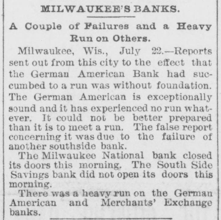 MILWAUKEE'S BANKS. A Couple of Failures and a Heavy Run on Others. Milwaukee, Wis., July 22.-Reports sent out from this city to the effect that the German American Bank had succumbed to a run was without foundation. The German American is exceptionally sound and it has experienced no run whatever. It could not be better prepared than it is to meet a run. The false report concerning it was due to the failure of another southside bank. The Milwaukee National bank closed its doors this morning, The South Side Savings bank did not open its doors this morning. There was a heavy run on the German American and Merchants' Exchange banks.