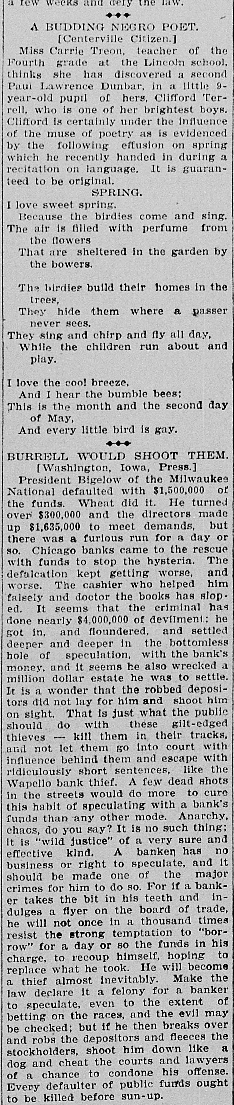 # A BUDDING NEGRO POET. [Centerville Citizen.] Miss Carrie Treon, teacher of the Fourth grade at the Lincoln school, thinks she has discovered a second Paui Lawrence Dunbar, in a little 9-year-old pupil of hers, Clifford Terrell, who is one of her brightest boys. Clifford is certainly under the influence of the muse of poetry as is evidenced by the following effusion on spring which he recently handed in during a recitation on language. It is guaranteed to be original. SPRING. I love sweet spring. Because the birdies come and sing. The air is filled with perfume from the flowers That are sheltered in the garden by the bowers. The birdies build their homes in the trees, They hide them where a passer never sees. They sing and chirp and fly all day, While the children run about and play. I love the cool breeze, And I hear the bumble bees; This is the month and the second day of May, And every little bird is gay. # BURRELL WOULD SHOOT THEM. [Washington, Iowa, Press.] President Bigelow of the Milwaukee National defaulted with $1,500,000 of the funds. Wheat did it. He turned over $300,000 and the directors made up $1,635,000 to meet demands, but there was a furious run for a day or so. Chicago banks came to the rescue with funds to stop the hysteria. The defalcation kept getting worse, and worse. The cashier who helped him falsely and doctor the books has sloped. It seems that the criminal has done nearly $4,000,000 of devilment; he got in, and floundered, and settled deeper and deeper in the bottonless hole of speculation, with the bank's money, and it seems he also wrecked a million dollar estate he was to settle. It is a wonder that the robbed depositors did not lay for him and shoot him on sight. That is just what the public should do with these gilt-edged thieves — kill them in their tracks, and not let them go into court with influence behind them and escape with ridiculously short sentences, like the Wapello bank thief. A few dead shots in the streets would do more to cure this habit of speculating with a bank's funds than any other mode. Anarchy, chaos, do you say? It is no such thing; it is "wild justice" of a very sure and effective kind. A banken has no business or right to speculate, and it should be made one of the major crimes for him to do so. For if a banker takes the bit in his teeth and indulges a flyer on the board of trade, he will not once in a thousand times resist the strong temptation to "borrow" for a day or so the funds in his charge, to recoup himself, hoping to replace what he took. He will become a thief almost inevitably. Make the law declare it a felony for a banker to speculate, even to the extent of betting on the races, and the evil may be checked; but if he then breaks over and robs the depositors and fleeces the stockholders, shoot him down like a dog and cheat the courts and lawyers of a chance to condone his offense. Every defaulter of public funds ought to be killed before sun-up.