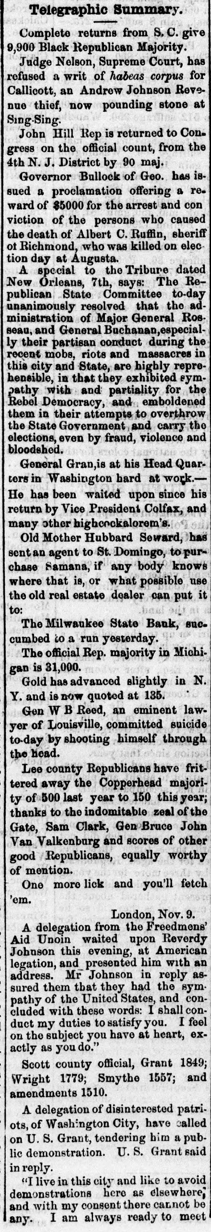 Telegraphic Summary. Complete returns from S. C. give 9,900 Black Republican Majority. Judge Nelson, Supreme Court, has refused a writ of habeas corpus for Callicott, an Andrew Johnson Revenue thief, now pounding stone at Sing-Sing. John Hill Rep is returned to Congress on the official count, from the 4th N. J. District by 90 maj. Governor Bullock of Geo. has issued a proclamation offering a reward of $5000 for the arrest and con viction of the persons who caused the death of Albert C. Ruffin, sheriff of Richmond, who was killed on election day at Augusta. A special to the Tribure dated New Orleans, 7th, says: The Republican State Committee to-day unanimously resolved that the administration of Major General Rosseau, and General Buchanan,especially their partisan conduct during the recent mobs, riots and massacres in this city and State, are highly reprehensible, in that they exhibited sympathy with and partiality for the Rebel Democracy, and emboldened them in their attempts to overthrow the State Government and carry the elections, even by fraud, violence and bloodshed. General Gran,is at his Head Quarters in Washington hard at work.He has been waited upon since his return by Vice President Colfax, and many other highcockalorem's. Old Mother Hubbard Seward, has sent an agent to St. Domingo, to purchase Samana, if any body knows where that is, or what possible use the old real estate dealer can put it to: The Milwaukee State Bank, succumbed to a run yesterday. The official Rep. majority in Michigan is 31,000. Gold has advanced slightly in N. Y. and is now quoted at 135. Gen W B Reed, an eminent lawyer of Louisville, committed suicide to-day by shooting himself through the head. Lee county Republicans have frittered away the Copperhead majority of 500 last year to 150 this year; thanks to the indomitable zeal of the Gate, Sam Clark, Gen Bruce John Van Valkenburg and scores of other good Republicans, equally worthy of mention. One more lick and you'll fetch 'em. London, Nov. 9. A delegation from the Freedmens' Aid Unoin waited upon Reverdy Johnson this evening, at American legation, and presented him with an address. Mr Johnson in reply assured them that they had the sym. pathy of the United States, and concluded with these words: I shall conduct my duties to satisfy you. I feel on the subject you have at heart, exactly as you do." Scott county official, Grant 1849; Wright 1779; Smythe 1557; and amendments 1510. A delegation of disinterested patriots, of Washington City, have called on U. S. Grant, tendering him a public demonstration. U.S. Grant said in reply. "I live in this city and like to avoid demonstrations here as elsewhere; and with my consent there cannot be any. I am always ready to meet