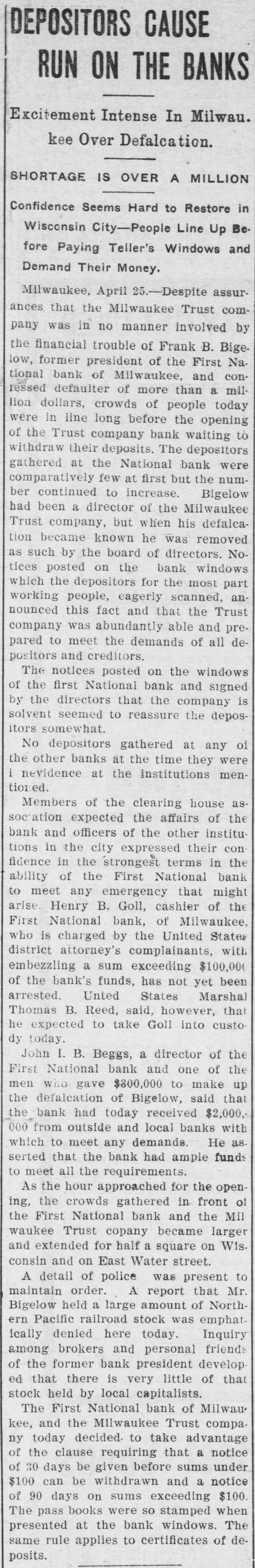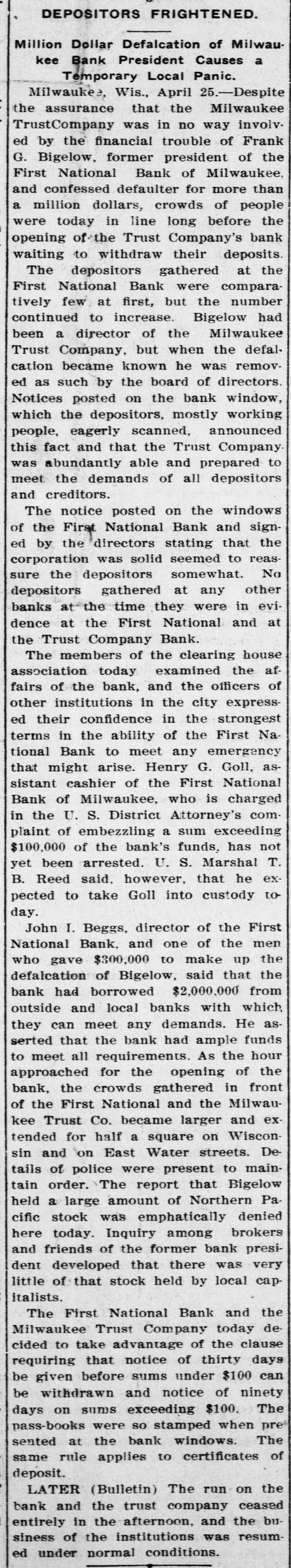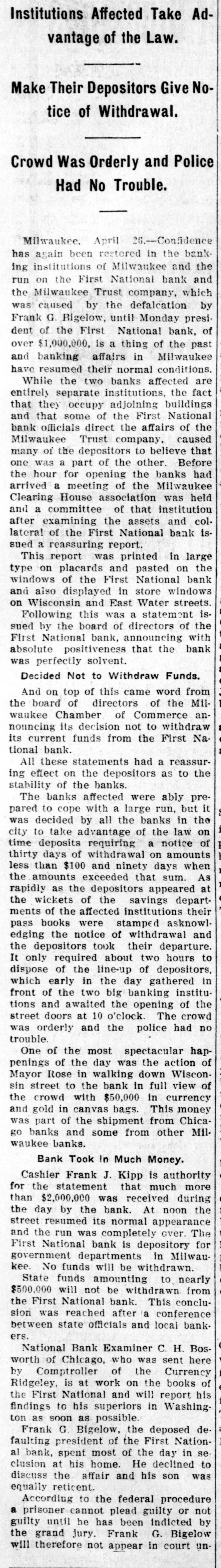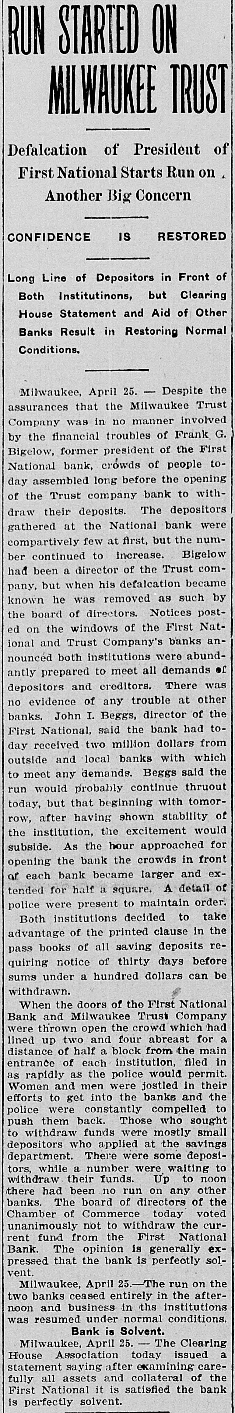 RUN STARTED ON MILWAUKEE TRUST Defalcation of President of First National Starts Run on Another Big Concern IS RESTORED CONFIDENCE Long Line of Depositors in Front of Both Institutinons, but Clearing House Statement and Aid of Other Banks Result in Restoring Normal Conditions. Milwaukee, April 25. - Despite the assurances that the Milwaukee Trust Company was in no manner involved by the financial troubles of Frank G. Bigelow, former president of the First National bank, crowds of people today assembled long before the opening of the Trust company bank to withdraw their deposits. The depositors gathered at the National bank were compartively few at first, but the number continued to increase. Bigelow had been a director of the Trust company, but when his defalcation became known he was removed as such by the board of directors. Notices posted on the windows of the First National and Trust Company's banks announced both institutions were abundantly prepared to meet all demands of depositors and creditors. There was no evidence of any trouble at other banks. John I. Beggs, director of the First National, said the bank had today received two million dollars from outside and local banks with which to meet any demands. Beggs said the run would probably continue thruout today, but that beginning with tomorrow, after having shown stability of the institution, the excitement would subside. As the hour approached for opening the bank the crowds in front of each bank became larger and extended for half a square. A detail of present maintain order. police were to Both institutions decided to take advantage of the printed clause in the pass books of all saving deposits requiring notice of thirty days before sums under a hundred dollars can be withdrawn. When the doors of the First National Bank and Milwaukee Trust Company were thrown open the crowd which had lined up two and four abreast for a distance of half a block from the main entrance of each institution, filed in as rapidly as the police would permit. Women and men were jostled in their into the were to efforts police to get constantly the banks compelled who and push them back. Those sought to withdraw funds were mostly small depositors who applied at the savings There were some while a were to department. tors, number waiting deposiwithdraw their funds. Up to noon there had been no run on any other banks. The board of directors of the Chamber of Commerce today voted unanimously not to withdraw the current fund from the First National Bank. The opinion is generally expressed that the bank is perfectly solvent. Milwaukee, April 25.-The run on the two banks ceased entirely in the afternoon and business in ths institutions was resumed under normal conditions. Bank is Solvent. Milwaukee, April 25. - The Clearing House Association today issued a statement saying after examining carefully all assets and collateral of the First National it is satisfied the bank is perfectly solvent.