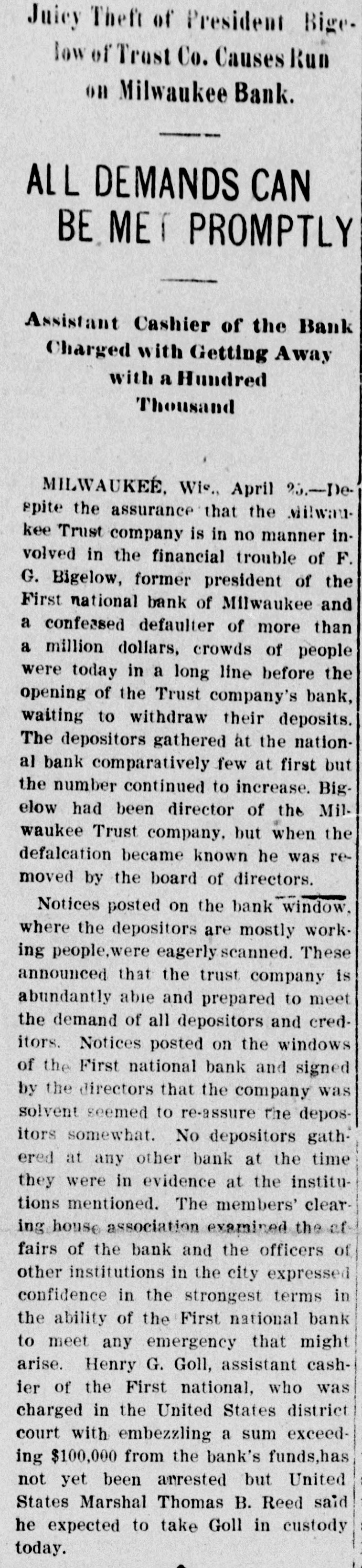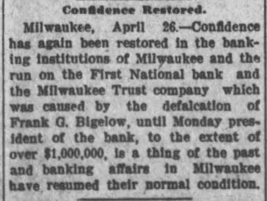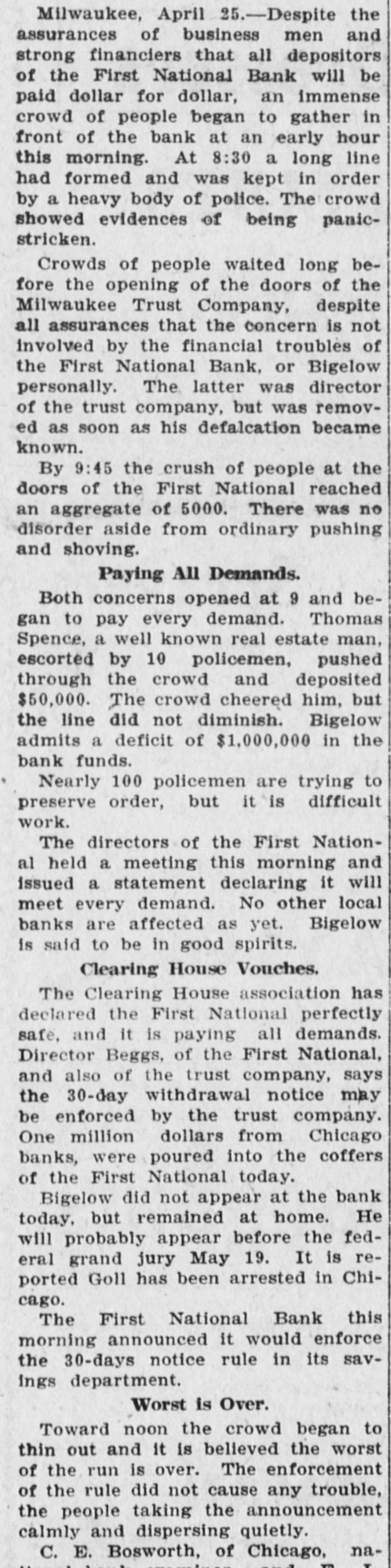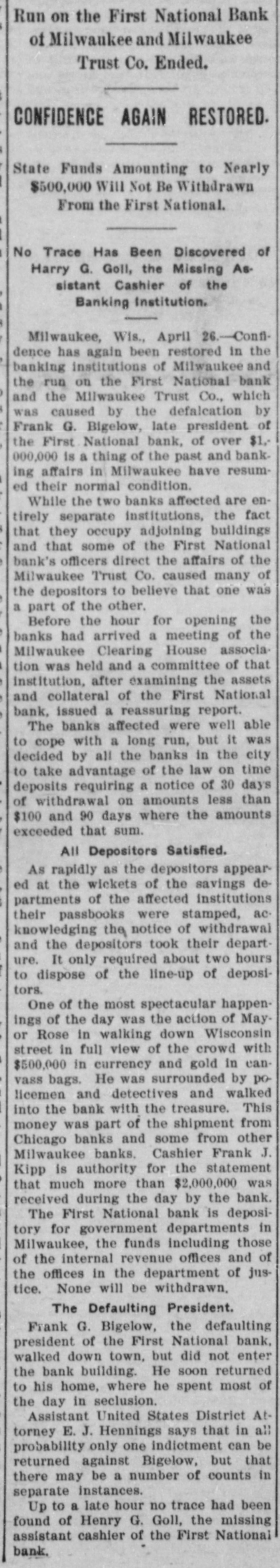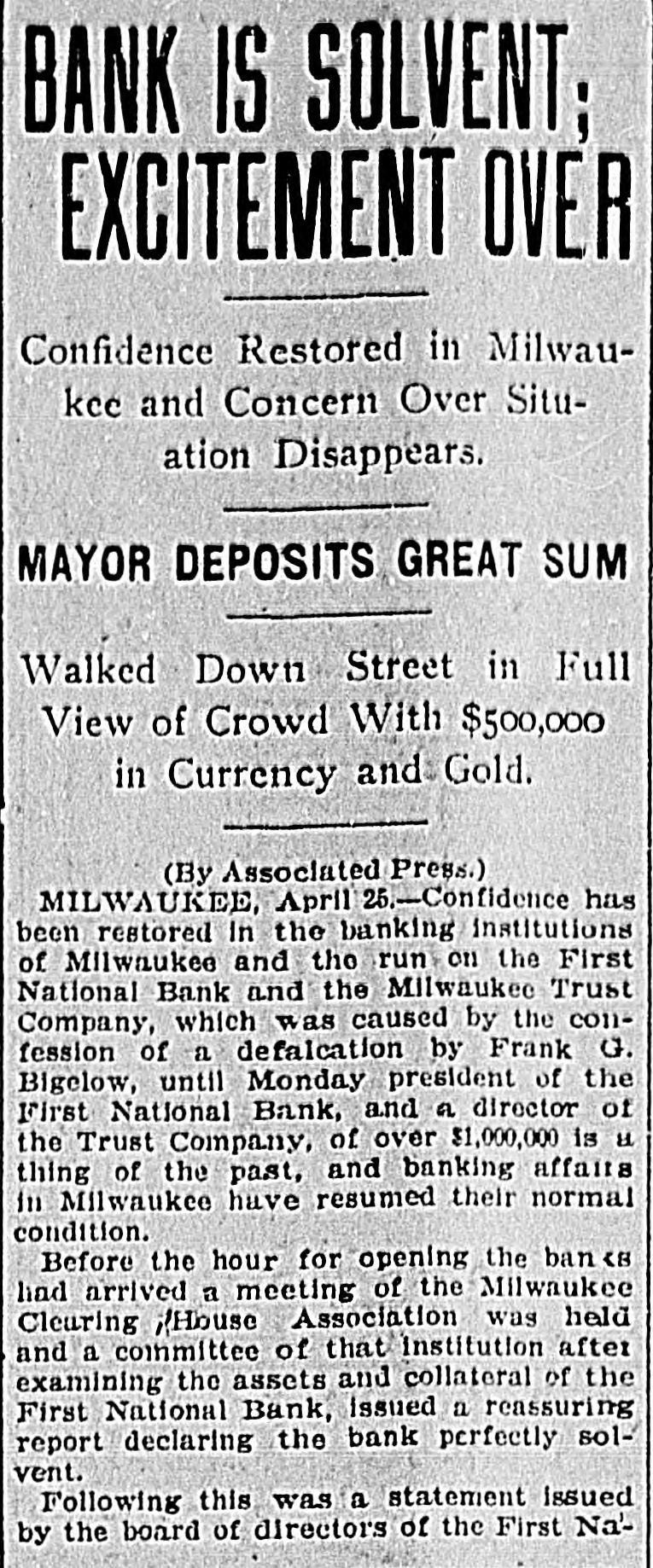 RUN STARTED ON MILWAUKEE TRUST Defalcation of President of First National Starts Run on Another Big Concern IS RESTORED CONFIDENCE Long Line of Depositors in Front of Both Institutinons, but Clearing House Statement and Aid of Other Banks Result in Restoring Normal Conditions. Milwaukee, April 25. - Despite the assurances that the Milwaukee Trust Company was in no manner involved by the financial troubles of Frank G. Bigelow, former president of the First National bank, crowds of people today assembled long before the opening of the Trust company bank to withdraw their deposits. The depositors gathered at the National bank were compartively few at first, but the number continued to increase. Bigelow had been a director of the Trust company, but when his defalcation became known he was removed as such by the board of directors. Notices posted on the windows of the First National and Trust Company's banks announced both institutions were abundantly prepared to meet all demands of depositors and creditors. There was no evidence of any trouble at other banks. John I. Beggs, director of the First National, said the bank had today received two million dollars from outside and local banks with which to meet any demands. Beggs said the run would probably continue thruout today, but that beginning with tomorrow, after having shown stability of the institution, the excitement would subside. As the hour approached for opening the bank the crowds in front of each bank became larger and extended for half a square. A detail of present maintain order. police were to Both institutions decided to take advantage of the printed clause in the pass books of all saving deposits requiring notice of thirty days before sums under a hundred dollars can be withdrawn. When the doors of the First National Bank and Milwaukee Trust Company were thrown open the crowd which had lined up two and four abreast for a distance of half a block from the main entrance of each institution, filed in as rapidly as the police would permit. Women and men were jostled in their into the were to efforts police to get constantly the banks compelled who and push them back. Those sought to withdraw funds were mostly small depositors who applied at the savings There were some while a were to department. tors, number waiting deposiwithdraw their funds. Up to noon there had been no run on any other banks. The board of directors of the Chamber of Commerce today voted unanimously not to withdraw the current fund from the First National Bank. The opinion is generally expressed that the bank is perfectly solvent. Milwaukee, April 25.-The run on the two banks ceased entirely in the afternoon and business in ths institutions was resumed under normal conditions. Bank is Solvent. Milwaukee, April 25. - The Clearing House Association today issued a statement saying after examining carefully all assets and collateral of the First National it is satisfied the bank is perfectly solvent.