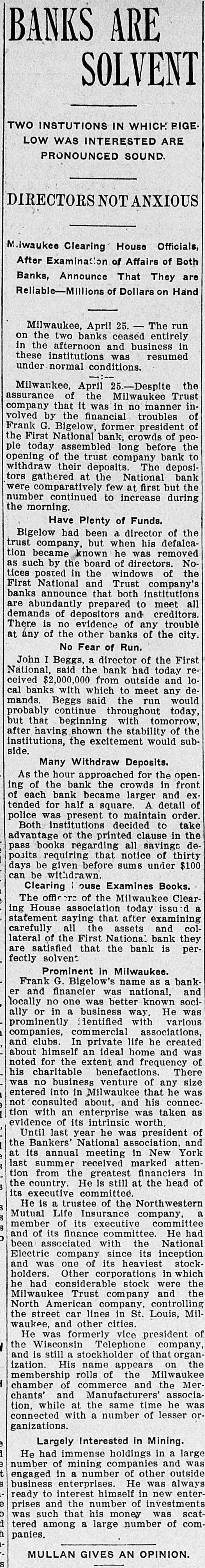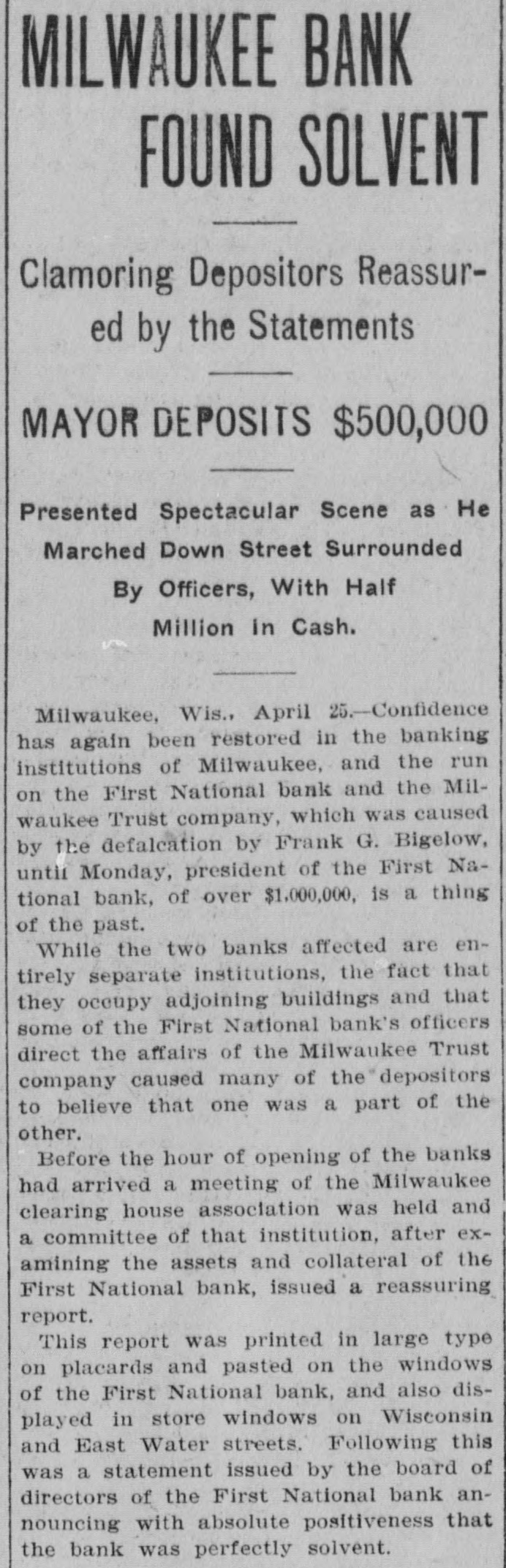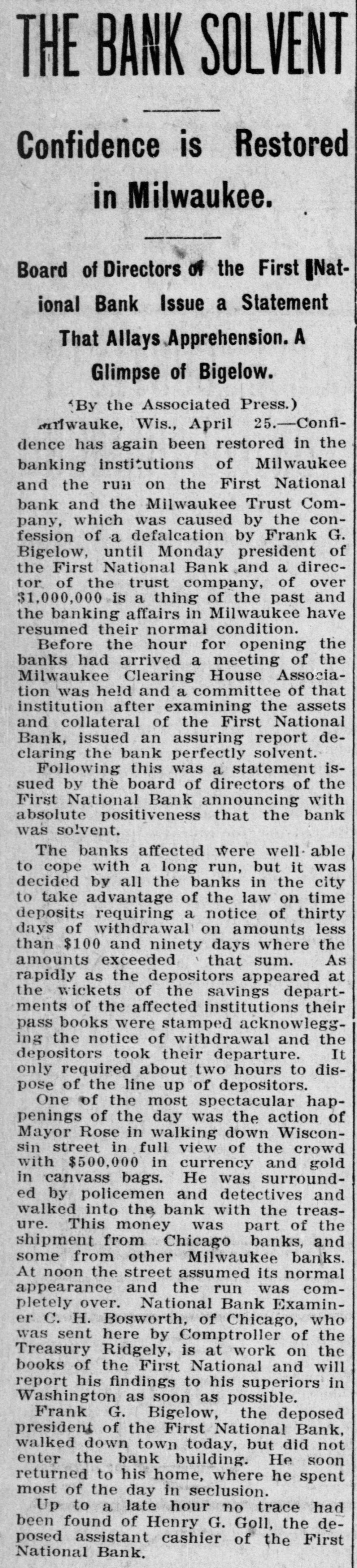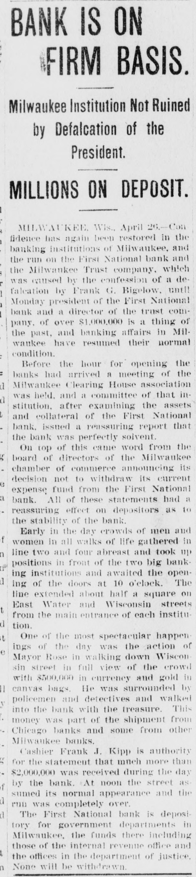 RUN STARTED ON MILWAUKEE TRUST Defalcation of President of First National Starts Run on Another Big Concern IS RESTORED CONFIDENCE Long Line of Depositors in Front of Both Institutinons, but Clearing House Statement and Aid of Other Banks Result in Restoring Normal Conditions. Milwaukee, April 25. - Despite the assurances that the Milwaukee Trust Company was in no manner involved by the financial troubles of Frank G. Bigelow, former president of the First National bank, crowds of people today assembled long before the opening of the Trust company bank to withdraw their deposits. The depositors gathered at the National bank were compartively few at first, but the number continued to increase. Bigelow had been a director of the Trust company, but when his defalcation became known he was removed as such by the board of directors. Notices posted on the windows of the First National and Trust Company's banks announced both institutions were abundantly prepared to meet all demands of depositors and creditors. There was no evidence of any trouble at other banks. John I. Beggs, director of the First National, said the bank had today received two million dollars from outside and local banks with which to meet any demands. Beggs said the run would probably continue thruout today, but that beginning with tomorrow, after having shown stability of the institution, the excitement would subside. As the hour approached for opening the bank the crowds in front of each bank became larger and extended for half a square. A detail of present maintain order. police were to Both institutions decided to take advantage of the printed clause in the pass books of all saving deposits requiring notice of thirty days before sums under a hundred dollars can be withdrawn. When the doors of the First National Bank and Milwaukee Trust Company were thrown open the crowd which had lined up two and four abreast for a distance of half a block from the main entrance of each institution, filed in as rapidly as the police would permit. Women and men were jostled in their into the were to efforts police to get constantly the banks compelled who and push them back. Those sought to withdraw funds were mostly small depositors who applied at the savings There were some while a were to department. tors, number waiting deposiwithdraw their funds. Up to noon there had been no run on any other banks. The board of directors of the Chamber of Commerce today voted unanimously not to withdraw the current fund from the First National Bank. The opinion is generally expressed that the bank is perfectly solvent. Milwaukee, April 25.-The run on the two banks ceased entirely in the afternoon and business in ths institutions was resumed under normal conditions. Bank is Solvent. Milwaukee, April 25. - The Clearing House Association today issued a statement saying after examining carefully all assets and collateral of the First National it is satisfied the bank is perfectly solvent.