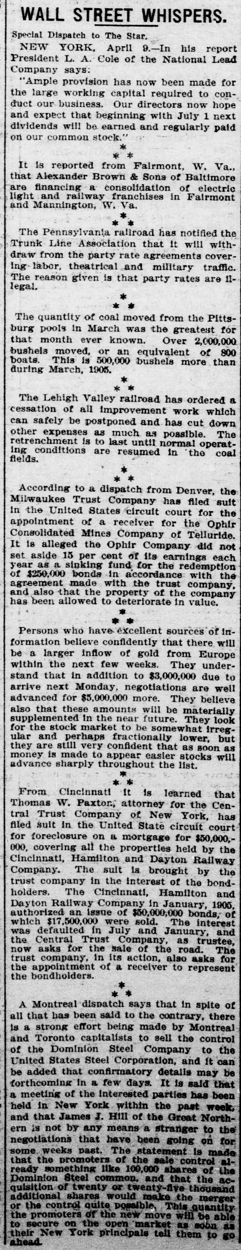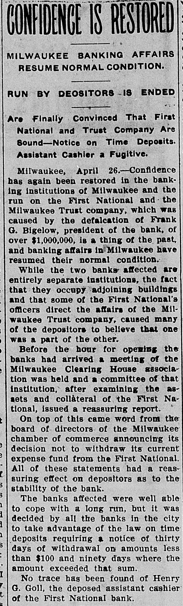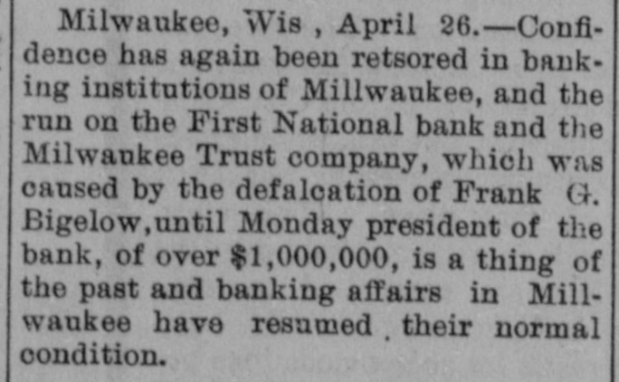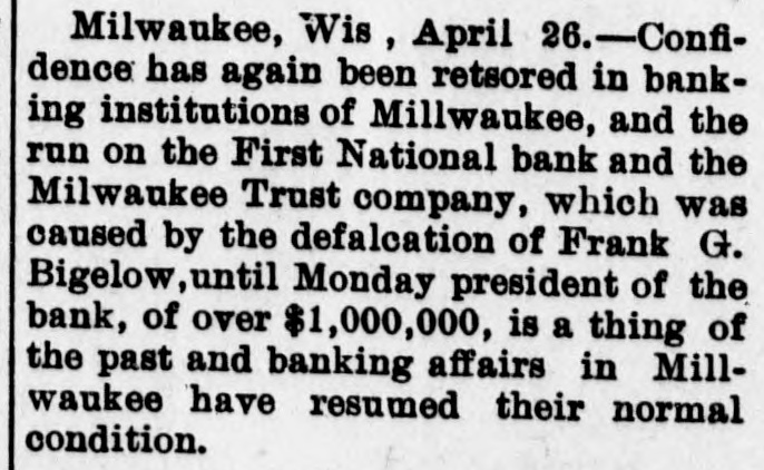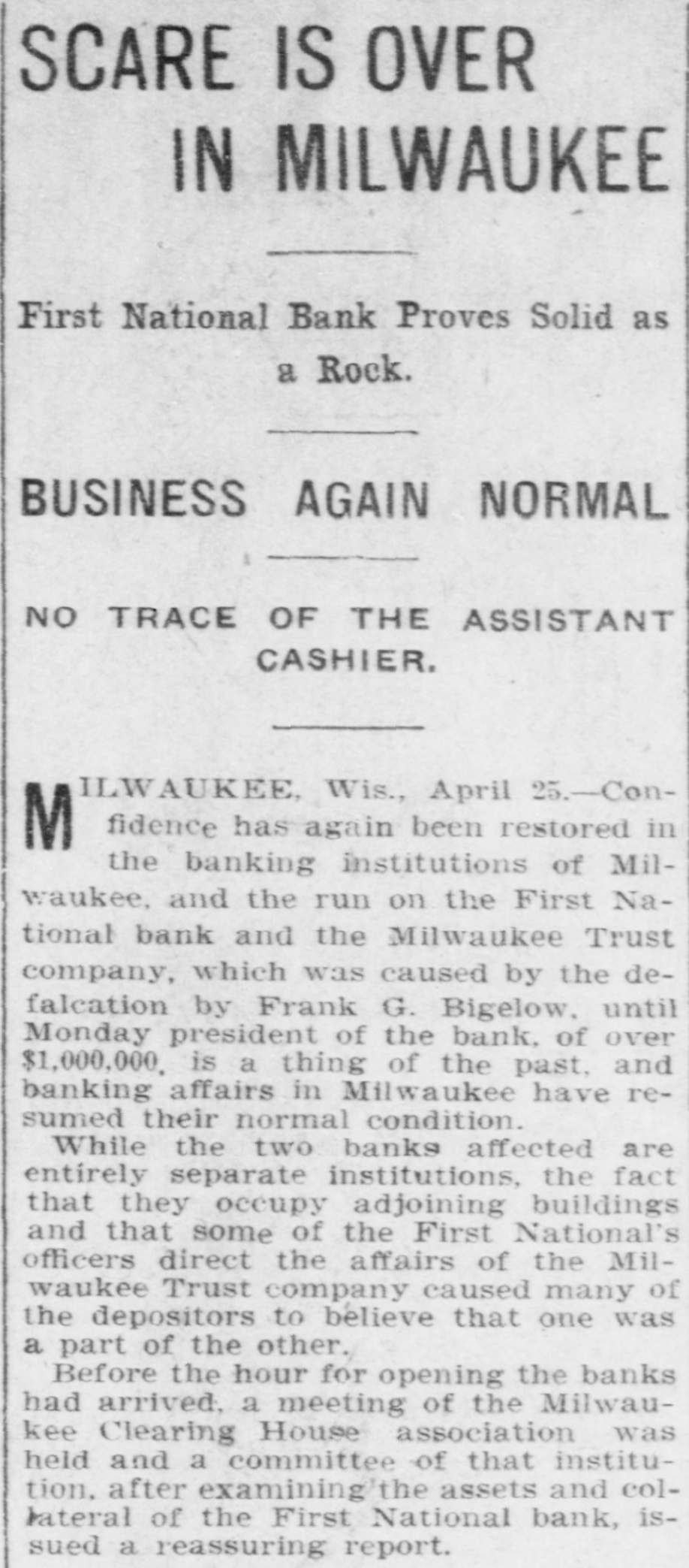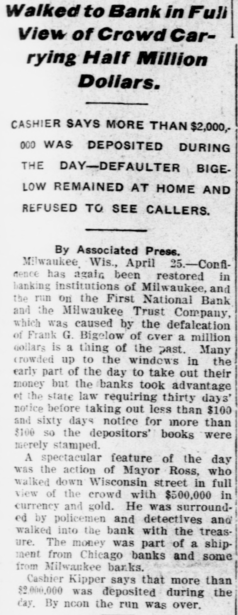 RUN STARTED ON MILWAUKEE TRUST Defalcation of President of First National Starts Run on Another Big Concern IS RESTORED CONFIDENCE Long Line of Depositors in Front of Both Institutinons, but Clearing House Statement and Aid of Other Banks Result in Restoring Normal Conditions. Milwaukee, April 25. - Despite the assurances that the Milwaukee Trust Company was in no manner involved by the financial troubles of Frank G. Bigelow, former president of the First National bank, crowds of people today assembled long before the opening of the Trust company bank to withdraw their deposits. The depositors gathered at the National bank were compartively few at first, but the number continued to increase. Bigelow had been a director of the Trust company, but when his defalcation became known he was removed as such by the board of directors. Notices posted on the windows of the First National and Trust Company's banks announced both institutions were abundantly prepared to meet all demands of depositors and creditors. There was no evidence of any trouble at other banks. John I. Beggs, director of the First National, said the bank had today received two million dollars from outside and local banks with which to meet any demands. Beggs said the run would probably continue thruout today, but that beginning with tomorrow, after having shown stability of the institution, the excitement would subside. As the hour approached for opening the bank the crowds in front of each bank became larger and extended for half a square. A detail of present maintain order. police were to Both institutions decided to take advantage of the printed clause in the pass books of all saving deposits requiring notice of thirty days before sums under a hundred dollars can be withdrawn. When the doors of the First National Bank and Milwaukee Trust Company were thrown open the crowd which had lined up two and four abreast for a distance of half a block from the main entrance of each institution, filed in as rapidly as the police would permit. Women and men were jostled in their into the were to efforts police to get constantly the banks compelled who and push them back. Those sought to withdraw funds were mostly small depositors who applied at the savings There were some while a were to department. tors, number waiting deposiwithdraw their funds. Up to noon there had been no run on any other banks. The board of directors of the Chamber of Commerce today voted unanimously not to withdraw the current fund from the First National Bank. The opinion is generally expressed that the bank is perfectly solvent. Milwaukee, April 25.-The run on the two banks ceased entirely in the afternoon and business in ths institutions was resumed under normal conditions. Bank is Solvent. Milwaukee, April 25. - The Clearing House Association today issued a statement saying after examining carefully all assets and collateral of the First National it is satisfied the bank is perfectly solvent.