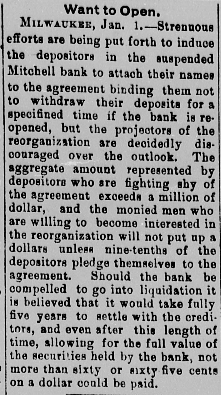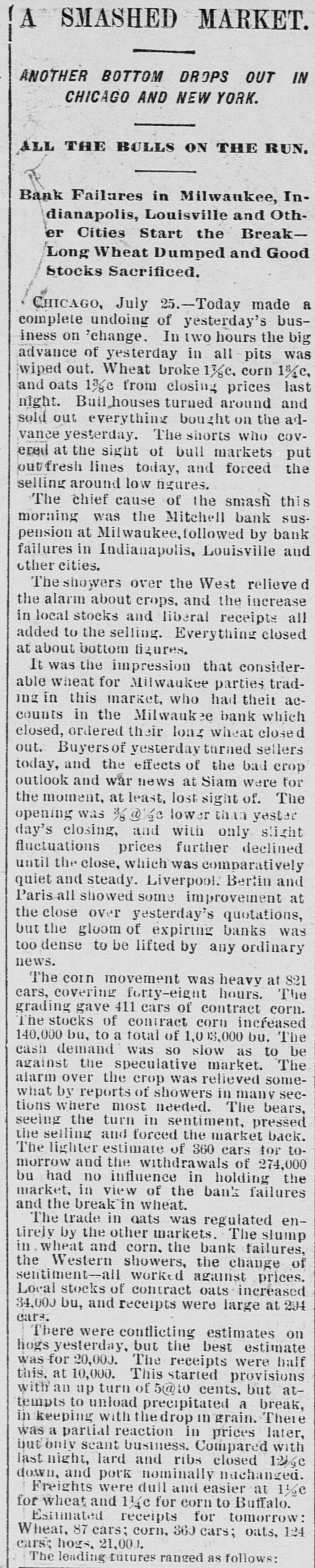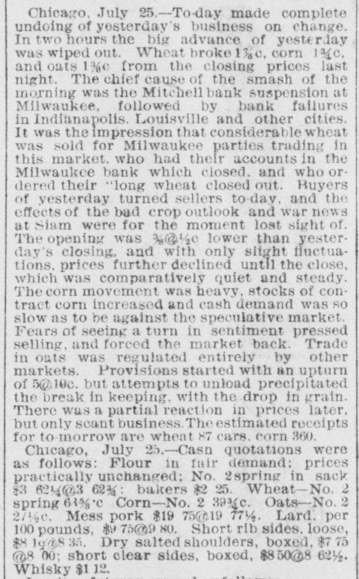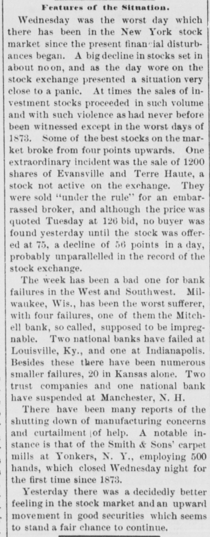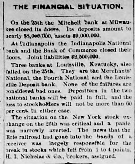 THE FINANCIAL SITUATION, On the 25th the Mitchell bank at Milwaukee closed Its doors. Its deposits amount to nearly $8,000,000, assets $9,000,000. At Indianapolis the Indianapolis National bank and the Bank of Commerce closed their doors. Joint liabilities $2,500,000. Three banks at Louisville, Kentucky, also failed on the 25th. They are the Merchants' National, the Fourth National and the Louisville Deposit bank. None of the failures are considered bad ones. Depositors in the two national banks will be paid in full, and the loss to stockholders will not be more than 60 per cent. in either case. The situation on the New York stock exchange on the 26th was critical and a. panic was narrowly averted. The news that the Erie railroad had gone into the hands of & receiver was largely responsible for the break In stocks which fell from 1 to 4 points. H. I. Nicholas & Co., brokers, assigned. The First National and Montana National banks of Helena, failed to open Thursday morning. A run followed on theother banks of the city. The run was confined principally to the Merchants' National bank, which paid everybody. They are confident that they will be able to stand the run. The two closed banks have ample assets, but cannot realize on them. The Oregon National bank and the Northwest Loan and Trust company of Portland failed to open their doors on the 27th. A notice on the door says: "Owing to withdrawal of deposits and the inability to realize on securities this bank is forced to suspend." The First National of Middleboro, Kentucky, closed on the 27th. Two banks at Sparta, Wisconsin, closed, also a bank at Portage. The Ellensburg, Washington, National bank suspended payment. In consequence of A run upon It the Traders' Deposit bank of Mount Sterling, Indiana, suspended. The following banks failed on the 28th: First National at Great Falls, Montana; German National at Washington, Wisconsin Seymour's Bank at Chippewa Falls, Wisconsin; Chamberlain National at Chamberlain, South Dakota. The publication of the intended action of the New York and Brooklyn savings banks and institutions to put Into practice the law entitling them to sixty days' notice from deithdrawals of money positors of Intended precipitated a run Saturday. Some of the banks paid the amount in full, and thus sought to restore confidence. Others required notice, the time ranging from ten to ninety days, according to the period specified in the by-laws. The Commercial National, Ainsworth National and Portland Savings bank of Portland, Oregon, closed their doors on the 29th. The following banks also closed on that date: Citizens Savings, Akron, Ohio; First National. Kankakee, Illinois; Commercial, Eau Claire, Wisconsin: Barron Brothers, Lusk, Wyoming. The McNeal & Urban Safe and Lock Company, one of the oldest safe firms in the country, have assigned to Howard Douglass of Cincinnati. Assets. $160,000; liabilities unknown. The firm has been unfortunate in several large contracts, but It is claimed that It is solvent. The New York clearing-house committee on the 31st authorized the issue of $2,500,000 more In loan certificates, which brings the total issue outstanding up to $27,975,000. It may be noted that $26,565,000 was the maximum issue of 1878, but this comparison is really less impressive than It seems, for a very considerable part of this year's New York Issues has in practical effect, been provision for Chicago. No banks applied, 50 the dispatches stated, for loan certificates in the city. A secondary result of the local money scareity was an absolute want of bids for sterling bills, exchange rates going on some transactions below the year's previous lowest record. The following banks suspended on the 31st: Springfield Savings, at Springfield, Misssouri; First National, Ashland, Wisconsin: First National, Dalles, Oregon: Bellingham Bay National, Whatcom, Washington. Savings