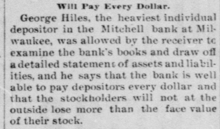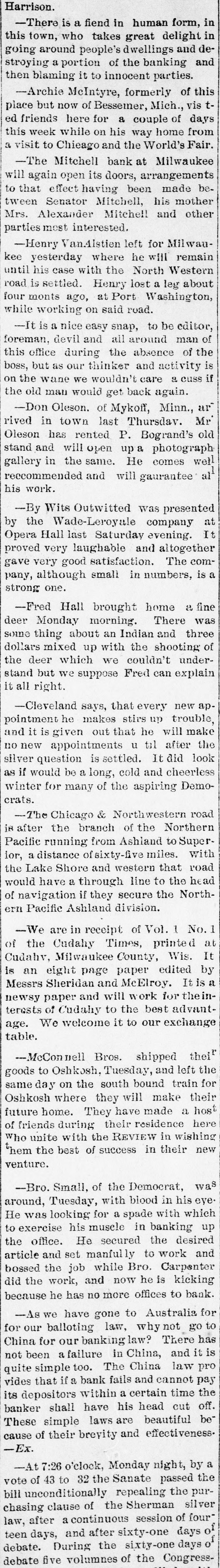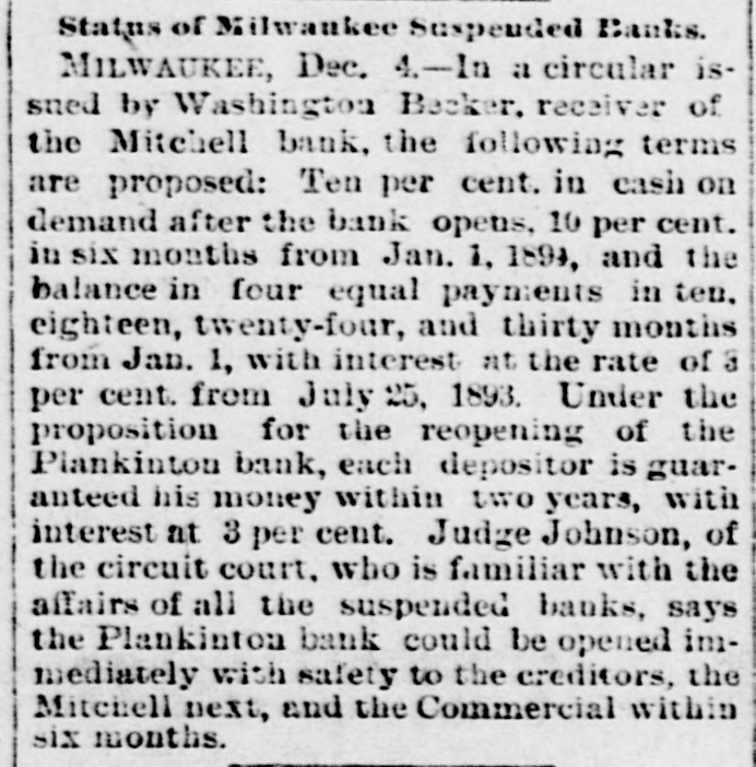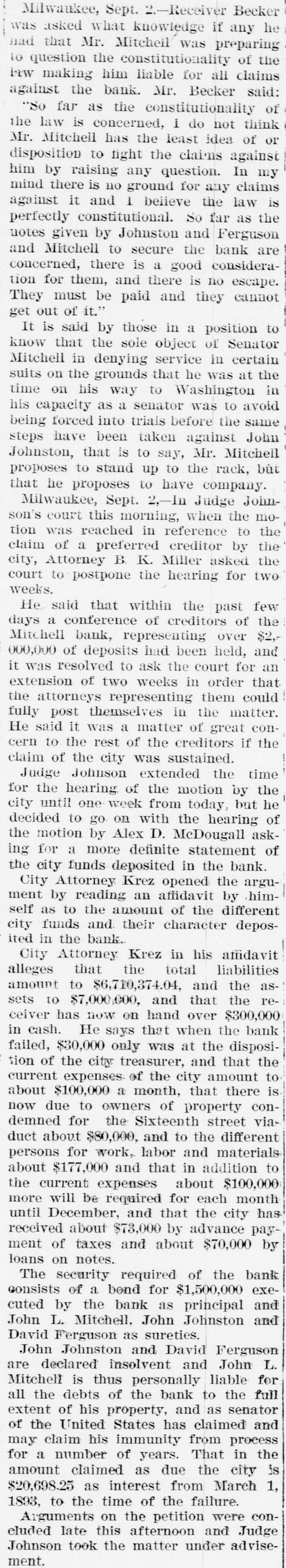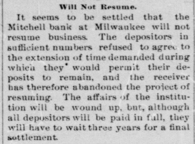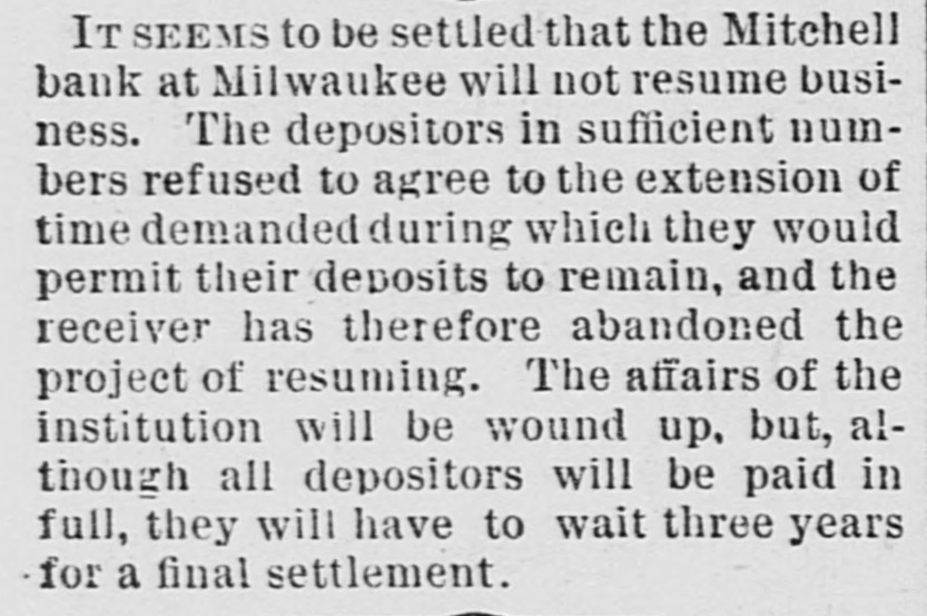THE FINANCIAL SITUATION, On the 25th the Mitchell bank at Milwaukee closed Its doors. Its deposits amount to nearly $8,000,000, assets $9,000,000. At Indianapolis the Indianapolis National bank and the Bank of Commerce closed their doors. Joint liabilities $2,500,000. Three banks at Louisville, Kentucky, also failed on the 25th. They are the Merchants' National, the Fourth National and the Louisville Deposit bank. None of the failures are considered bad ones. Depositors in the two national banks will be paid in full, and the loss to stockholders will not be more than 60 per cent. in either case. The situation on the New York stock exchange on the 26th was critical and a. panic was narrowly averted. The news that the Erie railroad had gone into the hands of & receiver was largely responsible for the break In stocks which fell from 1 to 4 points. H. I. Nicholas & Co., brokers, assigned. The First National and Montana National banks of Helena, failed to open Thursday morning. A run followed on theother banks of the city. The run was confined principally to the Merchants' National bank, which paid everybody. They are confident that they will be able to stand the run. The two closed banks have ample assets, but cannot realize on them. The Oregon National bank and the Northwest Loan and Trust company of Portland failed to open their doors on the 27th. A notice on the door says: "Owing to withdrawal of deposits and the inability to realize on securities this bank is forced to suspend." The First National of Middleboro, Kentucky, closed on the 27th. Two banks at Sparta, Wisconsin, closed, also a bank at Portage. The Ellensburg, Washington, National bank suspended payment. In consequence of A run upon It the Traders' Deposit bank of Mount Sterling, Indiana, suspended. The following banks failed on the 28th: First National at Great Falls, Montana; German National at Washington, Wisconsin Seymour's Bank at Chippewa Falls, Wisconsin; Chamberlain National at Chamberlain, South Dakota. The publication of the intended action of the New York and Brooklyn savings banks and institutions to put Into practice the law entitling them to sixty days' notice from deithdrawals of money positors of Intended precipitated a run Saturday. Some of the banks paid the amount in full, and thus sought to restore confidence. Others required notice, the time ranging from ten to ninety days, according to the period specified in the by-laws. The Commercial National, Ainsworth National and Portland Savings bank of Portland, Oregon, closed their doors on the 29th. The following banks also closed on that date: Citizens Savings, Akron, Ohio; First National. Kankakee, Illinois; Commercial, Eau Claire, Wisconsin: Barron Brothers, Lusk, Wyoming. The McNeal & Urban Safe and Lock Company, one of the oldest safe firms in the country, have assigned to Howard Douglass of Cincinnati. Assets. $160,000; liabilities unknown. The firm has been unfortunate in several large contracts, but It is claimed that It is solvent. The New York clearing-house committee on the 31st authorized the issue of $2,500,000 more In loan certificates, which brings the total issue outstanding up to $27,975,000. It may be noted that $26,565,000 was the maximum issue of 1878, but this comparison is really less impressive than It seems, for a very considerable part of this year's New York Issues has in practical effect, been provision for Chicago. No banks applied, 50 the dispatches stated, for loan certificates in the city. A secondary result of the local money scareity was an absolute want of bids for sterling bills, exchange rates going on some transactions below the year's previous lowest record. The following banks suspended on the 31st: Springfield Savings, at Springfield, Misssouri; First National, Ashland, Wisconsin: First National, Dalles, Oregon: Bellingham Bay National, Whatcom, Washington. Savings