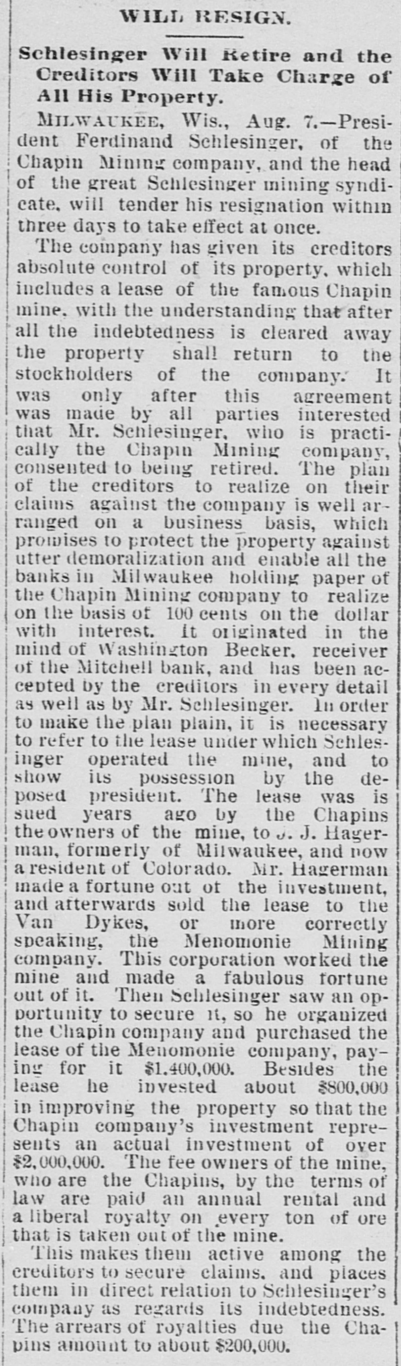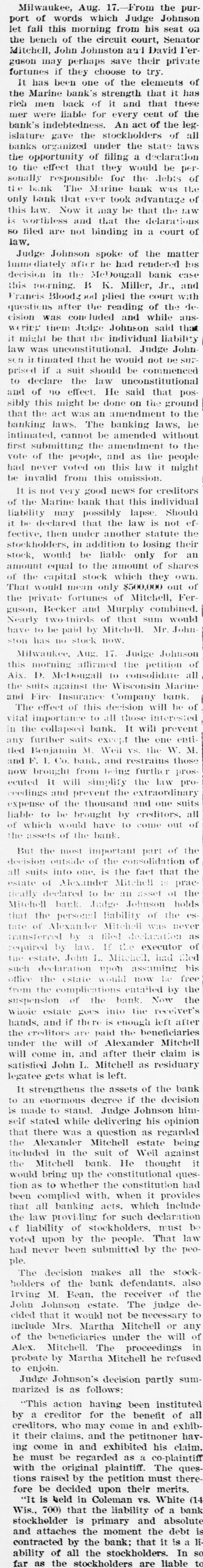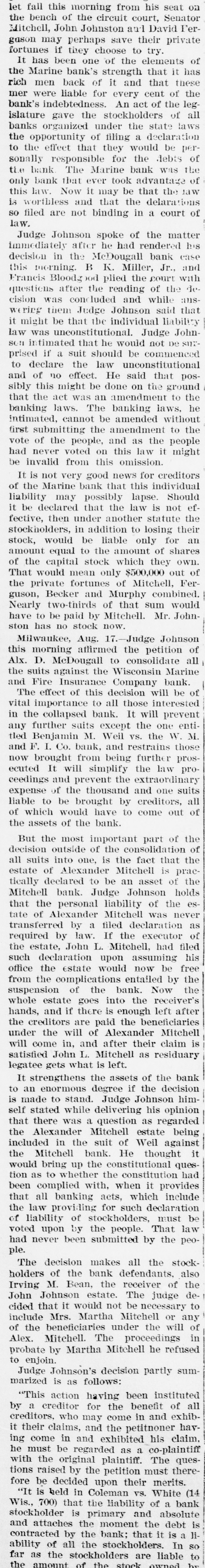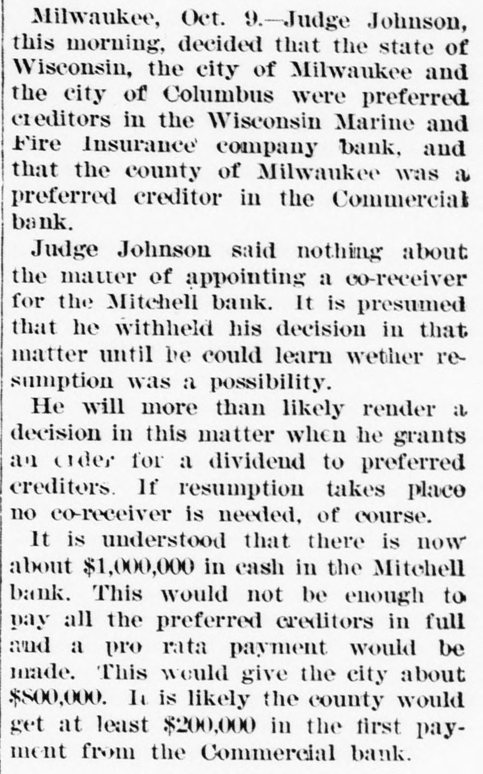 THE FINANCIAL SITUATION, On the 25th the Mitchell bank at Milwaukee closed Its doors. Its deposits amount to nearly $8,000,000, assets $9,000,000. At Indianapolis the Indianapolis National bank and the Bank of Commerce closed their doors. Joint liabilities $2,500,000. Three banks at Louisville, Kentucky, also failed on the 25th. They are the Merchants' National, the Fourth National and the Louisville Deposit bank. None of the failures are considered bad ones. Depositors in the two national banks will be paid in full, and the loss to stockholders will not be more than 60 per cent. in either case. The situation on the New York stock exchange on the 26th was critical and a. panic was narrowly averted. The news that the Erie railroad had gone into the hands of & receiver was largely responsible for the break In stocks which fell from 1 to 4 points. H. I. Nicholas & Co., brokers, assigned. The First National and Montana National banks of Helena, failed to open Thursday morning. A run followed on theother banks of the city. The run was confined principally to the Merchants' National bank, which paid everybody. They are confident that they will be able to stand the run. The two closed banks have ample assets, but cannot realize on them. The Oregon National bank and the Northwest Loan and Trust company of Portland failed to open their doors on the 27th. A notice on the door says: "Owing to withdrawal of deposits and the inability to realize on securities this bank is forced to suspend." The First National of Middleboro, Kentucky, closed on the 27th. Two banks at Sparta, Wisconsin, closed, also a bank at Portage. The Ellensburg, Washington, National bank suspended payment. In consequence of A run upon It the Traders' Deposit bank of Mount Sterling, Indiana, suspended. The following banks failed on the 28th: First National at Great Falls, Montana; German National at Washington, Wisconsin Seymour's Bank at Chippewa Falls, Wisconsin; Chamberlain National at Chamberlain, South Dakota. The publication of the intended action of the New York and Brooklyn savings banks and institutions to put Into practice the law entitling them to sixty days' notice from deithdrawals of money positors of Intended precipitated a run Saturday. Some of the banks paid the amount in full, and thus sought to restore confidence. Others required notice, the time ranging from ten to ninety days, according to the period specified in the by-laws. The Commercial National, Ainsworth National and Portland Savings bank of Portland, Oregon, closed their doors on the 29th. The following banks also closed on that date: Citizens Savings, Akron, Ohio; First National. Kankakee, Illinois; Commercial, Eau Claire, Wisconsin: Barron Brothers, Lusk, Wyoming. The McNeal & Urban Safe and Lock Company, one of the oldest safe firms in the country, have assigned to Howard Douglass of Cincinnati. Assets. $160,000; liabilities unknown. The firm has been unfortunate in several large contracts, but It is claimed that It is solvent. The New York clearing-house committee on the 31st authorized the issue of $2,500,000 more In loan certificates, which brings the total issue outstanding up to $27,975,000. It may be noted that $26,565,000 was the maximum issue of 1878, but this comparison is really less impressive than It seems, for a very considerable part of this year's New York Issues has in practical effect, been provision for Chicago. No banks applied, 50 the dispatches stated, for loan certificates in the city. A secondary result of the local money scareity was an absolute want of bids for sterling bills, exchange rates going on some transactions below the year's previous lowest record. The following banks suspended on the 31st: Springfield Savings, at Springfield, Misssouri; First National, Ashland, Wisconsin: First National, Dalles, Oregon: Bellingham Bay National, Whatcom, Washington. Savings