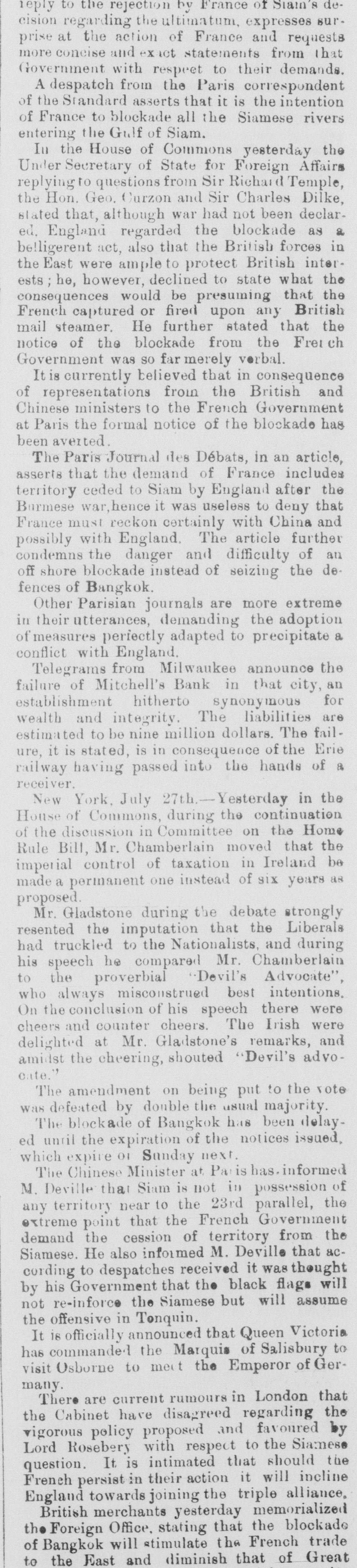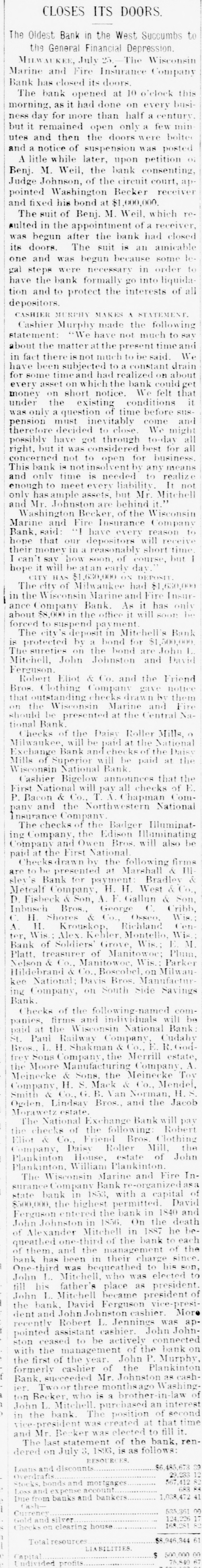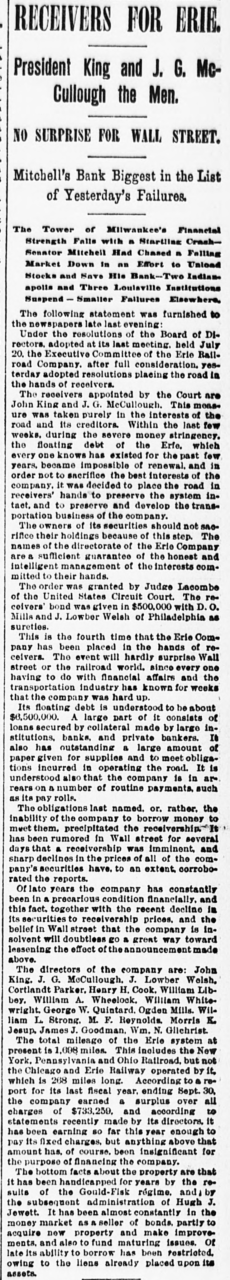 # RECEIVERS FOR ERIE. President King and J. G. McCullough the Men. # NO SURPRISE FOR WALL STREET. Mitchell's Bank Biggest in the List of Yesterday's Failures. The Tower of Milwaukee's Financial Strength Falls with a Startling Crash-Senator Mitchell Had Chased a Falling Market Down in an Effort to Unload Stocks and Save His Bank-Two Indianapolis and Three Louisville Institutions Suspend-Smaller Failures Elsewhere. The following statement was furnished to the newspapers late last evening: Under the resolutions of the Board of Directors, adopted at its last meeting, held July 20, the Executive Committee of the Erie Railroad Company, after full consideration, yesterday adopted resolutions placing the road in the hands of receivers. The receivers appointed by the Court are John King and J. G. McCullough. This measure was taken purely in the interests of the road and its creditors. Within the last few weeks, during the severe money stringency, the floating debt of the Erfe, which every one knows has existed for the past few years, became impossible of renewal, and in order not to sacrifice the best interests of the company, it was decided to place the road in receivers' hands to preserve the system intact, and to preserve and develop the transportation business of the company. The owners of its securities should not sacrifice their holdings because of this step. The names of the directorate of the Erie Company are a sufficient guarantee of the honest and intelligent management of the interests committed to their hands. The order was granted by Judge Lacombe of the United States Circuit Court. The receivers' bond was given in $500,000 with D. O. Mills and J. Lowber Welsh of Philadelphia as sureties. This is the fourth time that the Erie Company has been placed in the hands of receivers. The event will hardly surprise Wall street or the railroad world, since every one having to do with financial affairs and the transportation industry has known for weeks that the company was hard up. Its floating debt is understood to be about $6,500,000. A large part of it consists of loans secured by collateral made by large institutions, banks, and private bankers. It also has outstanding a large amount of paper given for supplies and to meet obligations incurred in operating the road. It is understood also that the company is in arrears on a number of routine payments, such as its pay rolls. The obligations last named, or, rather, the inability of the company to borrow money to meet them, precipitated the receivership. It has been rumored in Wall street for several days that a receivership was imminent, and sharp declines in the prices of all of the company's securities have, to an extent, corroborated the reports. Of late years the company has constantly been in a precarious condition financially, and this fact, together with the recent decline in its securities to receivership prices, and the belief in Wall street that the company is insolvent will doubtless go a great way toward lessening the effect of the announcement made above. The directors of the company are: John King. J. G. McCullough, J. Lowber Welsh, Cortlandt Parker, Henry H. Cook, William Libbey. William A. Wheelock, William Whitewright. George W. Quintard. Ogden Mills. William L. Strong. M. F. Reynolds. Morris K. Jesup, James J. Goodman, Wm. N. Gilchrist. The total mileage of the Erie system at present is 1,008 miles. This includes the New York, Pennsylvania and Ohio Railroad, but not the Chicago and Erie Railway operated by it, which is 268 miles long. According to a report for its last fiscal year, ending Sept. 30, the company earned a surplus over all charges of $733,259, and according to statements recently made by its directors, it has been earning so far this year enough to pay its fixed charges, but anything above that amount has, of course, been insignificant for the purpose of financing the company. The bottom facts about the property are that it has been handicapped for years by the results of the Gould-Fisk régime, and by the subsequent administration of Hugh J. Jewett. It has been almost constantly in the money market as a seller of bonds, partly to acquire new property and make improvements, and also to fund maturing issues. Of late its ability to borrow has been restricted, owing to the liens already placed upon its assets.