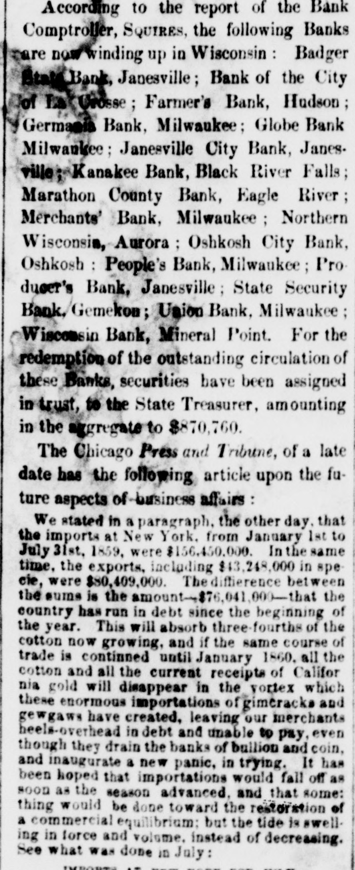 According to the report of the Bank Comptroller, SQUIRES, the following Banks care now winding up in Wisconsin : Badger Stat Bank, Janesville ; Bank of the City of La Crosse ; Farmer's Bank, Hudson ; Germania Bank, Milwaukee: Globe Bank Milwankee ; Janesville City Bank, Janes. ville; Kanakee Bank, Black River Falls; Marathon County Bank, Eagle River ; Merchants' Bank, Milwaukee ; Northern Wisconsin, Aurora ; Oshkosh City Bank, Oshkosh : People's Bank, Milwaukee ; Pro. ducer's Bank, Janesville : State Security Bank. Gemekon; Union Bank, Milwaukee Wiscomsin Bank, Mineral Point. For the redemption of the outstanding circulation of these Banks, securities have been assigned in trust, to the State Treasurer, amounting in the aggregate to $870,760. The Chicago Press and Tribune, of a late date has the following article upon the future aspects of-business affairs We stated in a paragraph, the other day. that the imports at New York. from January 1st to July 31st, 1859, were $156,450,000. In the same time, the exports, including $43,248,000 in specie, were $80,409,000. The diffierence between the sums is the amount-$76,041,000-that the country has run in debt since the beginning of the year. This will absorb three-fourths of the cotton now growing, and if the same course of trade is continned until January 1860, all the cotton and all the current receipts of Califor nia gold will disappear in the yortex which these enormous importations of gimeracks and gewgaws have created, leaving our merchants heels-overhead in debt and unable to pay, even though they drain the banks of bullion and coin, and inaugurate a new panic, in trying. It has been hoped that importations would fall off as soon as the season advanced, and that some: thing would be done toward the restoration of a commercial equilibrium: but the tide is swelling in force and volume. instead of decreasing. See what was done in July: .. -- ----