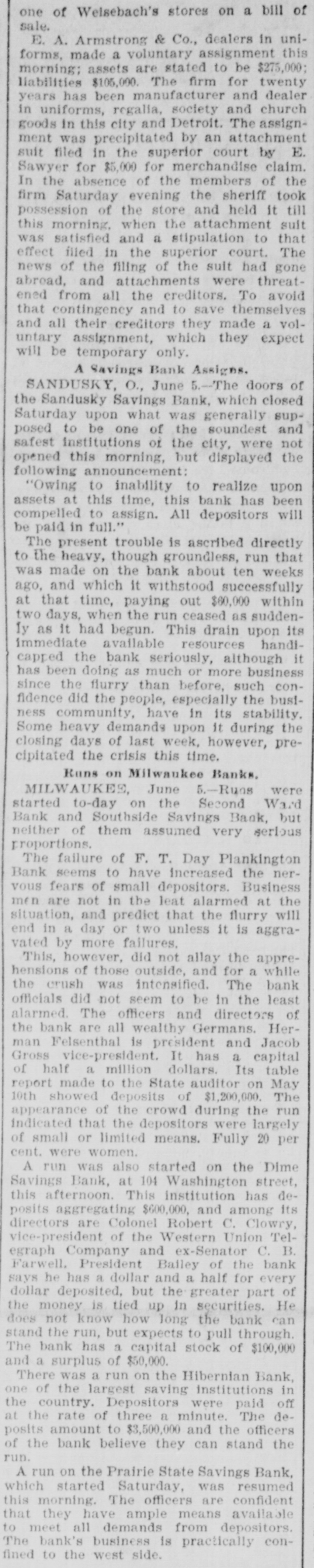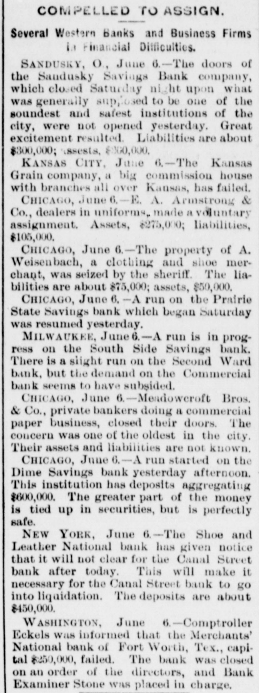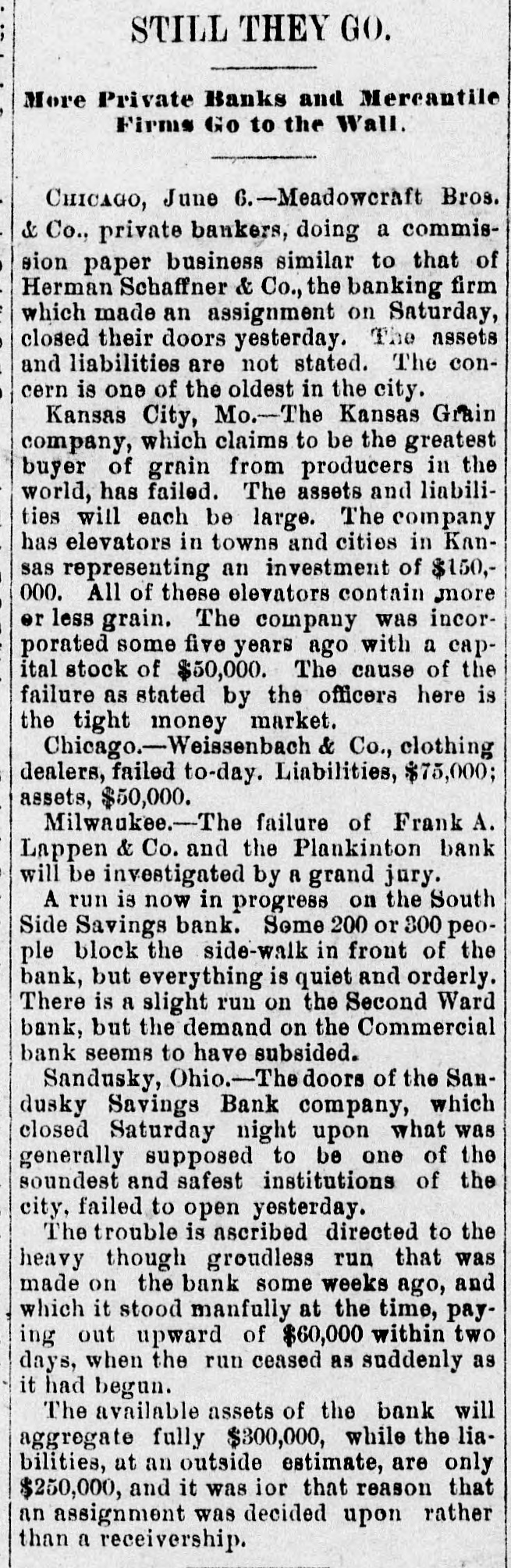 EDITION. CLOSED THEIR DOORS Meadowcraft Bros., Private Bankers at Chicago, Fail. FINANCIAL UNEASINESS IN THE WEST. Sinking of the Steamer Kaiser Wilhelm. OTHER TELEGRAPHIC NEWS. FINANCIAL UNEASINESS. Meadowcraft Brothers, Private Bankers in Chicago, Suspend. CHICAGO, June 5.-Meadowcraft Brothers, private bankers,closed their doors this morning. A crowd quickly collected on the street and anxious inquiries as to the cause of the closed doors went around. No sign was posted on the doors. In response to calls a clerk came to the doors. "The bank will not open today," he said, and withdrew. The bank is a private one, the firm being composed of Robert, Charles J. and Frank R. Meadowcroft. The business was established in 1860 b7 the father of the present proprietors. The bank occupies the quarters formerly used by the Park National Bank. which failed some ago. time Lyman E. Crandall has been appointed receiver. RUN OF THE STATE BANK OF COMMERCE. The State Bank of Commerce, having offices on the ground of the Woman's Christian Temperance Temple, is experiencing a heavy run this afternoon. It started just before noon with the appearance of some thirty or forty depositors. The news spread like wild fire and within half aa hour the lobby was filled with an excited crowd of men and women, who tore and crushed in order to get within the glass doors. The scene attracted over a thousand of the general public. and the through increased to such proportions that it was necessary to summon several policemen. who admitted the frenzied crowd one by one as fast as those at the head of the line received their money. At half-past twelve an iron bar red express wagon. containing Feveral bags of gold, was hurriedly driven up to the building and the money carried in by stalwart watchmen and placed upon the counters. This. however. did not allay the auprehensions of those outside, and for a while the o crush was intensified. The bank officials did not seem to be in the least alarmed. Cashier Frederick Miller said to the repreare not sentative of the United Press: We alarmed and we will meet this run Then he added. as a kind of after thought: "That is. as long as we are able. The officers and directors of the bank are all wealthy Germans. Herman Felse. that is president and Jacob Gross vice credient. It has a capital of half a million of dollars. Its last report made to the state auditor on May 10 showed deposit I of $1,200.000 surplus and undivided profits $25.600. against which it had about $300,000 in cash. the balance being covered by loans and discounts. overdrafts and bords. The character of the crowd during the run indicated that the depositors were largely people small or limited means. Fully 20 per cent were women. E.A. Armstrong & Co., dealers in uniforms, made a voluntary assignment this morning. Assets are stated to be $275,000; liabilities, $105,000. Arun on the Prairie State Savings Bank, which started Saturday, was resumed this morting. The oficers RE confident. however, that they have ample means available to meet all demands from depositors. The bank's business is practically confined to the west side. CLEVELAND. OHIO. June 5.-A dispatch from Sandusky says: A savings bank here was put in the hands of a receiver this morning. A BUN IN MILWAULEE. MILWAUKEE. June 5.-A run is now in progress on the South Side Savings Bank. Some two or three hundred people block up the sidewalk in front of the bank, but everything is quiet and orderly. There is a slight run on the Second Ward Bank. but the demand on the Commercial Bank seems to have subsided. Affairs at other banks are about in their normal condition. The failure of F. T. Day late on Saturday seems to have increased the neryours fears of small depositors. Business men are not in the least alarmed at the situation. and predict that the flurry will end in a day or two unless it is aggravated by more failures. KANSAS CITY, June 5.-The Kansas Grain Company. a big commission house with branch offices all over Kansas. has failed. WASHINGTON BUTCHERS SONS IN PHILADELPHIA. PHILADELPHIA, PA.. June .--Washington Butchers' Sons. provision dealers, today filed an assignment, with George W. Lex as the assignee. No statement of the assets or liabilities can be obtained. The tightness of the money market is the announced cause of the embarrassment. A VIRGINIAN'S FAILURE. Special Dispatch to The Evening Star. PETERSBURG, Vs. June 5.-E. C. McCulloch, one of the largest merchants at Blackstone, this state, has made an assignment. His property is valued at $49,000, and his creditors are secured in classes. His whole indebtedness is about @43.000. The first class simply includes expenses of the trust. There is no question about his property paying second-class debts in full, and probably the third and fourth-class. while there is a possibility of all the debts being paid in full. EULALIE WILL BE DISAPPOINTED Spain's Exhibit is Not as Near Completion