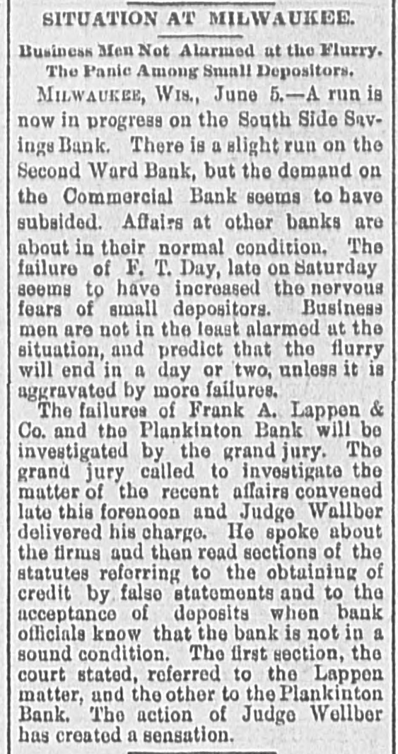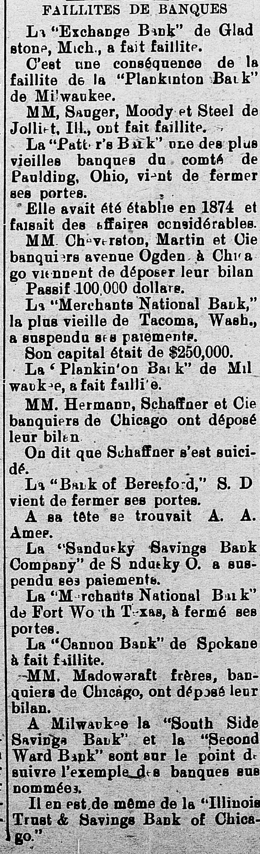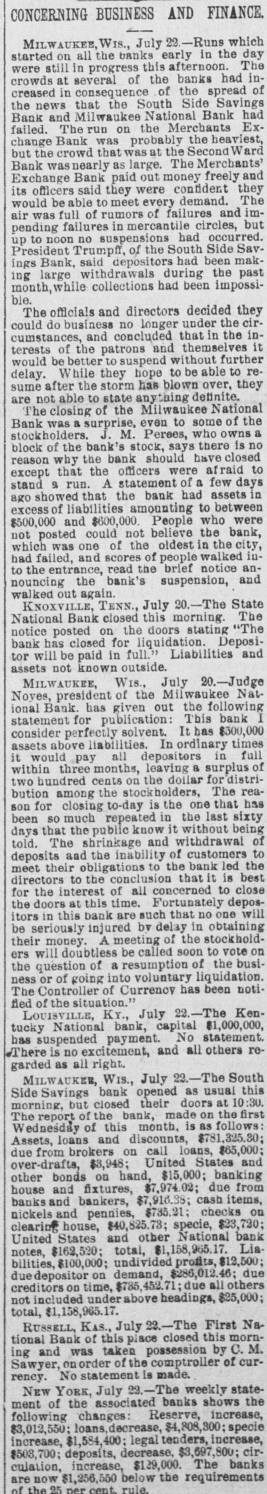 EDITION. CLOSED THEIR DOORS Meadowcraft Bros., Private Bankers at Chicago, Fail. FINANCIAL UNEASINESS IN THE WEST. Sinking of the Steamer Kaiser Wilhelm. OTHER TELEGRAPHIC NEWS. FINANCIAL UNEASINESS. Meadowcraft Brothers, Private Bankers in Chicago, Suspend. CHICAGO, June 5.-Meadowcraft Brothers, private bankers,closed their doors this morning. A crowd quickly collected on the street and anxious inquiries as to the cause of the closed doors went around. No sign was posted on the doors. In response to calls a clerk came to the doors. "The bank will not open today," he said, and withdrew. The bank is a private one, the firm being composed of Robert, Charles J. and Frank R. Meadowcroft. The business was established in 1860 b7 the father of the present proprietors. The bank occupies the quarters formerly used by the Park National Bank. which failed some ago. time Lyman E. Crandall has been appointed receiver. RUN OF THE STATE BANK OF COMMERCE. The State Bank of Commerce, having offices on the ground of the Woman's Christian Temperance Temple, is experiencing a heavy run this afternoon. It started just before noon with the appearance of some thirty or forty depositors. The news spread like wild fire and within half aa hour the lobby was filled with an excited crowd of men and women, who tore and crushed in order to get within the glass doors. The scene attracted over a thousand of the general public. and the through increased to such proportions that it was necessary to summon several policemen. who admitted the frenzied crowd one by one as fast as those at the head of the line received their money. At half-past twelve an iron bar red express wagon. containing Feveral bags of gold, was hurriedly driven up to the building and the money carried in by stalwart watchmen and placed upon the counters. This. however. did not allay the auprehensions of those outside, and for a while the o crush was intensified. The bank officials did not seem to be in the least alarmed. Cashier Frederick Miller said to the repreare not sentative of the United Press: We alarmed and we will meet this run Then he added. as a kind of after thought: "That is. as long as we are able. The officers and directors of the bank are all wealthy Germans. Herman Felse. that is president and Jacob Gross vice credient. It has a capital of half a million of dollars. Its last report made to the state auditor on May 10 showed deposit I of $1,200.000 surplus and undivided profits $25.600. against which it had about $300,000 in cash. the balance being covered by loans and discounts. overdrafts and bords. The character of the crowd during the run indicated that the depositors were largely people small or limited means. Fully 20 per cent were women. E.A. Armstrong & Co., dealers in uniforms, made a voluntary assignment this morning. Assets are stated to be $275,000; liabilities, $105,000. Arun on the Prairie State Savings Bank, which started Saturday, was resumed this morting. The oficers RE confident. however, that they have ample means available to meet all demands from depositors. The bank's business is practically confined to the west side. CLEVELAND. OHIO. June 5.-A dispatch from Sandusky says: A savings bank here was put in the hands of a receiver this morning. A BUN IN MILWAULEE. MILWAUKEE. June 5.-A run is now in progress on the South Side Savings Bank. Some two or three hundred people block up the sidewalk in front of the bank, but everything is quiet and orderly. There is a slight run on the Second Ward Bank. but the demand on the Commercial Bank seems to have subsided. Affairs at other banks are about in their normal condition. The failure of F. T. Day late on Saturday seems to have increased the neryours fears of small depositors. Business men are not in the least alarmed at the situation. and predict that the flurry will end in a day or two unless it is aggravated by more failures. KANSAS CITY, June 5.-The Kansas Grain Company. a big commission house with branch offices all over Kansas. has failed. WASHINGTON BUTCHERS SONS IN PHILADELPHIA. PHILADELPHIA, PA.. June .--Washington Butchers' Sons. provision dealers, today filed an assignment, with George W. Lex as the assignee. No statement of the assets or liabilities can be obtained. The tightness of the money market is the announced cause of the embarrassment. A VIRGINIAN'S FAILURE. Special Dispatch to The Evening Star. PETERSBURG, Vs. June 5.-E. C. McCulloch, one of the largest merchants at Blackstone, this state, has made an assignment. His property is valued at $49,000, and his creditors are secured in classes. His whole indebtedness is about @43.000. The first class simply includes expenses of the trust. There is no question about his property paying second-class debts in full, and probably the third and fourth-class. while there is a possibility of all the debts being paid in full. EULALIE WILL BE DISAPPOINTED Spain's Exhibit is Not as Near Completion