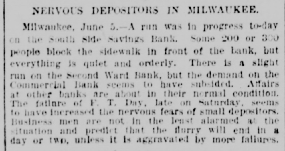 Run appears driven by nervous small depositors reacting to recent local failures (e.g., Plankinton Bank, F. T. Day) and general regional uneasiness.