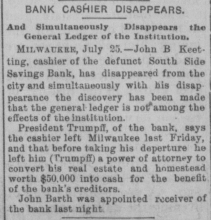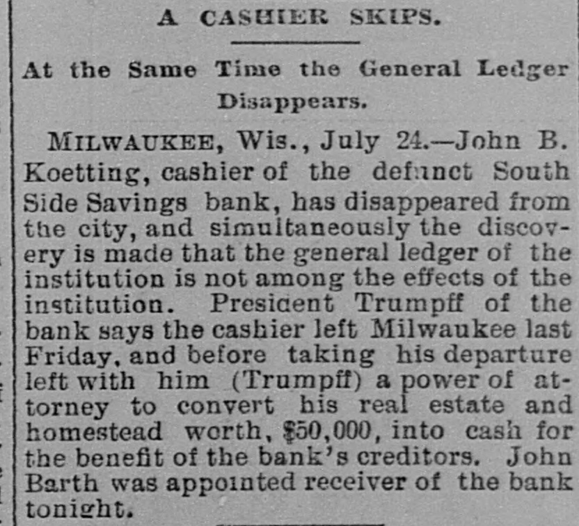 John Barth was appointed receiver of the bank to-night. John B. Koetting, cashier of the defunct South Side Savings bank, has disappeared from the city and simultaneously the discovery has been made that the general ledger is not among the effects of the institution. (various papers, July 24-25, 1893).