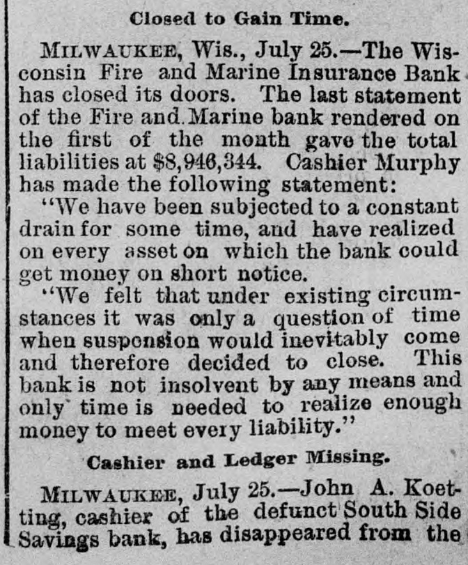 Closed to Gain Time. MILWAUKEE, Wis., July 25.-The Wisconsin Fire and Marine Insurance Bank has closed its doors. The last statement of the Fire and Marine bank rendered on the first of the month gave the total liabilities at $8,946,344. Cashier Murphy has made the following statement: "We have been subjected to a constant drain for some time, and have realized on every asset on which the bank could get money on short notice. "We felt that under existing circumstances it was only a question of time when suspension would inevitably come and therefore decided to close. This bank is not insolvent by any means and only` time is needed to realize enough money to meet every liability." Cashier and Ledger Missing. MILWAUKEE, July 25. - John A. Koetting, cashier of the defunct South Side Savings bank, has disappeared from the