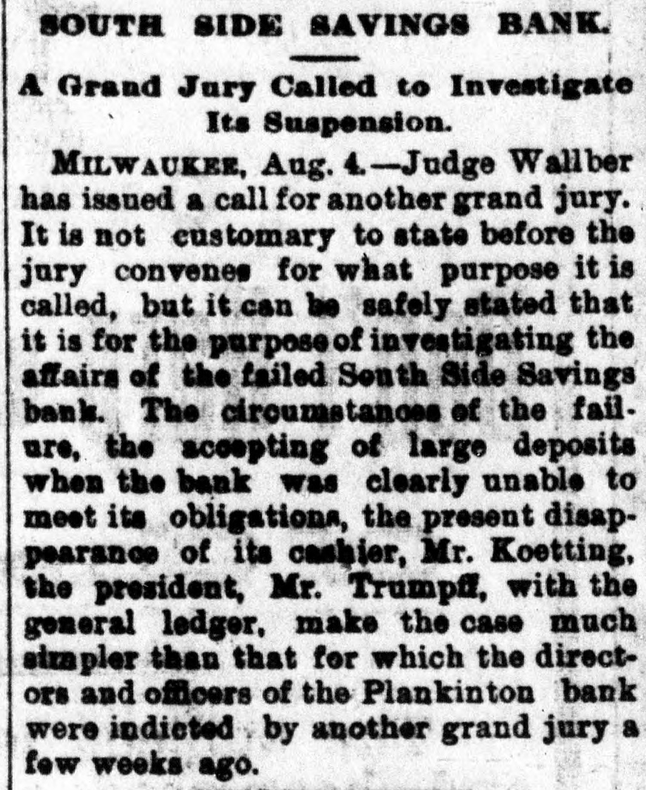 SOUTH SIDE SAVINGS BANK. I A Grand Jury Called to Investigate Its Suspension. MILWAUKER, Aug. 4.-Judge Wallber has issued a call for another grand jury. It is not customary to state before the jury convenes for what purpose it is called, but it can be safely stated that it is for the purpose of investigating the affairs of the failed South Side Savings bank. The circumstances of the failure, the accepting of large deposits when the bank was clearly unable to meet its obligations, the present disappearance of its cashier, Mr. Koetting, the president, Mr. Trumpff, with the general ledger, make the case much simpler than that for which the directors and officers of the Plankinton bank were indicted by another grand jury a few weeks ago.