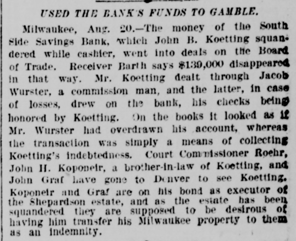 USED THE BANK'S FUNDS TO GAMBLE. Milwaukee, Aug. 20.-The money of the South Side Savings Bank, which John B. Koetting squandered while cashier, went into deals on the Board of Trade. Receiver Barth says $139,000 disappeared in that way. Mr. Koetting dealt through Jacob Wurster, a commission man, and the latter, in case of losses, drew on the bank, his checks being honored by Koetting. On the books It looked as if Mr. Wurster had overdrawn his account, whereas the transaction was simply a means of collecting Koetting's indebtedness. Court Commissioner Roehr, John H. Koponeir, a brother-in-law of Koetting, and John Graf have gone to Denver to see Koetting. Koponeir and Graf are on his bond as executor of the Shepardson estate, and as the estate has been squandered they are supposed to be desirous of having him transfer his Milwaukee property to them as an indemnity.