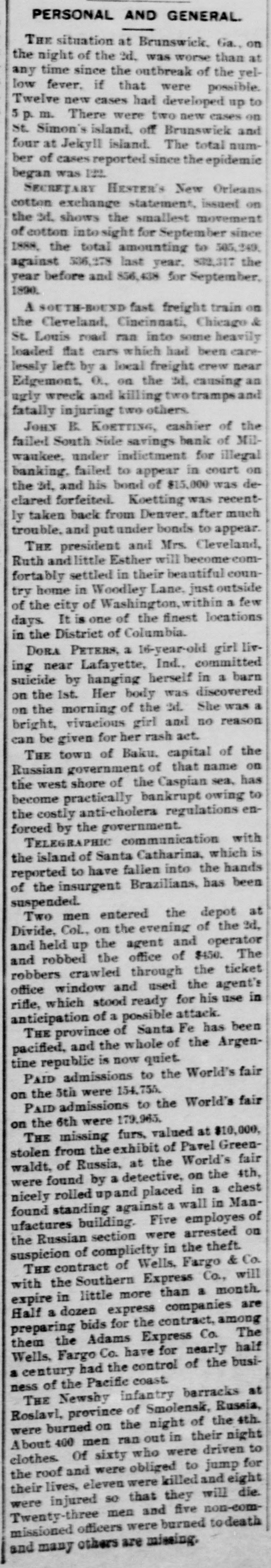 PERSONAL AND GENERAL. THE situation at Brunswick, Ga., on the night of the 2d, was worse than at any time since the outbreak of the yellow fever, if that were possible. Twelve new cases had developed up to 5 p. m. There were two new cases on St. Simon's island, off Brunswick and four at Jekyll island. The total number of cases reported since the epidemie began was 122. SECRETARY HESTER'S New Orleans cotton exchange statement, issued on the 3d. shows the smallest movement of cotton into sight for September since 1888, the total amounting to 505,249, against 506,178 last year, 832,317 the year before and 856,438 for September. 1890. A SOUTH-BOUND fast freight train on the Cleveland, Cincinnati, Chicago & St. Louis road ran into some heavily loaded flat cars which had been carelessly left by a local freight crew near Edgemont, O., on the 3d, causing an ugly wreck and killing two tramps and fatally injuring two others. JOHN B. KOETTING, cashier of the failed South Side savings bank of Milwaukee, under indictment for illegal banking, failed to appear in court on the 2d, and his bond of $15,000 was declared forfeited. Koetting was recently taken back from Denver, after much trouble, and put under bonds to appear. THE president and Mrs. Cleveland, Ruth and little Esther will become-comfortably settled in their beautiful country home in Woodley Lane, just outside of the city of Washington, within a few days. It is one of the finest locations in the District of Columbia. DORA PETERS, a 16-year-old girl living near Lafayette, Ind., committed suicide by hanging herself in a barn on the 1st. Her body was discovered on the morning of the 2d. She was a bright, vivacious girl and no reason can be given for her rash act. THE town of Baku, capital of the Russian government of that name on the west shore of the Caspian sea, has become practically bankrupt owing to the costly anti-cholera regulations enforced by the government. TELEGRAPHIC communication with the island of Santa Catharina, which is reported to have fallen into the hands of the insurgent Brazilians, has been suspended. Two men entered the depot at Divide, Col., on the evening of the 2d, and held up the agent and operator and robbed the office of $150. The robbers crawled through the ticket office window and used the agent's rifle, which stood ready for his use in anticipation of a possible attack. THE province of Santa Fe has been pacified, and the whole of the Argentine republic is now quiet. PAID admissions to the World's fair on the 5th were 154.755. PAID admissions to the World's fair on the 6th were 179.965. THE missing furs, valued at $10,000, stolen from the exhibit of Pavel Greenwaldt, of Russia, at the World's fair were found by a detective, on the 4th, nicely rolled up and placed in a chest found standing against a wall in Manufactures building. Five employes of the Russian section were arrested on suspicion of complicity in the theft. THE contract of Wells, Fargo & Co. with the Southern Express Co., will expire in little more than a month. Half a dozen express companies are preparing bids for the contract, among them the Adams Express Co. The Wells, Fargo Co. have for nearly half a century had the control of the business of the Pacific coast. THE Newshy infantry barracks at Roslavl, province of Smolensk, Russia, were burned on the night of the 4th. About 400 men ran out in their night clothes. Of sixty who were driven to the roof and were obliged to jump for their lives, eleven were killed and eight were injured so that they will die. Twenty-three men and five non-commissioned officers were burned to death and many others are missing.