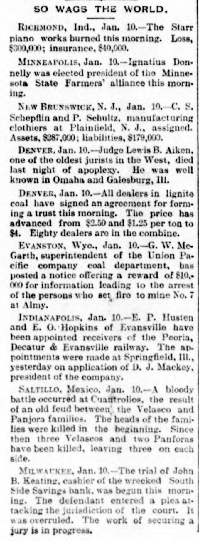 so WAGS THE WORLD. RICHMOND, Ind., Jan. 10.-The Starr piano works burned this morning. Loss, $300,000; insurance, $40,000. MINNEAPOLIS, Jan. 10.-Ignatius Donnelly was elected president of the Minnesota State Farmers' alliance this morning. NEW BRUNSWICK, N. J., Jan. 10.-C. S. Schepflin and P. Sehultz. manufacturing clothiers at Plainfield, N. J., assigned. Assets, $287,000; liabilities, $179,000. DENVER, Jan. 10.-Judge Lewis B. Aiken, one of the oldest jurists in the West, died last night of apoplexy. He was well known in Omaha and Galesburg, III. DENVER, Jan. 10.-All dealers in lignite coal have signed an agreement for forming a trust this morning. The price has advanced from $2.50 and $1.25 per ton to $4. Eighty dealers are in the combine. EVANSTON, Wyc., Jan. 10.-G. W. MeGarth, superintendent of the Union Pacific company coal department, has posted a notice offering a reward of $10,000 for information leading to the arrest of the persons who set fire to mine No. 7 at Almy. INDIANAPOLIS, Jan. 10.-E. P. Husten and E. O. Hopkins of Evansville have been appointed receivers of the Peoria, Decatur & Evansville railway. The appointments were made at Springfield, III., yesterday on application of D. J. Mackey, president of the company. SALTILLO, Mexico, Jan. 10.-A bloody battle occurred at Cuantrolios, the result of an old feud between the Velasco and Panjora families. The heads of the families were killed in the beginning. Since then three Velascos and two Panforas have been killed. leaving three on each side. MILWAUKEE. Jan. 10.-The trial of John B. Keating, cashier of the wrecked South Side Savings bank. was begun this morning. The defendant entered a plea attacking the jurisdiction of the court. It was overruled. The work of securing a jury is in progress.