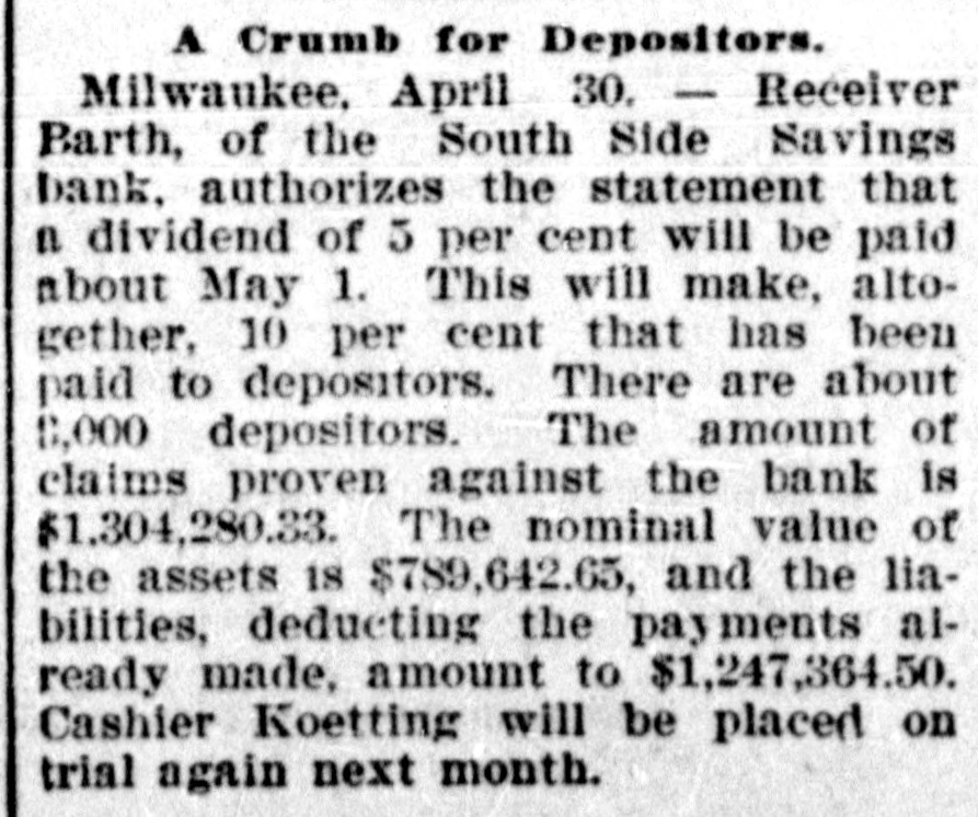 A Crumb for Depositors. Milwaukee. April 30. - Receiver Barth, of the South Side Savings bank, authorizes the statement that n dividend of 5 per cent will be paid about May 1. This will make, altogether, 10 per cent that has been paid to depositors. There are about 0,000 depositors. The amount of claims proven against the bank is $1,304,280.33. The nominal value of the assets 18 $789,642.65, and the liabilities, deducting the payments already made, amount to $1,247,364.50. Cashier Koetting will be placed on trial again next month.