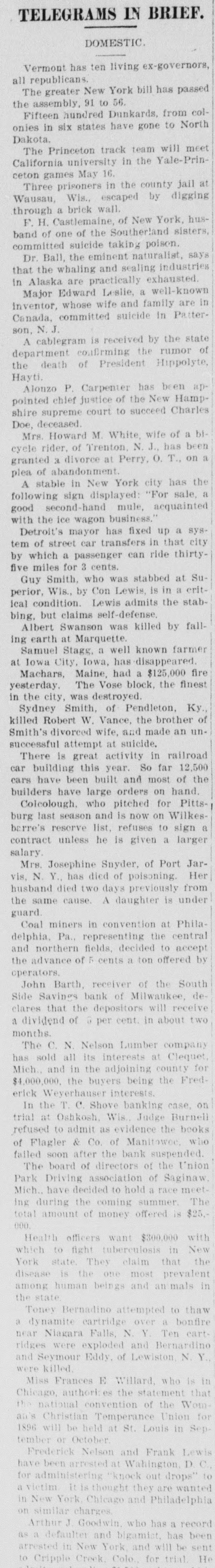 TELEGRAMS IN BRIEF. DOMESTIC. Vermont has ten living ex-governors all republicans. The greater New York bill has passed the assembly, 91 to 56. Fifteen hundred Dunkards, from colonies in six states have gone to North Dakota. The Princeton track team will meet California university in the Yale-Princeton games May 16. Three prisoners in the county jail at Wausau, Wis., escaped by digging through a brick wall. F. H. Castlemaine, of New York, husband of one of the Southerland sisters, committed suicide taking poison. Dr. Ball, the eminent naturalist, says that the whaling and sealing industries in Alaska are practically exhausted. Major Edward Leslie, a well-known inventor, whose wife and family are in Canada, committed suicide in Patterson, N.J. A cablegram is received by the state department confirming the rumor of the death of President Hippolyte, Hayti. Alonzo P. Carpenter has been appointed chief justice of the New Hampshire supreme court to succeed Charles Doe, deceased. Mrs. Howard M. White, wife of a bl. cycle rider. of Trenton, N. J., has been granted a divorce at Perry, O. T., on a plea of abandonment. A stable in New York city has the following sign displayed: "For sale, a good second-hand mule, acquainted with the ice wagon business." Detroit's mayor has fixed up a system of street car transfers in that city by which a passenger can ride thirtyfive miles for 3 cents. Guy Smith, who was stabbed at Superior, Wis., by Con Lewis, is in a critleal condition. Lewis admits the stabbing, but claims self-defense. Albert Swanson was killed by falling earth at Marquette. Samuel Stagg, a well known farmer at Iowa City, Iowa, has disappeared. Machars, Maine, had a $125,000 fire yesterday. The Vose block, the finest in the city, was destroyed. Sydney Smith, of Pendleton, Ky., killed Robert W. Vance, the brother of Smith's divorced wife, and made an unsuccessful attempt at suicide. There is great activity in railroad car building this year. So far 12,500 cars have been built and most of the builders have large orders on hand. Colcolough, who pitched for Pittsburg last season and is now on Wilkesbarre's reserve list, refuses to sign a contract unless he is given a larger salary. Mrs. Josephine Snyder, of Port Jarvis, N. Y., has died of poisoning. Her husband died two days previously from the same cause. A daughter is under guard. Coal miners in convention at Philadelphia, Pa., representing the central and northern fields, decided to accept the advance of F cents a ton offered by operators. John Barth, receiver of the South Side Savings bank of Milwaukee, declares that the depositors will receive a dividend of a per cent. in about two months. The C. N. Nelson Lumber company has sold all its interests at Clequet, Mich., and in the adjoining county for $4,000,000. the buyers being the Frederick Weyerhauser interests. In the T. C. Shove banking case, on trial at Oshkosh, Wis. Judge Burnell refused to admit as evidence the books of Flagler & Co. of Manitowoe, who failed soon after the bank suspended. The board of directors of the Union Park Driving association of Saginaw Mich., have decided to hold a race meet. ing during the coming summer. The total amount of money offered is $25, 000. Health officers want $300.000 with