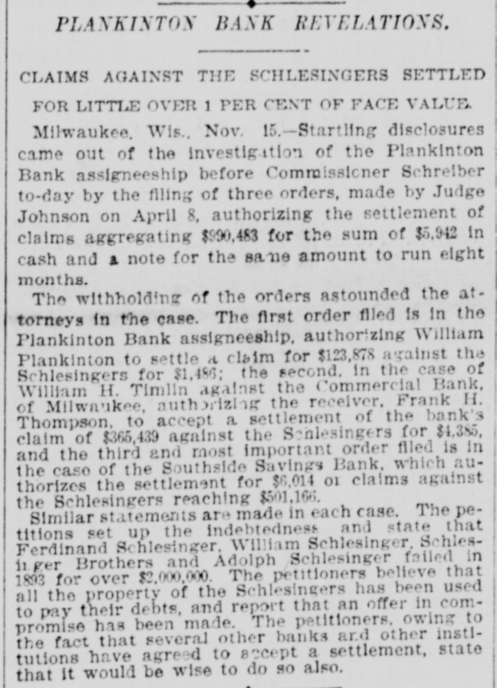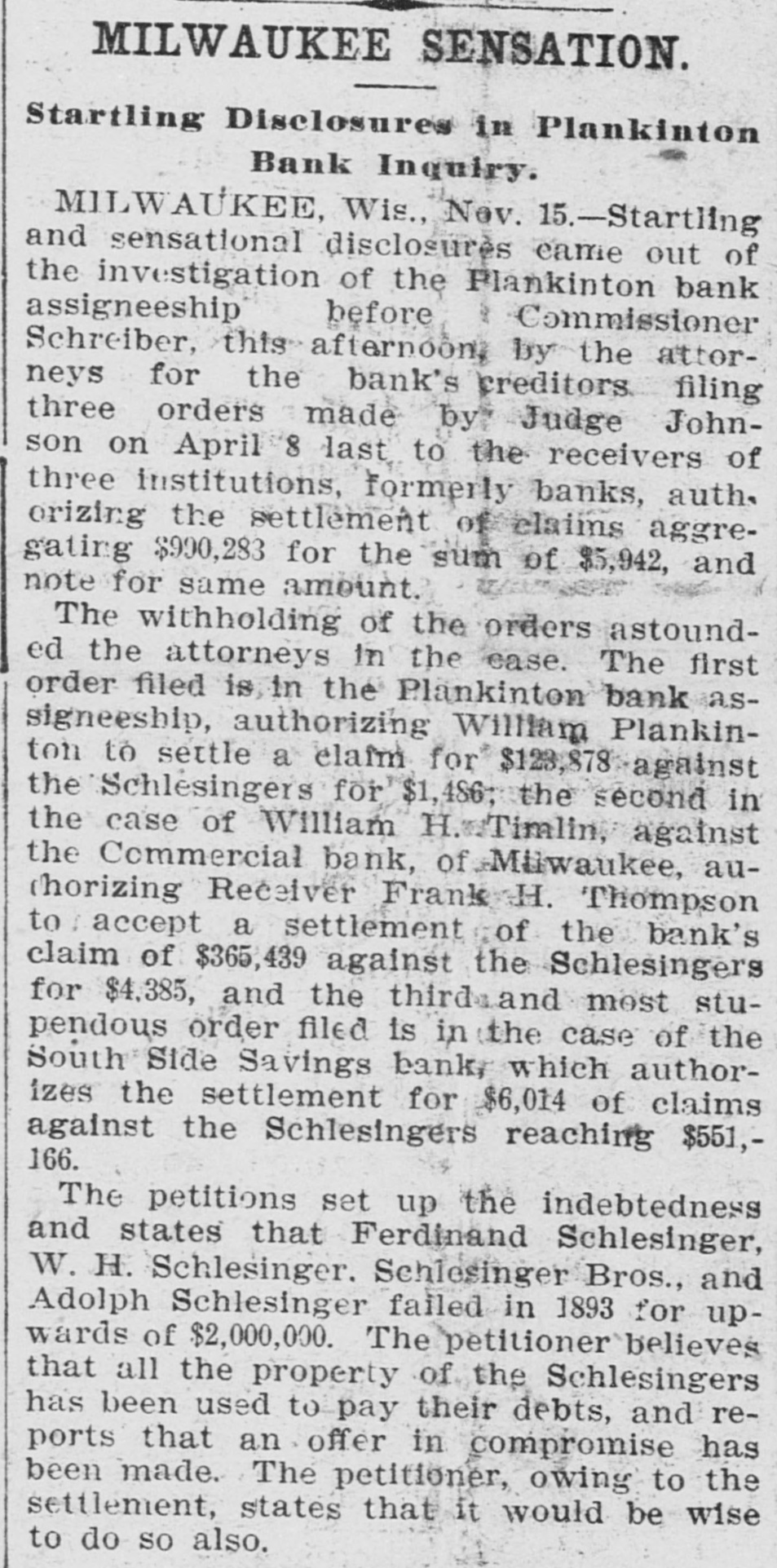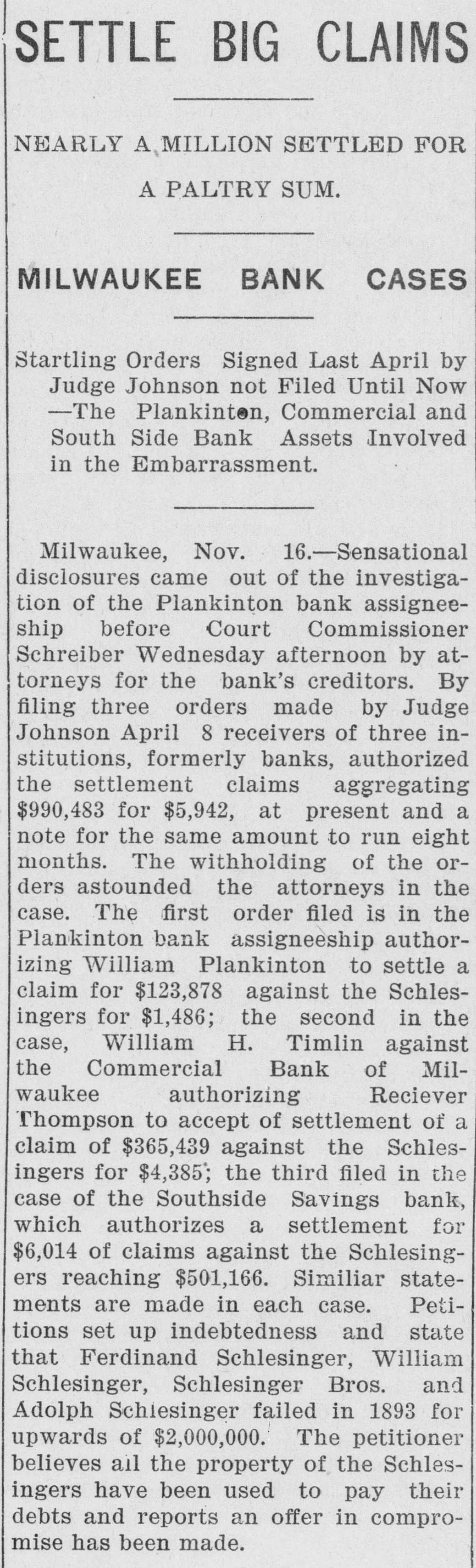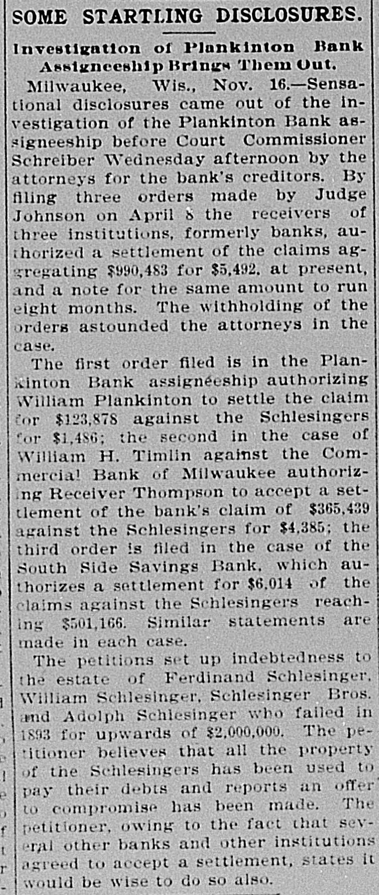 MILWAUKEE SENSATION. Startling Disclosures in Plankinton Bank Inquiry. MILWAUKEE, Wis., Nov. 15.-Startling and sensational disclosures came out of the investigation of the Plankinton bank assigneeship before Commissioner Schreiber, this afternoon, by the attorneys for the bank's creditors. filing three orders made by Judge Johnson on April 8 last to the receivers of three institutions, formerly banks, auth. orizing the settlement of claims aggregating $990,283 for the sum of $5,942, and note for same amount. The withholding of the orders astounded the attorneys in the case. The first order filed is in the Plankinton bank assigneeship, authorizing William Plankinton to settle a claim for $123,878 against the Schlesingers for $1,486; the second in the case of William against the Commercial bank, of Mtwaukee, au(horizing Receiver Frank H. Thompson to : accept a settlement of the bank's claim of $365,439 against the Schlesingers for $4,385, and the third and most stupendous order filed is in the case of the South Side Savings bank, which authorizes the settlement for $6,014 of claims against the Schlesingers reaching $551,166. The petitions set up the indebtedness and states that Ferdinand Schlesinger, W. H. Schlesinger. Schlesinger Bros., and Adolph Schlesinger failed in 1893 for upwards of $2,000,000. The petitioner believes that all the property of the Schlesingers has been used to pay their debts, and reports that an offer in compromise has been made. The petitioner, owing to the settlement, states that it would be wise to do so also.