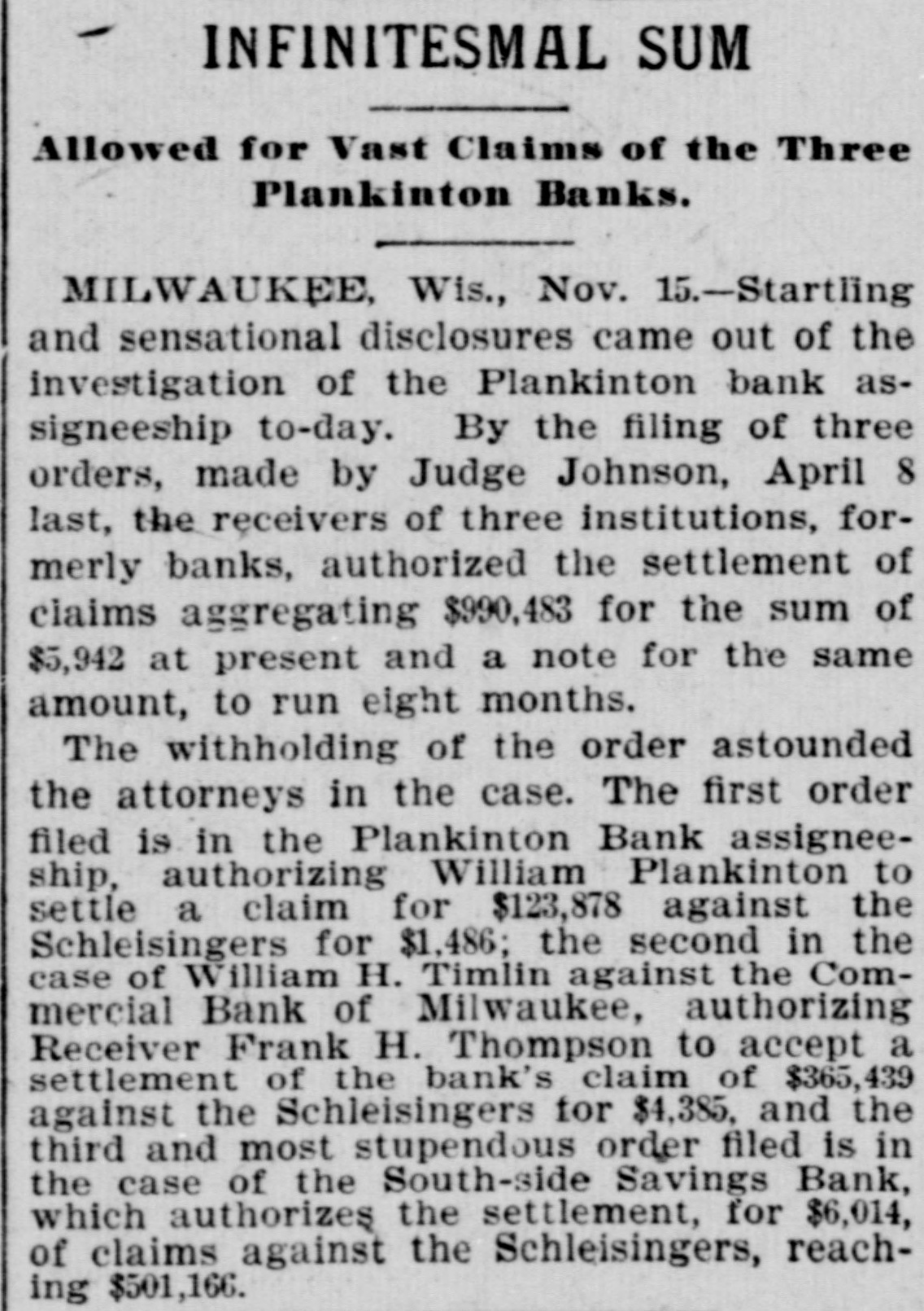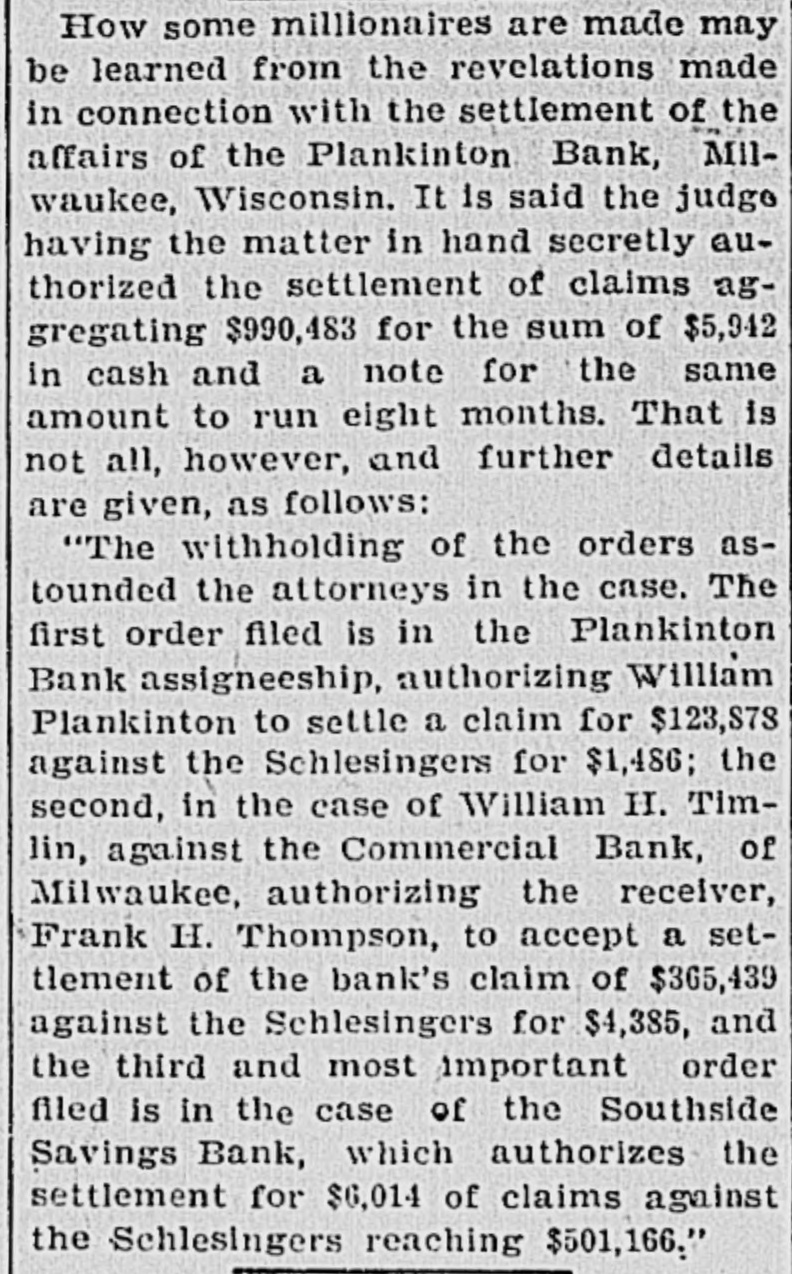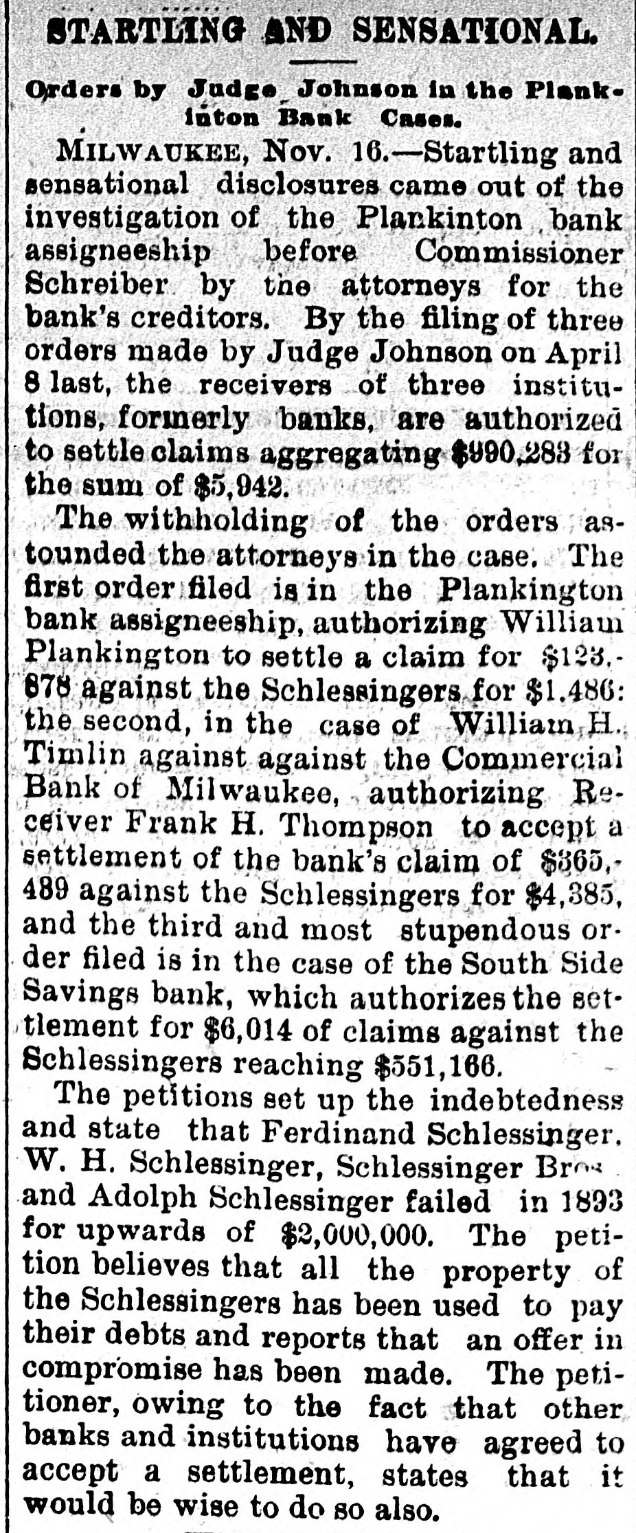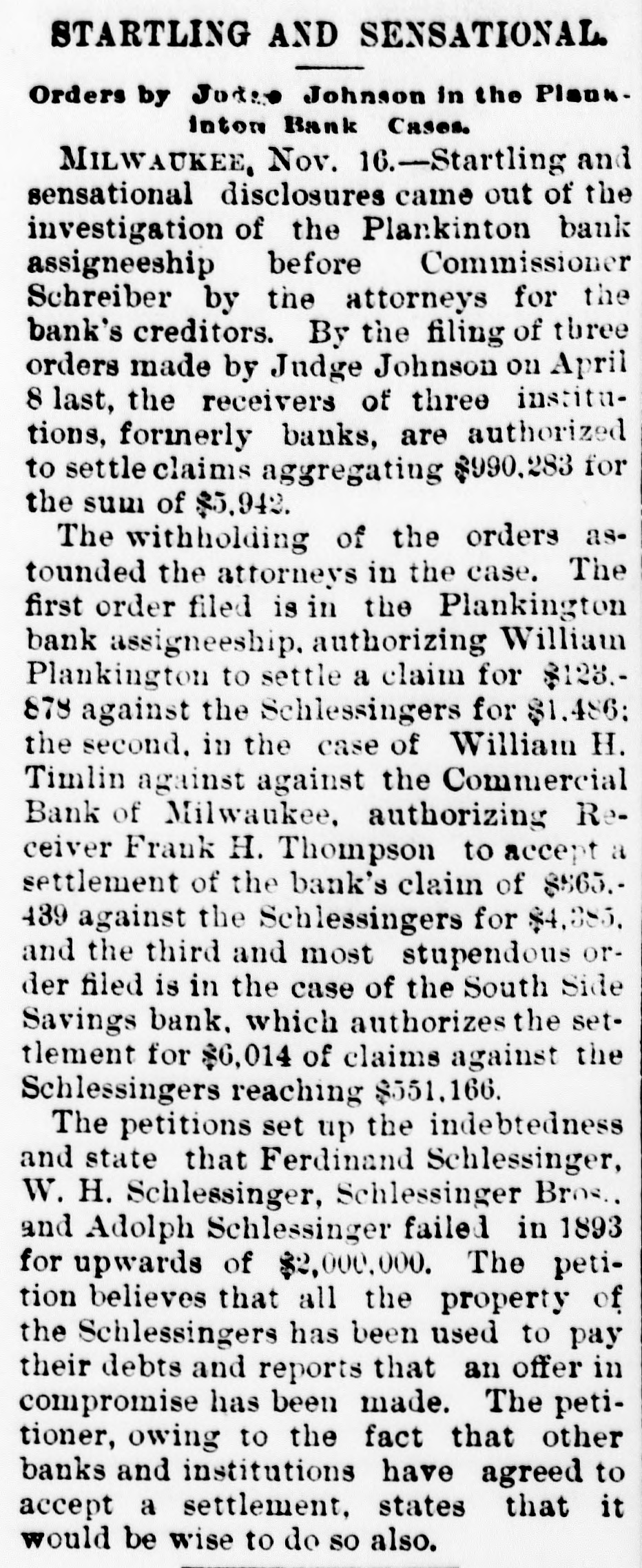 MILWAUKEE SENSATION. Startling Disclosures in Plankinton Bank Inquiry. MILWAUKEE, Wis., Nov. 15.-Startling and sensational disclosures came out of the investigation of the Plankinton bank assigneeship before Commissioner Schreiber, this afternoon, by the attorneys for the bank's creditors. filing three orders made by Judge Johnson on April 8 last to the receivers of three institutions, formerly banks, auth. orizing the settlement of claims aggregating $990,283 for the sum of $5,942, and note for same amount. The withholding of the orders astounded the attorneys in the case. The first order filed is in the Plankinton bank assigneeship, authorizing William Plankinton to settle a claim for $123,878 against the Schlesingers for $1,486; the second in the case of William against the Commercial bank, of Mtwaukee, au(horizing Receiver Frank H. Thompson to : accept a settlement of the bank's claim of $365,439 against the Schlesingers for $4,385, and the third and most stupendous order filed is in the case of the South Side Savings bank, which authorizes the settlement for $6,014 of claims against the Schlesingers reaching $551,166. The petitions set up the indebtedness and states that Ferdinand Schlesinger, W. H. Schlesinger. Schlesinger Bros., and Adolph Schlesinger failed in 1893 for upwards of $2,000,000. The petitioner believes that all the property of the Schlesingers has been used to pay their debts, and reports that an offer in compromise has been made. The petitioner, owing to the settlement, states that it would be wise to do so also.