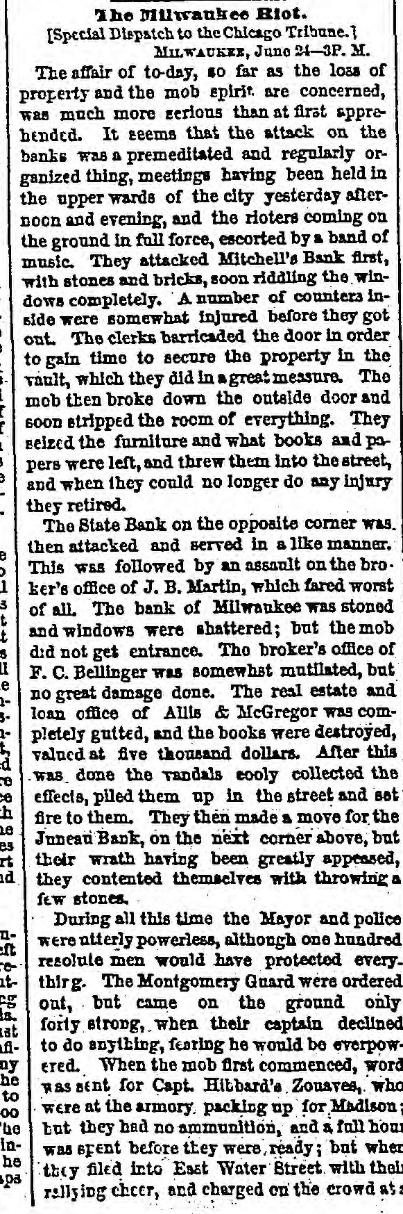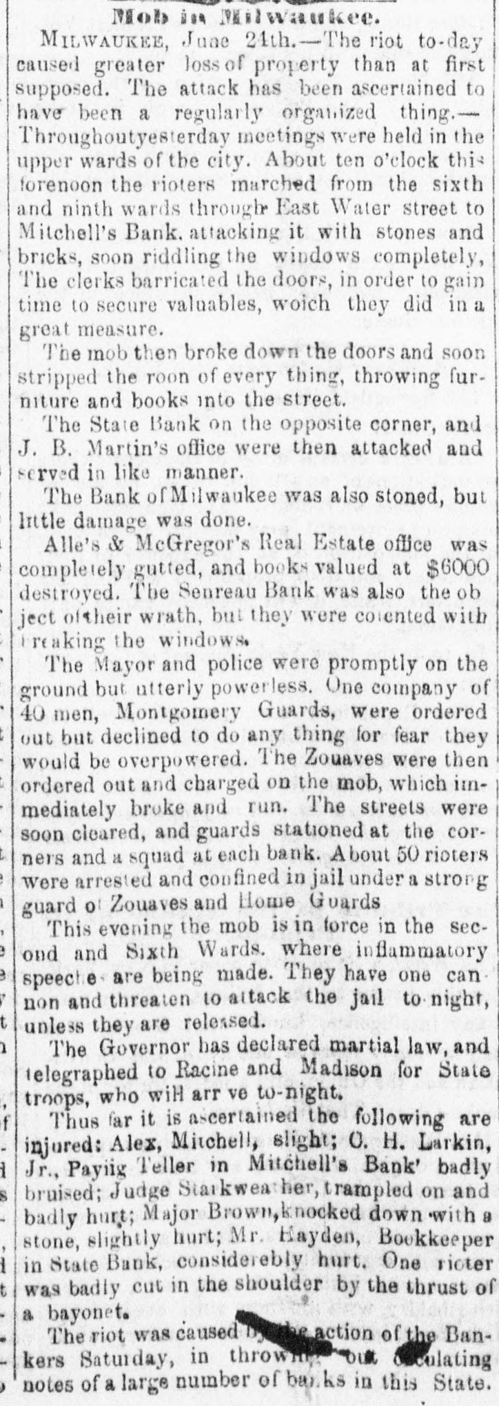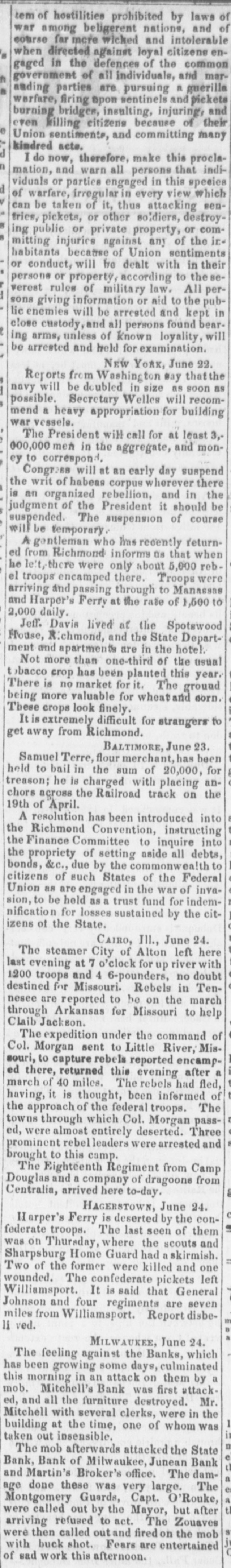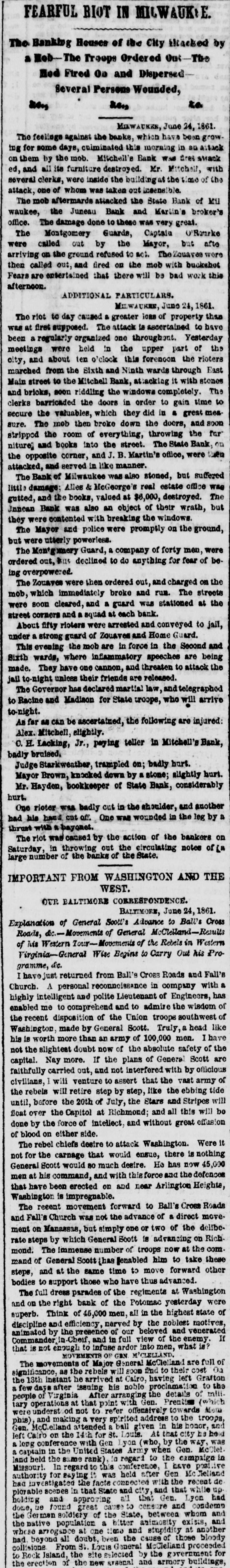 FEARFUL RIOT IN MILWAUKIE The Banking Houses of the City blacked by a Hob- The Troope Ordered Out-The Med Fired On and Dispersed Several Persons Wounded, to us, my MAWAUKES, June 24, 1861. The feelings against the banks, which have been grow ing for some days, cuiminated this morning in so attack on them by the mob. Mitchell's Bank was dres strack ed, and all its furniture destroyed. Mr. Mitchell, with several clerks, were inside the building as the time of the attack, one of whom was taken out insentible. The mob aftermards attacked the State Bank of Mil waukee, the Juneau Bank and Martin's broker's office. The damage done to these was very great. The Montgomery Guards, Captain O'Ranke were called out by the Mayor, but after arriving on the ground refused to act. The Zouavee were then called out, and fired on the mob with buckshot Fears are entertained that there will be bad work this afternoon. ADDITIONAL PARTICULAR AUREE, June 24,1861. The riot to day caused a greater loss of property than was at first supposed. The attack to ascertained to have been a regularly organized one throughout. Yesterday meetings were held in the upper part of the city, and about ten o'clock this forenoon the rioters marched from the Sixth and Ninth wards through East Main street to the Mitchell Bank, attacking it with stones and bricks, soon riddling the windows completely. The clerks barricaded the doors in order to gain time to secure the valuables, which they did in a great measure. The mob then broke down the doors, and soon stripped the room of everything, throwing the far niture] and books into the street. The State Bank, on the opposite corner, and J. B. Martin's office, were then attacked, and served in like manner. The Bank of Milwaukee was also stoned, but suffered little damage; Alles & McGeorge's real estate office was gutted, and the books, valued at $6,000, destroyed. The Janean Bank was also an object of their wrath, but they were contented with breaking the windows. The Mayor and police were promptly on the ground, but were utterly powerless. The Montgamery Guard, a company of forty men, were ordered out, Bus declined to do anything for fear of be ing overpowered. The Zouaves were then ordered out, and charged on the mob, which immediately broke and run. The streets were soon cleared, and a guard was stationed at the street corners and squad at each bank. About fifty rioters were arrested and conveyed to jail, under strong guard of Zouaves and Home Guard. This evening the mob are in force in the Second and Sixth wards, where infammatory speeches are being made. They have one cannon, and threaten to attack the jail to-night unless their friends are released. The Governor has declared martial law, and telegraphed to Racine and Madison for State troope, who will arrive to-night. As far as can be ascertained, the following are injured: Alex. Mitchell, elightly. C.H. Lacking, Jr., paying teller in Mitchell's Bank, badly bruised, Judge Starkweather, trampled on; badly hurt. Mayor Brown, knocked down by stone; slightly hurt. Mr. Hayden, bookkeeper of State Bank, considerably hurt. One rioter was badly out in the shoulder, and another had his hand cut off. One was wounded in the leg by a thrust with a bayonet. The riot was caused by the action of the bankers on Saturday, in throwing out the circulating notes of La large number of the banks of the State. IMPORTANT FROM WASHINGTON AND THE WEST. OUR BALTIMORE CORRESPONDENCE. BALTIMORE, June 24, 1861. Explanation of General Scott's Advance to Ball's Cross Roads, Movements of General McCleHand-Results of This Western Tour-Movements of the Rebels in Western Virginia-General Wise Begins to Carry Out his Programme, &c. I have just returned from Ball's Cross Roads and Fall's Church. A personal reconncissance in company with highly intelligent and polite Lieutenant of Engineers, has enabled me to comprehend and to admire the wisdom of the recent disposition of the Union troops southwest of Washington, made by General Scott. Truly a head like his is worth more than an army of 100,000 men. I have not the slightest doubt now of the absolute safety of the capital. Nay more. If the plans of General Scott are faithfully carried out, and not interfered with by officious civilians, will venture to assert that the vast army of the rebels will retire step by step, like the ebbing tide until, before the 20th of July, the Stars and Stripes will float over the Capitol at Richmond; and all this will be done by the force of intellect, and without great effusion of blood on either side. The rebel chiefs desire to attack Washington. Were it not for the carnage that would ensue, there is nothing General Scott would so much desire. He has now 45,000 men at his command, and with this force and the defences that have been erected on and near Arlington Heighte, Washington is impregnable. The recent movement forward to Ball's Cross Roads and Fall's Church was not the advance of & direct movement on Manassas, but simply one or two of the deliberate steps by which General Scott is advancing on Richmond. The immense number of troops now at the com. mand of General Scott (has enabled him to take these other steps, and at the same time to move forward bodies to support those who have thus advanced. The full dress parades of the regiments at Washington and on the right bank of the Potomac yesterday were superb. Think of 45,000 men, all in the highest state of discipline and efficiency, nerved by the noblest motives, animated by the presence of our beloved and venerated If in Cheif, and in full view of the enemy. Commander that is not enough to infuse ardor into men, what is? M'CLELLAND. GBN MOVEMENTS OF full are of McClelland The movements of Major General find to their cost as the rebels will good Grafton significance, instant he arrived at Cairo, having left the 13th bis noble proclamation to the a few days after issuing miliAfter arranging the details of that point people Virginia wit
