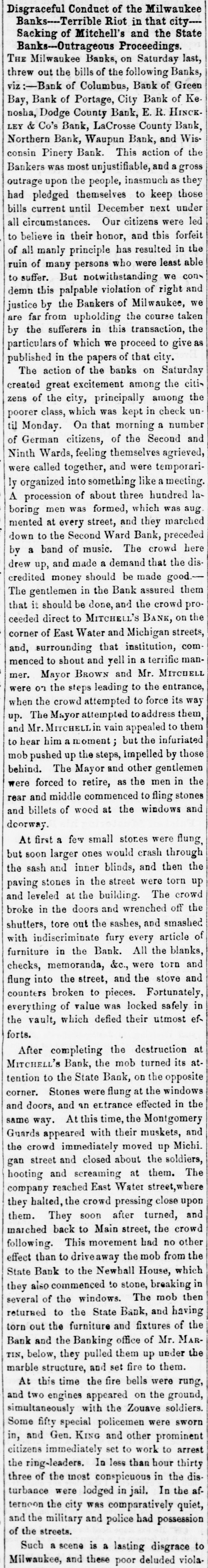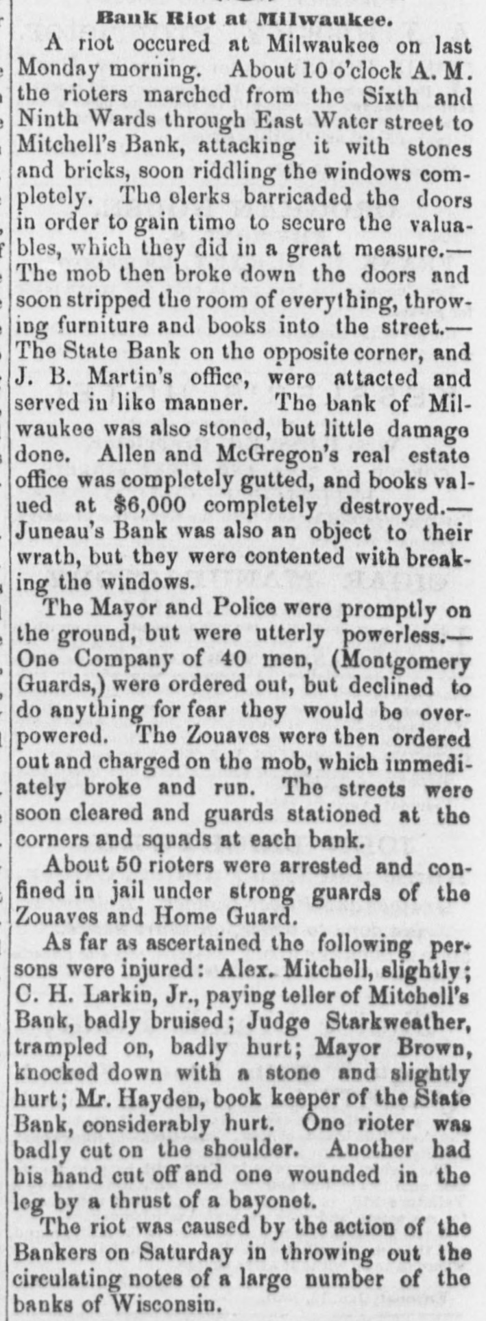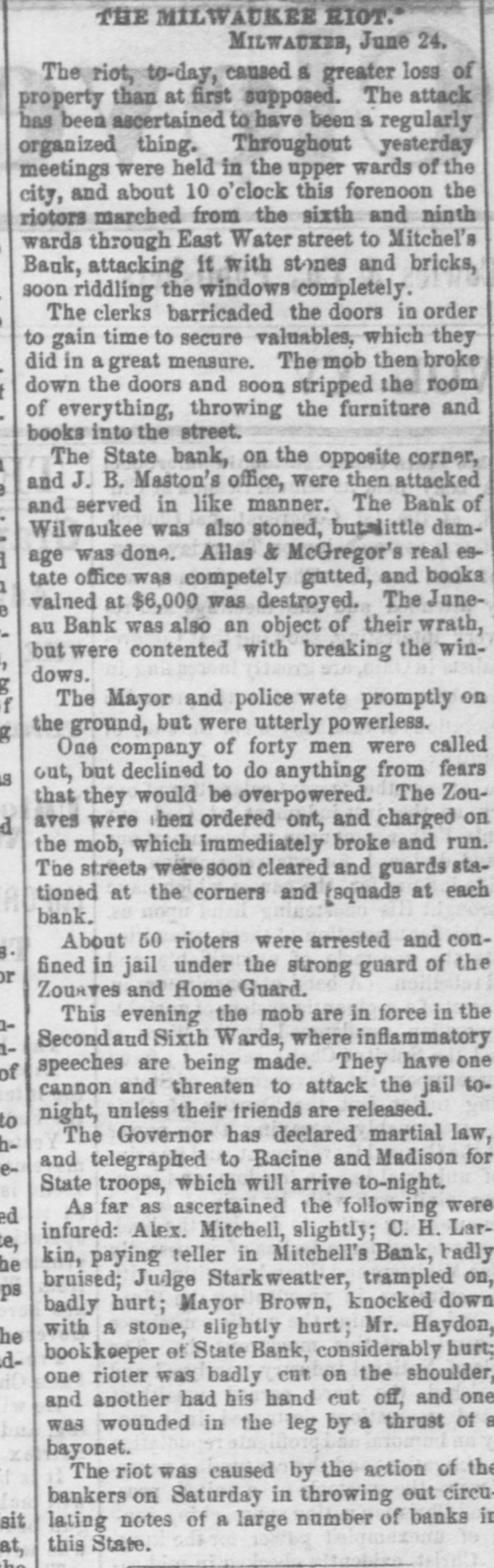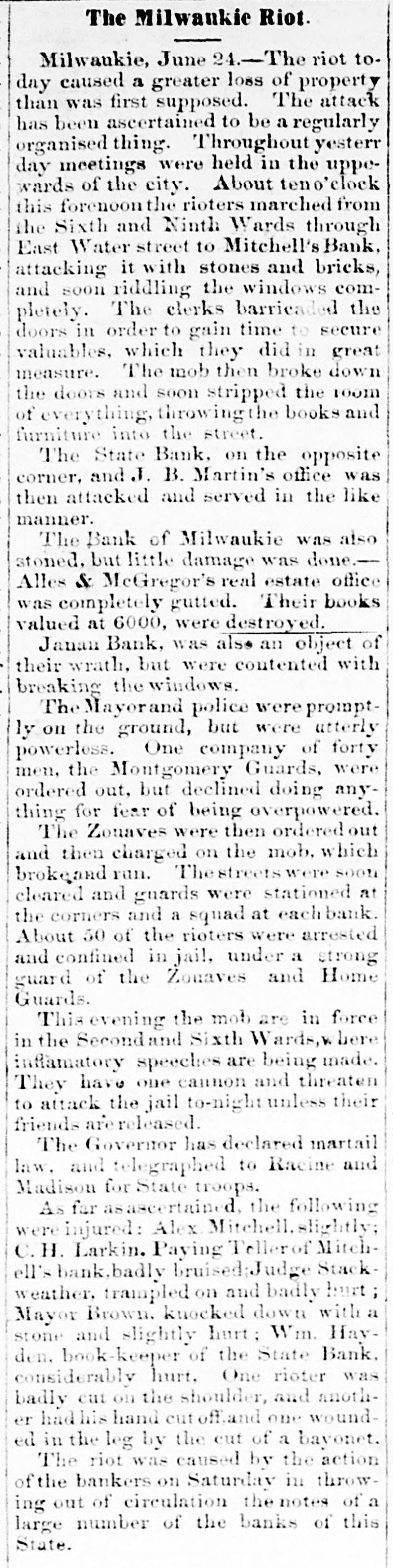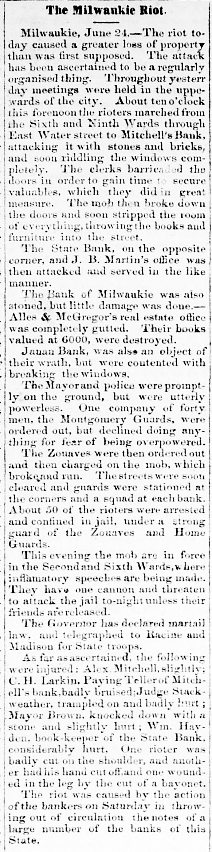 FEARFUL RIOT IN MILWAUKIE The Banking Houses of the City blacked by a Hob- The Troope Ordered Out-The Med Fired On and Dispersed Several Persons Wounded, to us, my MAWAUKES, June 24, 1861. The feelings against the banks, which have been grow ing for some days, cuiminated this morning in so attack on them by the mob. Mitchell's Bank was dres strack ed, and all its furniture destroyed. Mr. Mitchell, with several clerks, were inside the building as the time of the attack, one of whom was taken out insentible. The mob aftermards attacked the State Bank of Mil waukee, the Juneau Bank and Martin's broker's office. The damage done to these was very great. The Montgomery Guards, Captain O'Ranke were called out by the Mayor, but after arriving on the ground refused to act. The Zouavee were then called out, and fired on the mob with buckshot Fears are entertained that there will be bad work this afternoon. ADDITIONAL PARTICULAR AUREE, June 24,1861. The riot to day caused a greater loss of property than was at first supposed. The attack to ascertained to have been a regularly organized one throughout. Yesterday meetings were held in the upper part of the city, and about ten o'clock this forenoon the rioters marched from the Sixth and Ninth wards through East Main street to the Mitchell Bank, attacking it with stones and bricks, soon riddling the windows completely. The clerks barricaded the doors in order to gain time to secure the valuables, which they did in a great measure. The mob then broke down the doors, and soon stripped the room of everything, throwing the far niture] and books into the street. The State Bank, on the opposite corner, and J. B. Martin's office, were then attacked, and served in like manner. The Bank of Milwaukee was also stoned, but suffered little damage; Alles & McGeorge's real estate office was gutted, and the books, valued at $6,000, destroyed. The Janean Bank was also an object of their wrath, but they were contented with breaking the windows. The Mayor and police were promptly on the ground, but were utterly powerless. The Montgamery Guard, a company of forty men, were ordered out, Bus declined to do anything for fear of be ing overpowered. The Zouaves were then ordered out, and charged on the mob, which immediately broke and run. The streets were soon cleared, and a guard was stationed at the street corners and squad at each bank. About fifty rioters were arrested and conveyed to jail, under strong guard of Zouaves and Home Guard. This evening the mob are in force in the Second and Sixth wards, where infammatory speeches are being made. They have one cannon, and threaten to attack the jail to-night unless their friends are released. The Governor has declared martial law, and telegraphed to Racine and Madison for State troope, who will arrive to-night. As far as can be ascertained, the following are injured: Alex. Mitchell, elightly. C.H. Lacking, Jr., paying teller in Mitchell's Bank, badly bruised, Judge Starkweather, trampled on; badly hurt. Mayor Brown, knocked down by stone; slightly hurt. Mr. Hayden, bookkeeper of State Bank, considerably hurt. One rioter was badly out in the shoulder, and another had his hand cut off. One was wounded in the leg by a thrust with a bayonet. The riot was caused by the action of the bankers on Saturday, in throwing out the circulating notes of La large number of the banks of the State. IMPORTANT FROM WASHINGTON AND THE WEST. OUR BALTIMORE CORRESPONDENCE. BALTIMORE, June 24, 1861. Explanation of General Scott's Advance to Ball's Cross Roads, Movements of General McCleHand-Results of This Western Tour-Movements of the Rebels in Western Virginia-General Wise Begins to Carry Out his Programme, &c. I have just returned from Ball's Cross Roads and Fall's Church. A personal reconncissance in company with highly intelligent and polite Lieutenant of Engineers, has enabled me to comprehend and to admire the wisdom of the recent disposition of the Union troops southwest of Washington, made by General Scott. Truly a head like his is worth more than an army of 100,000 men. I have not the slightest doubt now of the absolute safety of the capital. Nay more. If the plans of General Scott are faithfully carried out, and not interfered with by officious civilians, will venture to assert that the vast army of the rebels will retire step by step, like the ebbing tide until, before the 20th of July, the Stars and Stripes will float over the Capitol at Richmond; and all this will be done by the force of intellect, and without great effusion of blood on either side. The rebel chiefs desire to attack Washington. Were it not for the carnage that would ensue, there is nothing General Scott would so much desire. He has now 45,000 men at his command, and with this force and the defences that have been erected on and near Arlington Heighte, Washington is impregnable. The recent movement forward to Ball's Cross Roads and Fall's Church was not the advance of & direct movement on Manassas, but simply one or two of the deliberate steps by which General Scott is advancing on Richmond. The immense number of troops now at the com. mand of General Scott (has enabled him to take these other steps, and at the same time to move forward bodies to support those who have thus advanced. The full dress parades of the regiments at Washington and on the right bank of the Potomac yesterday were superb. Think of 45,000 men, all in the highest state of discipline and efficiency, nerved by the noblest motives, animated by the presence of our beloved and venerated If in Cheif, and in full view of the enemy. Commander that is not enough to infuse ardor into men, what is? M'CLELLAND. GBN MOVEMENTS OF full are of McClelland The movements of Major General find to their cost as the rebels will good Grafton significance, instant he arrived at Cairo, having left the 13th bis noble proclamation to the a few days after issuing miliAfter arranging the details of that point people Virginia wit