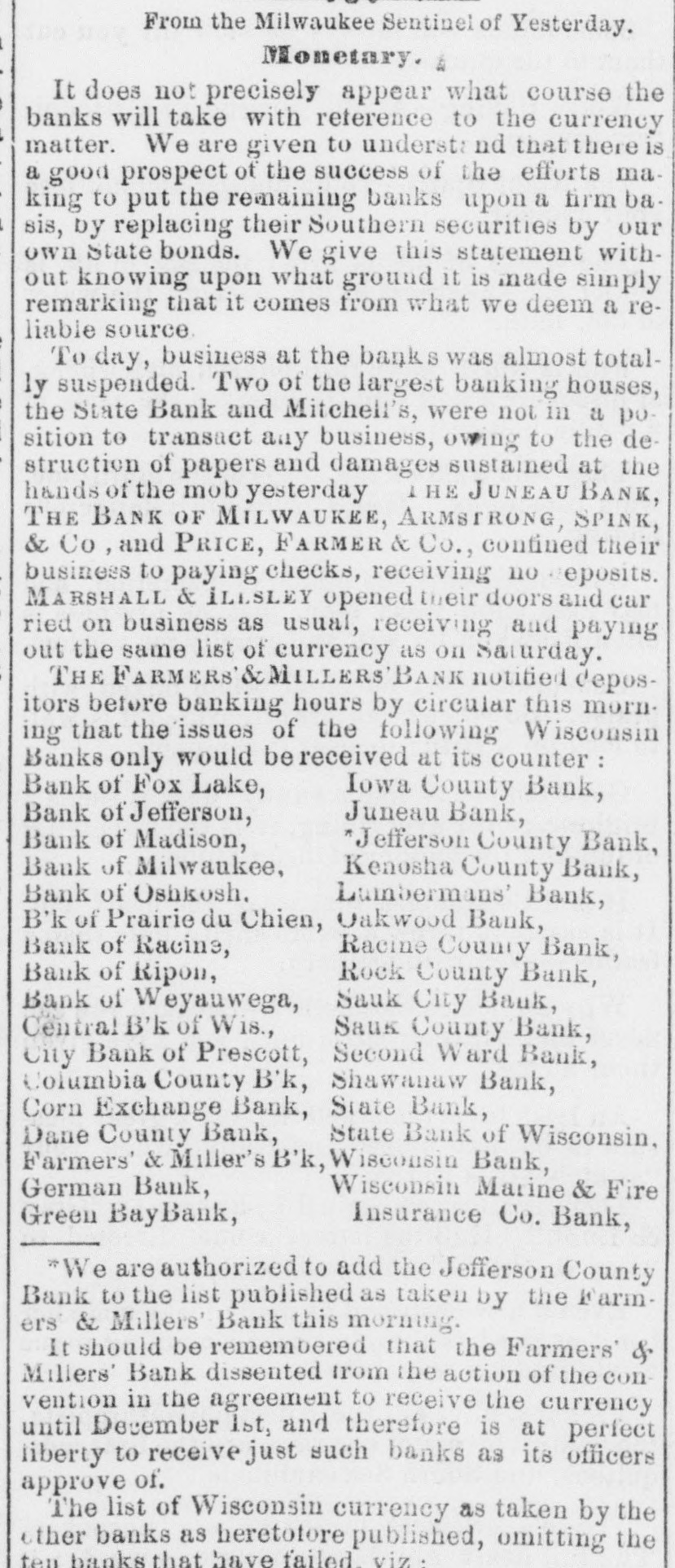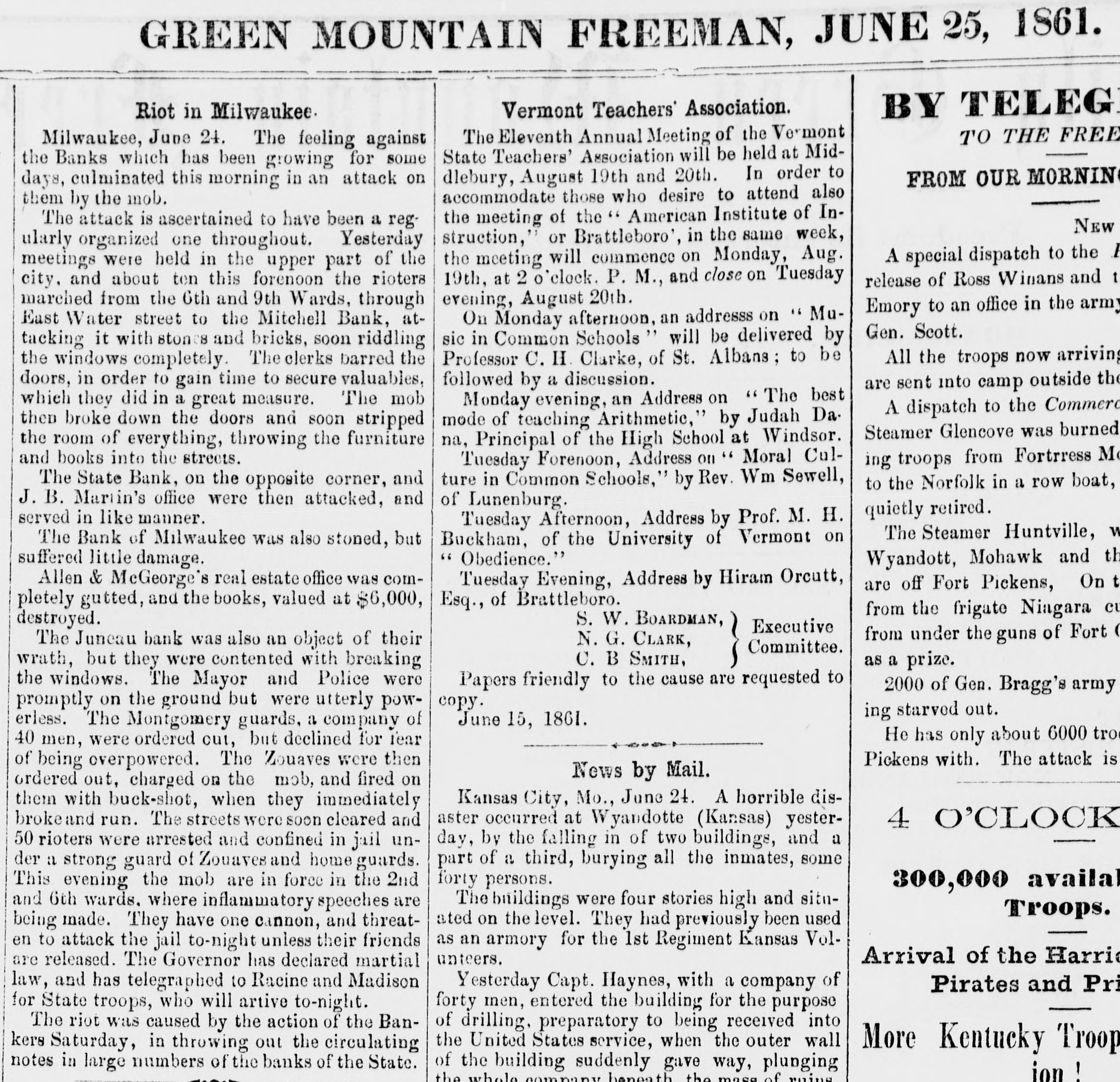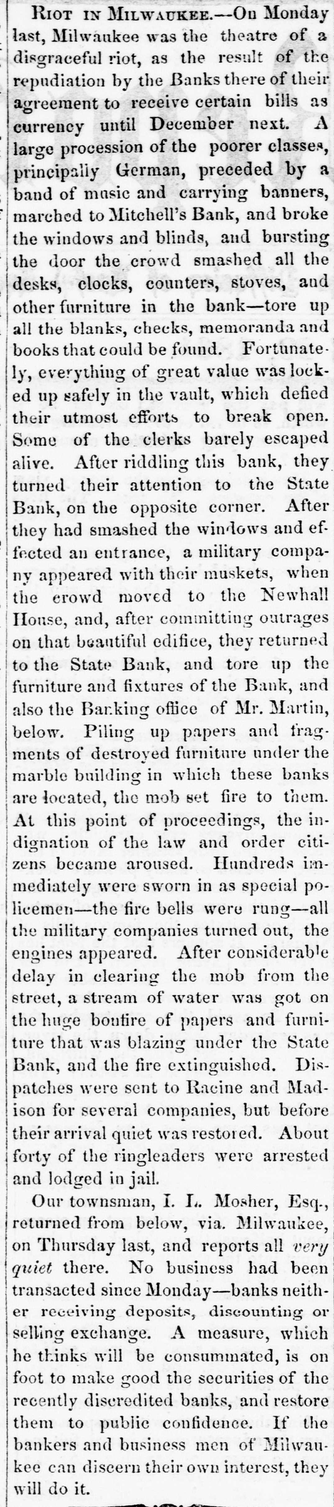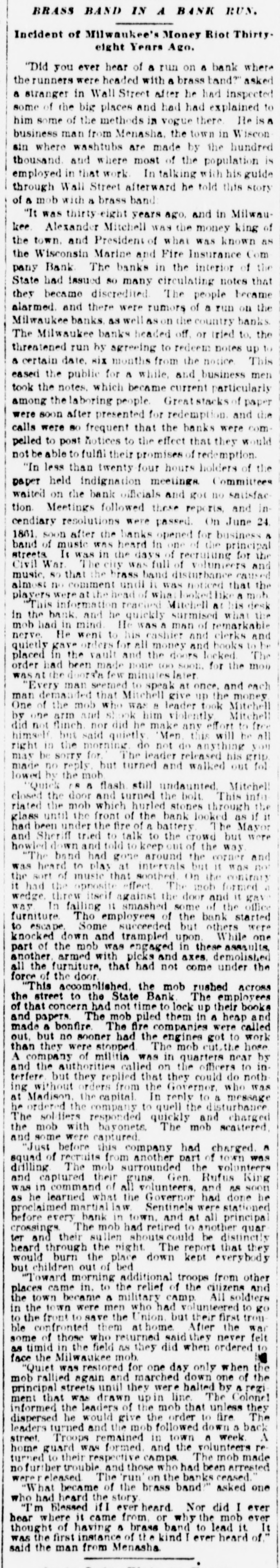 FEARFUL RIOT IN MILWAUKIE The Banking Houses of the City blacked by a Hob- The Troope Ordered Out-The Med Fired On and Dispersed Several Persons Wounded, to us, my MAWAUKES, June 24, 1861. The feelings against the banks, which have been grow ing for some days, cuiminated this morning in so attack on them by the mob. Mitchell's Bank was dres strack ed, and all its furniture destroyed. Mr. Mitchell, with several clerks, were inside the building as the time of the attack, one of whom was taken out insentible. The mob aftermards attacked the State Bank of Mil waukee, the Juneau Bank and Martin's broker's office. The damage done to these was very great. The Montgomery Guards, Captain O'Ranke were called out by the Mayor, but after arriving on the ground refused to act. The Zouavee were then called out, and fired on the mob with buckshot Fears are entertained that there will be bad work this afternoon. ADDITIONAL PARTICULAR AUREE, June 24,1861. The riot to day caused a greater loss of property than was at first supposed. The attack to ascertained to have been a regularly organized one throughout. Yesterday meetings were held in the upper part of the city, and about ten o'clock this forenoon the rioters marched from the Sixth and Ninth wards through East Main street to the Mitchell Bank, attacking it with stones and bricks, soon riddling the windows completely. The clerks barricaded the doors in order to gain time to secure the valuables, which they did in a great measure. The mob then broke down the doors, and soon stripped the room of everything, throwing the far niture] and books into the street. The State Bank, on the opposite corner, and J. B. Martin's office, were then attacked, and served in like manner. The Bank of Milwaukee was also stoned, but suffered little damage; Alles & McGeorge's real estate office was gutted, and the books, valued at $6,000, destroyed. The Janean Bank was also an object of their wrath, but they were contented with breaking the windows. The Mayor and police were promptly on the ground, but were utterly powerless. The Montgamery Guard, a company of forty men, were ordered out, Bus declined to do anything for fear of be ing overpowered. The Zouaves were then ordered out, and charged on the mob, which immediately broke and run. The streets were soon cleared, and a guard was stationed at the street corners and squad at each bank. About fifty rioters were arrested and conveyed to jail, under strong guard of Zouaves and Home Guard. This evening the mob are in force in the Second and Sixth wards, where infammatory speeches are being made. They have one cannon, and threaten to attack the jail to-night unless their friends are released. The Governor has declared martial law, and telegraphed to Racine and Madison for State troope, who will arrive to-night. As far as can be ascertained, the following are injured: Alex. Mitchell, elightly. C.H. Lacking, Jr., paying teller in Mitchell's Bank, badly bruised, Judge Starkweather, trampled on; badly hurt. Mayor Brown, knocked down by stone; slightly hurt. Mr. Hayden, bookkeeper of State Bank, considerably hurt. One rioter was badly out in the shoulder, and another had his hand cut off. One was wounded in the leg by a thrust with a bayonet. The riot was caused by the action of the bankers on Saturday, in throwing out the circulating notes of La large number of the banks of the State. IMPORTANT FROM WASHINGTON AND THE WEST. OUR BALTIMORE CORRESPONDENCE. BALTIMORE, June 24, 1861. Explanation of General Scott's Advance to Ball's Cross Roads, Movements of General McCleHand-Results of This Western Tour-Movements of the Rebels in Western Virginia-General Wise Begins to Carry Out his Programme, &c. I have just returned from Ball's Cross Roads and Fall's Church. A personal reconncissance in company with highly intelligent and polite Lieutenant of Engineers, has enabled me to comprehend and to admire the wisdom of the recent disposition of the Union troops southwest of Washington, made by General Scott. Truly a head like his is worth more than an army of 100,000 men. I have not the slightest doubt now of the absolute safety of the capital. Nay more. If the plans of General Scott are faithfully carried out, and not interfered with by officious civilians, will venture to assert that the vast army of the rebels will retire step by step, like the ebbing tide until, before the 20th of July, the Stars and Stripes will float over the Capitol at Richmond; and all this will be done by the force of intellect, and without great effusion of blood on either side. The rebel chiefs desire to attack Washington. Were it not for the carnage that would ensue, there is nothing General Scott would so much desire. He has now 45,000 men at his command, and with this force and the defences that have been erected on and near Arlington Heighte, Washington is impregnable. The recent movement forward to Ball's Cross Roads and Fall's Church was not the advance of & direct movement on Manassas, but simply one or two of the deliberate steps by which General Scott is advancing on Richmond. The immense number of troops now at the com. mand of General Scott (has enabled him to take these other steps, and at the same time to move forward bodies to support those who have thus advanced. The full dress parades of the regiments at Washington and on the right bank of the Potomac yesterday were superb. Think of 45,000 men, all in the highest state of discipline and efficiency, nerved by the noblest motives, animated by the presence of our beloved and venerated If in Cheif, and in full view of the enemy. Commander that is not enough to infuse ardor into men, what is? M'CLELLAND. GBN MOVEMENTS OF full are of McClelland The movements of Major General find to their cost as the rebels will good Grafton significance, instant he arrived at Cairo, having left the 13th bis noble proclamation to the a few days after issuing miliAfter arranging the details of that point people Virginia wit
