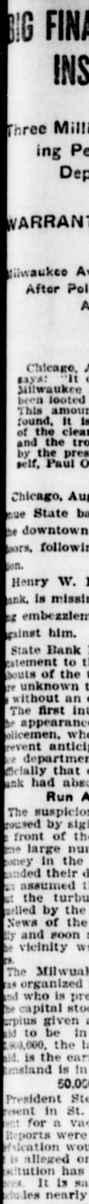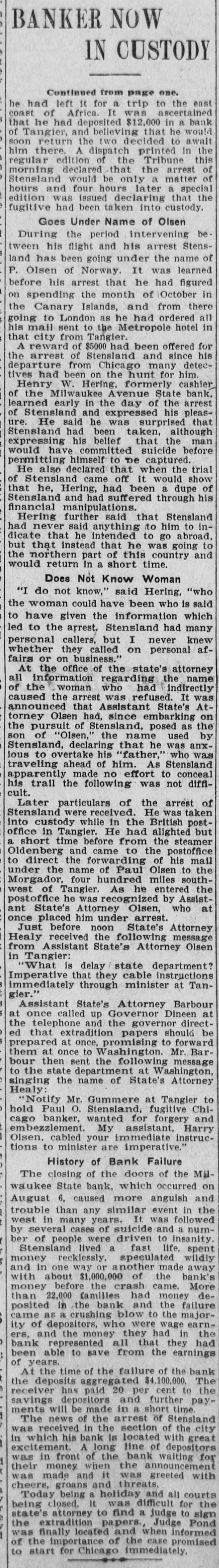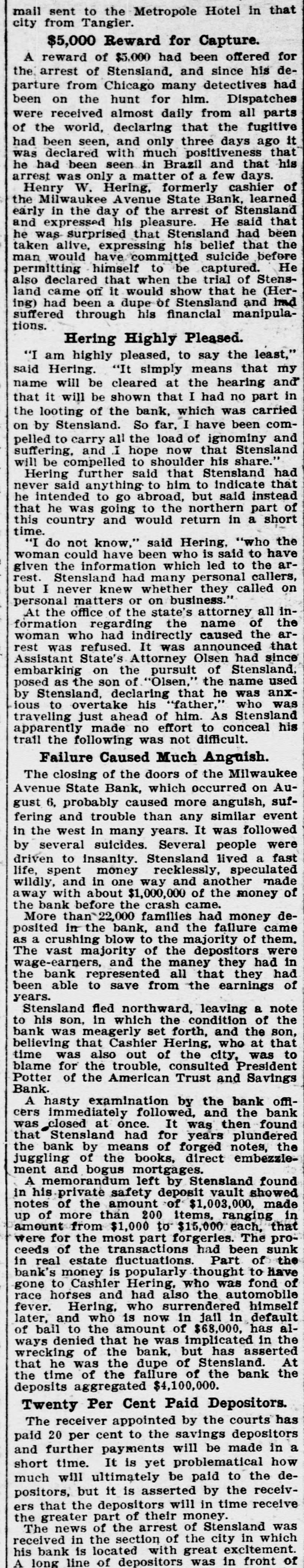 that sent to the Metropole Hotel in mail city from Tangier. for $5,000 Reward for been Capture. offered reward of $5,000 had and since his deA arrest of Stensland, detectives had the from Chicago for many him. Dispatches parture been received on the hunt almost daily that from the all fugitive parts were world, declaring three days ago it of the been seen, and much only positiveness that his had declared with in Brazil and days. that was had been seen matter of a few cashier of arrest he was only Hering, a formerly Bank, learned Henry Milwaukee W. Avenue of the State arrest of said Stensland that alive, the early and he was expressed in surprised the day expressing his that pleasure. Stensland his belief suicide He had that before been the He man taken permitting would himself have . committed that when to be the captured. trial that of he Stens- (Heralso declared on it would Stensland and land had came been a dupe of financial tions. suffered ing) through his show manipula- had least,' Hering Highly Pleased. the "I am highly "It pleased, simply to means say hearing that and my said will be cleared I had no part name Hering. be shown that at the was carried in that it will of the bank, which have been by all the load of that on the looting Stensland. carry So far. I ignominy Stensland com- and pelled to and I hope shoulder now his share. will be compelled said that indicate that Hering anything to him but said instead of suffering. said further to abroad, to Stensland part had never he intended was to going go to the return northern in a short do not know," been who is said the could which time. that woman this "I country he information and have would said Hering, personal led to "who to callers, have the argiven the Stensland had whether many they called on personal rest. but I never office matters knew of the or on state's the business." attorney name of the all the ar- information At the regarding had indirectly announced caused that woman who It was Olsen had since rest was State's refused. Attorney of Stensland. used on of "Olsen." was anxembarking Assistant the son the pursuit that the he name was posed Stensland, as declaring his "father." Stensland who ious by to overtake just ahead of effort him. to As conceal his traveling made no not difficult. trail apparently the following Caused was Much Anguish. Failure the Milwaukee The closing of Bank, the doors which of occurred anguish, on suf- AuAvenue State caused more similar event gust 6, and probably trouble than any It was followed in fering the several west in suicides. many Stensland years. Several lived people a were fast driven by to insanity. money recklessly, another speculated made life, spent and in one $1,000,000 way and of the money of wildly. with about crash came. deaway the bank than before 22,000 the families and the had failure money them. came posited More crushing in the blow bank. to of the the majority depositors of had were in as The a vast majority the maney they they had the wage-earn represented bank able to and save from all the that earnings of note been years. fled northward, "condition leaving a of the Stensland in which the forth, and the son, to his was son, meagerly set Hering. who was at that to bank believing that also Cashier out of the city, 'President of blame time was for the the American trouble, consulted Trust and Savings offiPotter Bank. examination by the and bank the bank A hasty immediately followed, It was then found cers was closed at once. had for years notes, plundered the that Stensland by means of forged embezziejuggling the ment bank and of bogus the mortgages. books, left by direct Stensland found A safety of $1,003,000, in in his the amount items, ranging notes memorandum private of 200 deposit vault each, showed made that amount up of more from than $1,000 part to forgeries. $15,000 The sunk prowere for the transactions of real estate is popularly was fond in ceeds of money the most fluctuations. who thought had Part been to have the of bank's to Cashier Hering, had also the automobile himself gone horses and who surrendered default who is now of in $68,000. has later, to the amount was implicated race of fever. ball and Hering, that he jail has in asserted in the al- At ways denied of the bank, but Stensland. wrecking that he was the the failure dupe of of the bank the deposits the time aggregated of Cent $4,100,000. Paid Depositors. Twenty receiver Per appointed by the courts depositors has The 20 per cent to the will savings be made in a and paid further payments yet problematical how deshort time. ultimately It is be paid to the receivmuch will but it is asserted by time the receive positors, ers the The that greater news the of part depositors the of arrest their of will money. of the in Stensland city excitement. in which was his received bank line is located of depositors was in in the section with great front of A long