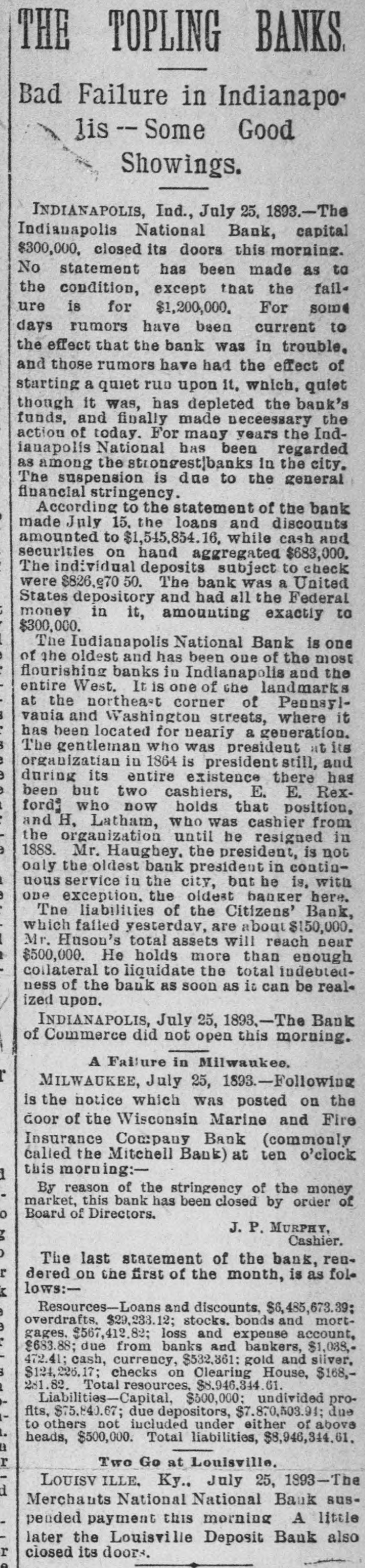 THE TOPLING BANKS Bad Failure in Indianapo lis -- Some Good Showings. INDIANAPOLIS, Ind., July 25. 1893.-The Indianapolis National Bank, capital $300,000. closed its doors this morning. No statement has been made as to the condition, except that the fail ure is for $1,200,000. For some days rumors have been current to the effect that the bank was in trouble. and those rumors have had the effect of starting a quiet run upon 11, which, quiet though it was, has depleted the bank's funds, and finally made neceessary the action of today. For many years the Indiauapolis National has been regarded as among the strongest|banks in the city. The suspension is due to the general financial stringency. According to the statement of the bank made July 15, the loans and discounts amounted to $1,545,854.16, while cash and securities on hand aggregated $683,000. The individual deposits subject to check were $826,e70 The bank was a United States depository and had all the Federal ; money in it, amounting exactly to $300,000. The Indianapolis National Bank is one of the oldest and has been one of the most : flourishing banks in Indianapolis and the entire West. It is one of the landmarks at the northeast corner of Pennsyl3 vania and Washington streets, where it : has been located for nearly a generation. 3 The gentleman who was president at its e organizatian in 1864 is president still, and 9 during its entire existence there has ) been but two cashiers, E. E. Rex1 ford who now holds that position, : and H, Latham, who was cashier from the organization until he resigned in e 1888. Mr. Haughey. the president, is not only the oldest bank president in contin1 uous service in the city, but be is, with 9 one exception. the oldest banker here. The liabilities of the Citizens' Bank, which falled yesterday, are about $150,000. I Mr. Huson's total assets will reach near I $500,000. He holds more than enough collateral to liquidate the total indebtedness of the bank as soon as it can be realized upon. INDIANAPOLIS, July 25, 1893,-The Bank of Commerce did not open this morning. A Failure in Milwaukee. r MILWAUKEE, July 25, 1893.-Following is the notice which was posted on the Goor of the Wisconsin Marine and Fire Insurance Company Bank (commonly called the Mitchell Bank) at ten o'clock this morning:1 By reason of the stringency of the money market, this bank has been closed by order of Board of Directors. o J. P. MURPHY, No Cashier. ) The last statement of the bank, renr dered on the first of the month, is as fol lows:K Resources-Loans and discounts. $6,485,673.39; ) overdrafts, $29,233.12; stocks. bonds and mort9 gages, $567,412.82; loss and expense account, : $683.88; due from banks and bankers, $1,083,472.41; cash, currency, $532,361: gold and silver, 3 $124,226.17; checks on Clearing House, $168,i 231.82. Total resources, $8,946,344.61. Liabilities-Capital, $500,000; undivided profits, $75,840.67; due depositors, $7.870.503.94; due to others not included under either of above 1. heads, $500,000. Total liabilities, $8,946,344.61. a r Two Go at Louisville, LOUISV ILLE, Ky.. July 25, 1893-The d Merchants National National Bank suspended payment this morning A little later the Louisville Deposit Bank also r closed its doors. e