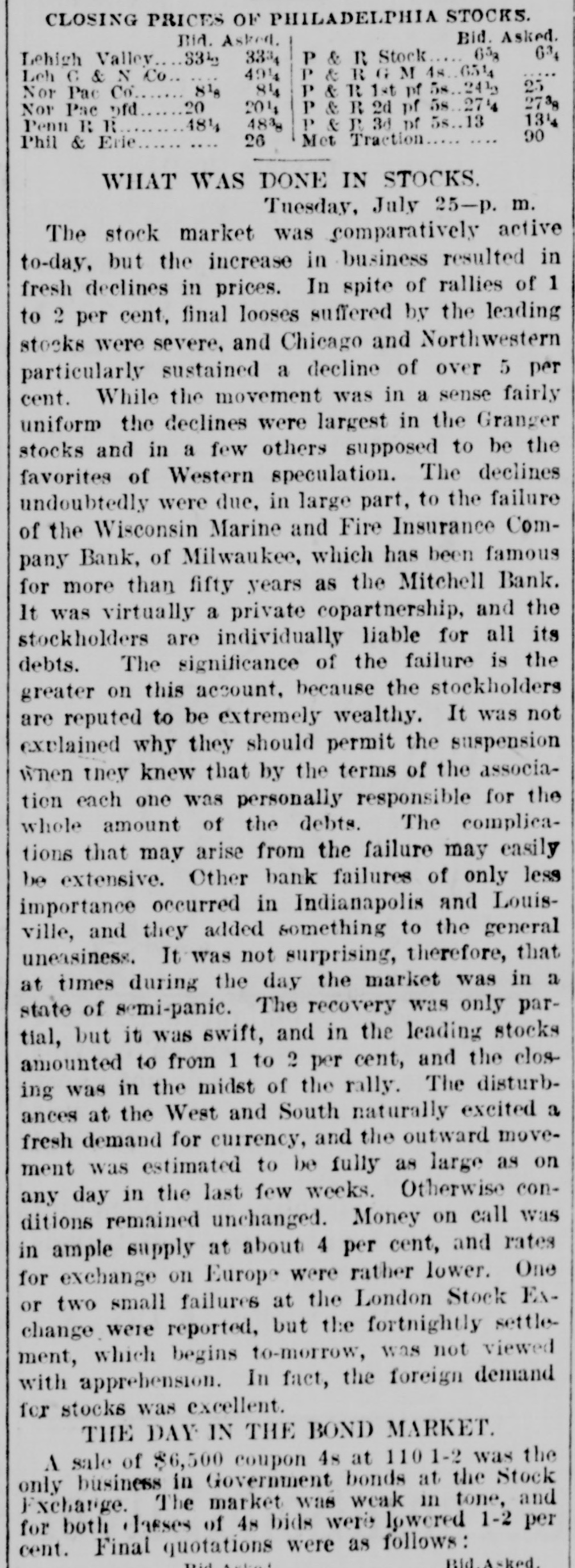 CLOSING PRICES OF PHILADELPHIA STOCKS. Bid. Asked. Bid. Asked. 63, 65g P & R Stock Lehigh Valley 33½ 3334 P & R G M 4s 6514 494 Leh C & N Co 25 84 P & R 1st nf 58 2412 81₈ Nor Pac Co 2738 20 P & R 2d of 58 274 204 Nor Pac ofd 134 P & R 3d of 5s 13 48³₈ Penn R R 48½ 90 Met Traction 26 Phil & Erie WHAT WAS DONE IN STOCKS. Tuesday, July 25-p. m. The stock market was comparatively active to-day, but the increase in business resulted in fresh declines in prices. In spite of rallies of 1 to 2 per cent, final looses suffered by the leading stocks were severe, and Chicago and Northwestern particularly sustained a decline of over 5 per cent. While the movement was in a sense fairly uniform the declines were largest in the Granger stocks and in a few others supposed to be the favorites of Western speculation. The declines undoubtedly were due, in large part, to the failure of the Wisconsin Marine and Fire Insurance Company Bank, of Milwaukee, which has been famous for more than fifty years as the Mitchell Bank. It was virtually a private copartnership, and the stockholders are individually liable for all its debts. The significance of the failure is the greater on this account, because the stockholders are reputed to be extremely wealthy. It was not explained why they should permit the suspension wnen they knew that by the terms of the association each one was personally responsible for the whole amount of the debts. The complications that may arise from the failure may easily be extensive. Other bank failures of only less importance occurred in Indianapolis and Louisville, and they added something to the general uneasiness. It was not surprising, therefore, that at times during the day the market was in a state of semi-panic. The recovery was only partial, but it was swift, and in the leading stocks amounted to from 1 to 2 per cent, and the closing was in the midst of the rally. The disturbances at the West and South naturally excited a fresh demand for currency, and the outward movement was estimated to be fully as large as on any day in the last few weeks. Otherwise conditions remained unchanged. Money on call was in ample supply at about 4 per cent, and rates for exchange on Europe were rather lower. One or two small failures at the London Stock Exchange were reported, but the fortnightly settlement, which begins to-morrow, was not viewed with apprehension. In fact, the foreign demand for stocks was excellent. THE DAY IN THE BOND MARKET. A sale of $6,500 coupon 4s at 110 1-2 was the only business in Government bonds at the Stock Exchange. The market was weak in tone, and for both dasses of 48 bids were lowered 1-2 per cent. Final quotations were as follows: Rid Asked.