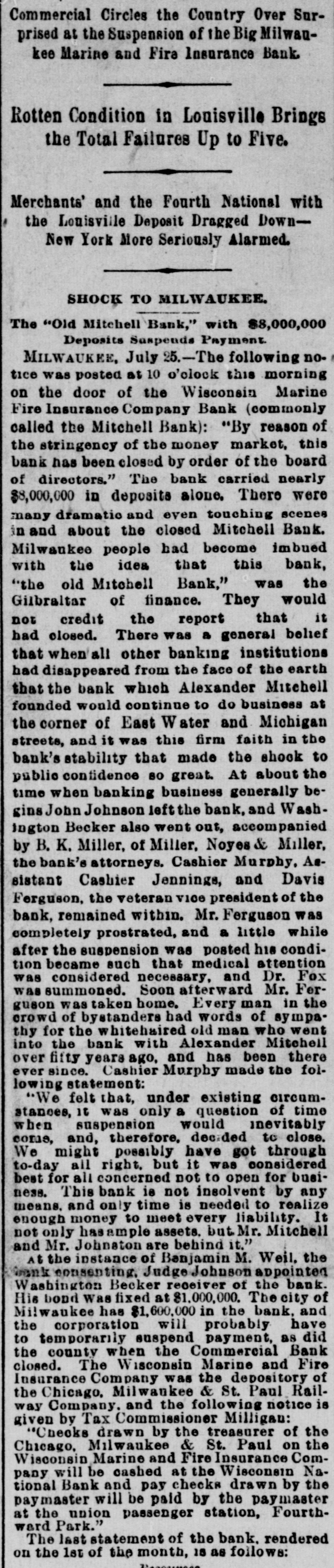 Commercial Circles the Country Over Surprised at the Suspension of the Big Milwaukee Marine and Fira Insurance Bank Rotten Condition in Louisville Brings the Total Failures Up to Five. Merchants' and the Fourth National with the Louisville Deposit Dragged DownNew York More Seriously Alarmed. SHOCK TO MILWAUKEE. The "Old Mitchell Bank," with $8,000,000 Deposits Suspends Payment MILWAUKEE, July 25.-The following notice was posted at 10 o'clock this morning on the door of the Wisconsin Marine Fire Insurance Company Bank (commonly called the Mitchell Bank): "By reason of the stringency of the money market, this bank has been closed by order of the board of directors." The bank carried nearly $8,000,000 in deposits alone. There were many dramatic and even touching scenes in and about the closed Mitchell Bank. Milwaukee people had become imbued with the idea that this bank, "the old Mitchell Bank," was the Gilbraltar of finance. They would not credit the report that it had closed. There was a general belief that when all other banking institutions had disappeared from the face of the earth that the bank which Alexander Mitchell founded would continue to do business at the corner of East Water and Michigan streets, and it was this firm faith in the bank's stability that made the shook to public confidence 80 great. At about the time when banking business generally begins John Johnson left the bank, and Washlogton Becker also went out, accompanied by B. K. Miller, of Miller. Noyes & Miller, the bank's attorneys. Cashier Murphy. Assistant Cashier Jennings, and Davis Ferguson, the veteran V100 president of the bank, remained within. Mr. Ferguson was completely prostrated, and a little while after the suspension was posted his condition became such that medical attention was considered necessary, and Dr. Fox was summoned. Soon afterward Mr. Forguson was taken home. Every man in the crowd of bystanders had words of sympathy for the whitehaired old man who went into the bank with Alexander Mitchell over fifty years ago, and has been there ever since. Cashier Murphy made the following statement: "We felt that, under existing circumstances, it was only a question of time when suspension would inevitably come, and, therefore, decided to close. We might possibly have got through to-day all right. but it was considered best for all concerned not to open for business. This bank is not insolvent by any means. and only time is needed to realize enough money to meet every liability. It not only sample assets. but Mr. Mitchell and Mr. Johnston are behind it." At the instance of Banjamin M. Weil. the Grank consenting, Judge Johnson appointed Washington Becker receiver of the bank. His bond Was fixed at $1,000,000. The city of Milwaukee has $1,600,000 in the bank. and the corporation will probably have to temporarily suspend payment, as did the county when the Commercial Bank closed. The Wisconsin Marine and Fire Insurance Company was the depository of the Chicago. Milwaukee & St. Paul Railway Company. and the following notice is given by Tax Commissioner Milligan: "Checks drawn by the treasurer of the Chicago, Milwaukee & St. Paul on the Wisconsin Marine and Fire Insurance Company will be cashed at the Wisconsin National Bank and pay checks drawn by the paymaster will be paid by the paymaster at the union passenger station, Fourthward Park." The last statement of the bank. rendered on the 1st of the month, 18 as follows: