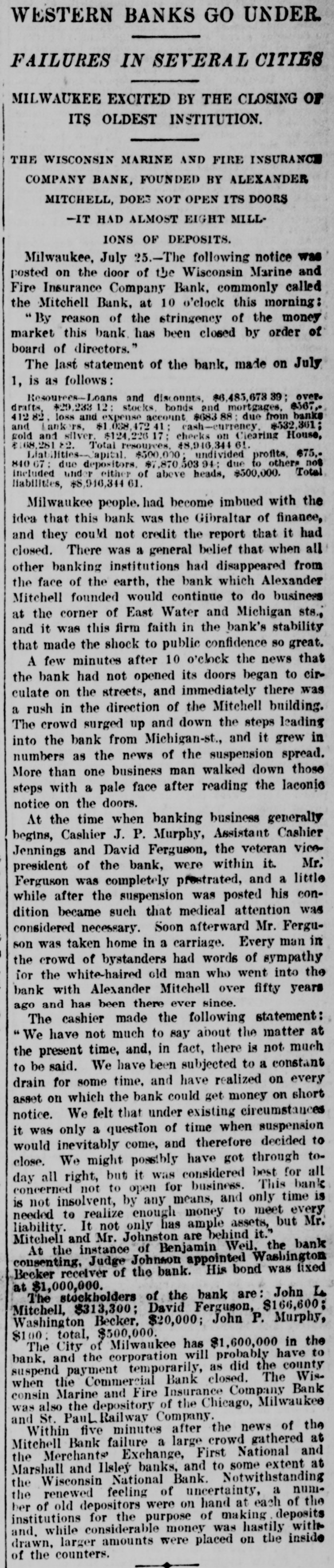 WESTERN BANKS GO UNDER FAILURES IN SEVERAL CITIES MILWAUKEE EXCITED BY THE CLOSING or ITS OLDEST INSTITUTION. THE WISCONSIN MARINE AND FIRE INSURANCE COMPANY BANK, FOUNDED BY ALEXANDER MITCHELL, DOES NOT OPEN ITS DOORS -IT HAD ALMOST EIGHT MILLIONS OF DEPOSITS. Milwaukee, July 25.-The following notice was posted on the door of the Wisconsin Marine and Fire Insurance Company Bank, commonly called the Mitchell Bank, at 10 o'clock this morning: By reason of the stringency of the money market this bank has been closed by order of board of directors." The last statement of the bank, made on July 1, is as follows: Resources-Loans and discounts. $6,485,673.39; over. drafts, *29.233.12 stocks. bonds and mortgages, 8567, 41282 loss and expense : account 868388; due from banks and Lankers, $1,038,472 41 cash-currency, #532,361; gold and silver. $124,226 17 cheeks on Clearing House, $168.281.82. Total resources, 48,946,344 61. Liabilities Capital. $500,000 undivided profits, $75.840 67 : due depositors. $7,870,503.94: due to others not included under either of above heads, $500,000. Total liabilities, $8,946,344 61. Milwaukee people. had become imbued with the idea that this bank was the Gibraltar of finance, and they could not credit the report that it had closed. There was a general belief that when all other banking institutions had disappeared from the face of the earth, the bank which Alexander Mitchell founded would continue to do business at the corner of East Water and Michigan sts., and it was this firm faith in the bank's stability that made the shock to public confidence so great. A few minutes after 10 o'clock the news that the bank had not opened its doors began to circulate on the streets, and immediately there was a rush in the direction of the Mitchell building. The crowd surged up and down the steps leading into the bank from Michigan-st., and it grew in numbers as the news of the suspension spread. More than one business man walked down those steps with a pale face after reading the laconio notice on the doors. At the time when banking business generally begins, Cashier J. P. Murphy, Assistant Cashier Jennings and David Ferguson, the veteran vicepresident of the bank, were within it. Mr. Ferguson was completely prestrated, and a little while after the suspension was posted his condition became such that medical attention was considered necessary. Soon afterward Mr. Ferguson was taken home in a carriage. Every man in the crowd of bystanders had words of sympathy for the white-haired old man who went into the bank with Alexander Mitchell over fifty years ago and has been there ever since. The cashier made the following statement: We have not much to say about the matter at the present time, and, in fact, there is not much to be said. We have been subjected to a constant drain for some time, and have realized on every asset on which the bank could get money on short notice. We felt that under existing circumstances it was only a question of time when suspension would inevitably come, and therefore decided to close. We might possibly have got through today all right, but it was considered best for all concerned not to open for business. This bank is not insolvent, by any means, and only time is needed to realize enough money to meet every liability. It not only has ample assets, but Mr. Mitchell and Mr. Johnston are behind it. At the instance of Benjamin Weil, the bank consenting, Judge Johnson appointed Washington Becker receiver of the bank. His bond was fixed at $1,000,000. The stockholders of the bank are: John L Mitchell, $313,300; David Ferguson, $166,600; Washington Becker, $20,000; John P. Murphy, $100: total, $500,000. The City of Milwaukee has $1,600,000 in the bank. and the corporation will probably have to suspend payment temporarily, as did the county when the Commercial Bank closed. The Wisconsin Marine and Fire Insurance Company Bank s also the depository of the Chicago, Milwaukee and St. auL.Railway Company. Within five minutes after the news of the Mitchell Bank failure a large crowd gathered at the Merchants Exchange, First National and Marshall and Ilsley banks, and to some extent at the Wisconsin National Bank. Notwithstanding the renewed feeling of uncertainty, a number of old depositors were on hand at each of the institutions for the purpose of making deposits and, while considerable money was hastily with drawn, larger amounts were placed on the inside of the counters.