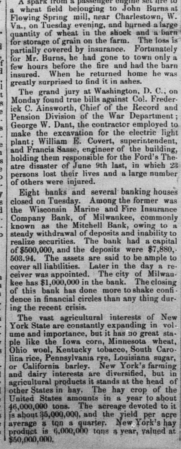 A spark a passenger engine a wheat field belonging to John Burns at Flowing Spring mill, near Charlestown, W. Va., on Tuesday evening, and burned a large quantity of wheat in the shock and a barn for storage of grain on the farm. The loss is partially covered by insurance. Fortunately for Mr. Burns, he had gone to town only a few hours before the fire and had the barn insured. When he returned home he was greatly surprised to find it in ashes. The grand jury at Washington, D. C., on Monday found true bills against Col. Frederoc. ick C. Ainsworth, Chief of the Record and Pension Division of the War Department; George W. Dant, the contractor employed to make the excavation for the electric light plant; William E. Covert, superintendent, and Francis Sasse, engineer of the building, holding them responsible for the Ford's Theatre disaster of June 9th last, in which 23 persons lost their lives and a large number of others were injured. Eight banks and several banking houses closed on Tuesday. Among the former was the Wisconsin Marine and Fire Insurance Company Bank, of Milwankee, commonly known as the Mitchell Bank, owing to a steady withdrawal of deposits and inability to realize securities. The bank had a capital of $500,000, and the deposits were $7,880,503.94. The assets are said to be ample to cover all liabilities. Later in the day a receiver was appointed. The city of Milwaukee has $1,000,000 in the bank. The closing of this bank has done more to shake confidence in financial circles than any thing during the recent crisis. The vast agricultural interests of New York State are constantly expanding in volume and importance, but it has no great staple like the Iowa corn, Minnesota wheat, Ohio wool, Kentucky tobacco, South Carolina rice, Pennsylvania rye, Louisiana sugar, or California barley. New York's farming and dairy interests are diversified, but in agricultural products it stands at the head of other States in hay. The hay crop of the United States amounts in a year to about 46,000,000 tons. The acreage devoted to it is about 35,000,000, and the yield per acre ayerage a ton a quarter. New York's hay product is 6,000,000 tons a year, valued at $50,000,000.