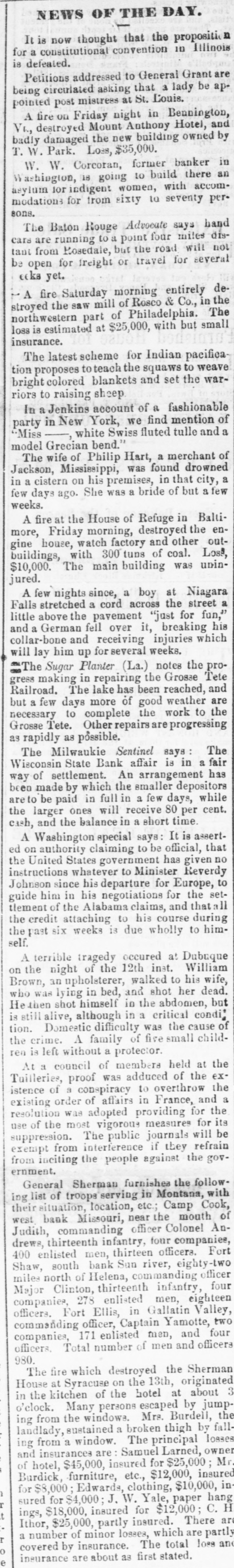 The fire which destroyed the Sherman House at Syracuse on the 13th, originated in the kitchen of the hotel at about 3 o'clock. Many persons escaped by jumping from the windows. Mrs. Burdell, the landlady, sustained a broken thigh by falling from a window. The principal losses and insurances are: Samuel Larned, owner of hotel, $45,000, insured for $25,000; Mr. Burdick, furniture, etc., $12,000, insured for $8,000; Edwards, clothing, $10,000, insured for $4,000; J. W. Yale, paper hangings, $18,000, insured for $12,000; C. H. Ithor, $25,000, partly insured. There are a number of minor losses, which are partly covered by insurance. The total loss and insurance are about as first stated.