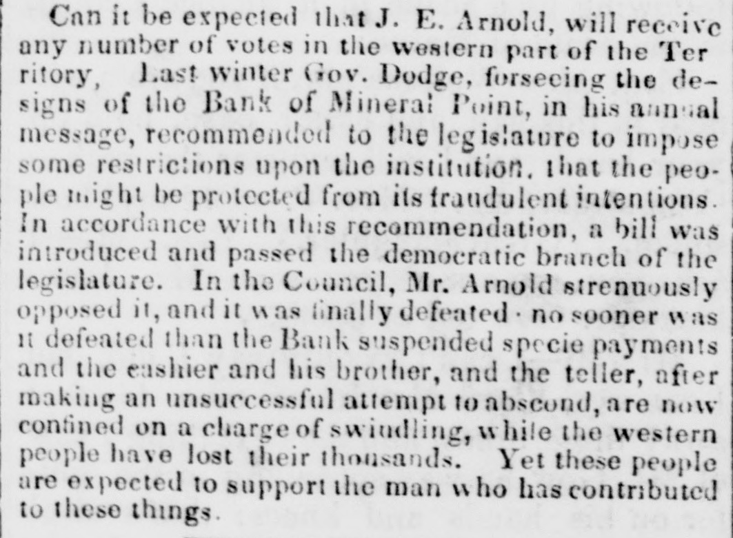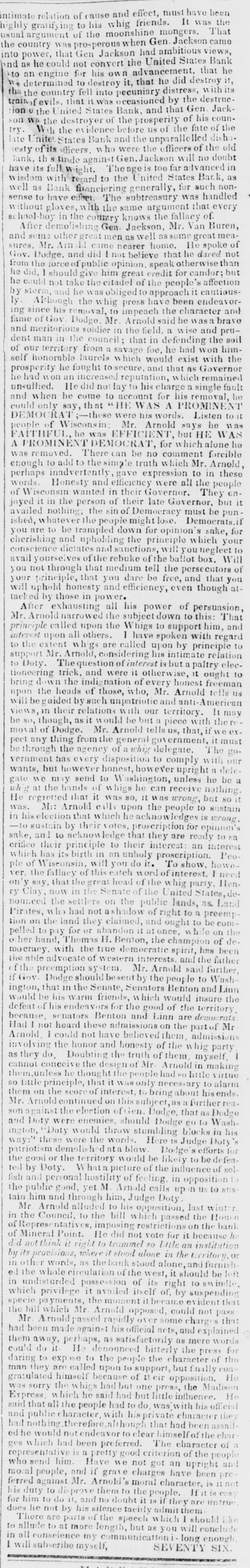Intimate relation of cause and effect, must have been highly gratifying to his whig friends. It was the usual argument of the moonshine mongers. That the country was prosperous when Gen. Jackson came into power, that Gen Jackson had ambitious views, and as he could not convert the United States Bank to an engine for his own advancement, that he We determined to destroy it, that he did destroy it, tha the country fell into pecuniary distress, with its train of evils, that it was occasioned by the destruction o the United States Bank, and that Gen. Jackson wa the destroyer of the prosperity of his country. With the evidence before us of the fate of the late Unite States Bank and the unparallelled dishonesty of its officers, who were the officers of the old Bank, th's tinde against Gen. Jackson will no doubt have its full weight. The age is too far advanced in wisdom with regard to the United States Bark, as well as Bank financiering generally, for such nonsense to have efeet. The subtreasury was handled without gloves, with the same argument that every school-boy in the country knows the fallacy of. After demolislung Gen. Jackson, Mr. Van Buren, and some other great men as well as some great measures, Mr. Arnold came nearer home. He spoke of Gov. Dodge, and did I not believe that he dared not from the force of public opinion, speak otherwise than he did, I should give him great credit for candor; but he could not take the citadel of the people's affection by storm, and he was obliged to approach it cautiously. Although the whig press have been endeavoring since his removal, to impeach the character and fame of Gov. Dodge, Mr. Arnold said he was a brave and meritorious soldier in the field, a wise and prudent man in the council; that in defending the soil of our territory from a savage foe, he had won himself honorable laurels which would exist with the prosperity he fought to secure, and that as Governor he had won an increased reputation, which remained unsullied. He did not lay to his charge a single fault and when he come to account for his removal, he could only say, that "HE WAS A PROMINENT DEMOCRAT; -these were his words. Listen to it people of Wisconsin; Mr. Arnold says he was FAITHFUL, he was EFFICIENT, but HE WAS A PROMINENT DEMOCRAT, for which alone he was removed. There can be no comment forcible enough to add to the simple truth which Mr. Arnold, perhaps inadvertently, gave expression to in these words. Honesty and efficiency were all the people of Wisconsin wanted in their Governor. They enjoyed it in the person of their late Governor, but it availed nothing; the sin of Democracy must be punished, whatever the people might lose. Democrats. if you are to be trampled down for opinion's sake, for cherishing and upholding the principle which your conscience dictates and sanctions, will you neglect to avail yourselves of the rebuke of the ballot box. Will you not through that medium tell the persecutors of your principle, that you dare be free, and that you will uphold honesty and efficiency, even though attacked by those in power. After exhausting all his power of persuasion, Mr. Arnold narrowed the subject down to this: That principle called upon the Whigs to support him, and interest upon all others. I have spoken with regard to the extent whigs are called upon by principle to support Mr. Arnold, considering his intimate relation to Doty. The question of interest is but a paltry electioneering trick, and were it otherwise, it ought to bring down the indignation of every honest freeman upon the heads of those, who, Mr. Arnold tells us will be guided by such unpatriotic and anti-American views, in their relations with our territory. It may be so, though, as it would be but a piece with the removal of Dodge. Mr. Arnold tells us, that, if we expect any thing from the general government, it must be through the agency of a whig delegate. The government has every disposition to comply with our wants, but however honest, however upright a delegate we may send to Washington, unless he be a whig at the hands of whigs he can receive nothing. He regretted that it was so, it was wrong, but so it was. M:: Arnold calls upon the people to sustain in his election that which he acknowledges is wrong, -to sustain by their votes, proscription for opinion's sake, and to acknowledge that they are ready to sacrifice their principle to their interest: an interest which has its birth in an unholy proscription. People of Wisconsin, will you do it. To show, however, the fallacy of this catch word of interest, I need on'y say, that the great head of the whig party. Henry Clay, now in the Senate of the United States, denounced the settlers on the public lands, as, Land Pirates, who had not a shadow of right to a preemption on the land they claimed, and ought to be compelled to pay for or abandon it at once, while on the other hand, Thomas H. Benton, the champion of democracy, with the true democratie spirit, has been the able advocate of western interests, and the father of the preemption system. Mr. Arnold said further, if Gov. Dodge should be sent by the people to Washington, that in the Senate, Senators Benton and Linn would be his warm friends, which would insure the defeat of his endeavors for the good of the territory, because, senators Benton and Linn are democrats. Had I not heard these adraissions on the part of Mr Arnold, I could not have believed them, admissions involving the honor and honesty of the whig party as they do, Doubting the truth of them, myself, I cannot conceive the design of Mr. Arnold in making them, unless he thought the people had so little virtue so little principle, that it was only necessary to alarm them on the score of interest, to bring about his ends. Mr. Arnold continued on this subject, as a further reason against the election of Gen. Dodge, that as Dodge and Doty were enemies, should Dodge go to Washington, "Doty would throw stumbling blocks in his way:" these were th