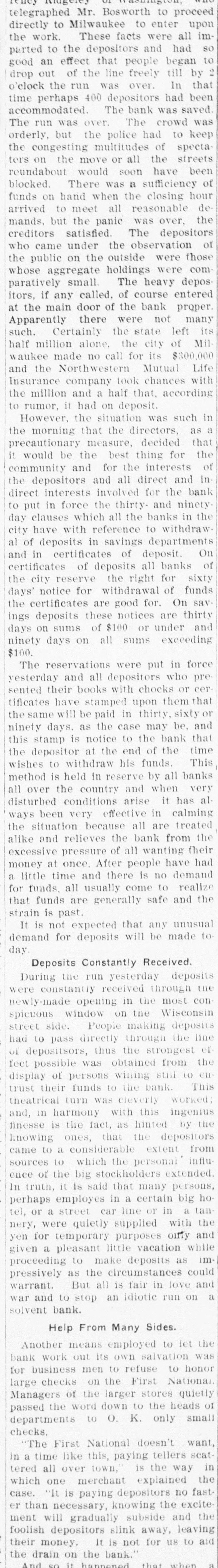 tificates have stamped upo the same will be paid in thi ninety days. as the case n this stamp is notice to the the depositor at the end o wishes to withdraw his fu method is held in reserve I all over the country and disturbed conditions arise ways been very effective the situation because all alike and relieves the ban excessive pressure of all w money at once. After peop a little time and there is for funds. all usually come that funds are generally S strain is past. It is not expected that : demand for deposits will day. Deposits Constantly R During the run yesterda were constantly received newly-made opening in the spicuous window on the street side. People maki had to pass directly throt of depositsors, thus the S fect possible was obtaine display of persons willing trust their funds to the D theatrical turn was clever and, in harmony with th finesse is the fact, as hin knowing ones, that the came to a considerable e sources to which the per ence of the big stockholde In truth, it is said that ma perhaps employes in a cer tel, or a street car line o nery, were quietly supplie yen for temporary purpos given a pleasant little va proceeding to make depo pressively as the circumst warrant. But all is fair war and to stop an idioti solvent bank. Help From Many S Another means employe bank work out its own sa for business men to refus large checks on the Firs Managers of the larger st passed the word down to 1 departments to O. K. checks. "The First National do in a time like this, paying tered all over town," is which one merchant ex) case. "It is paying deposit er than necessary, knowin; ment will gradually subsi foolish depositors slink av their money. It is not 1 the drain on the bank." And so it hannened th