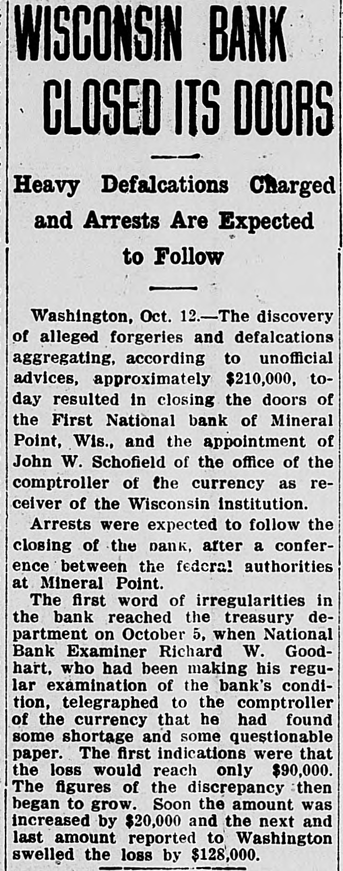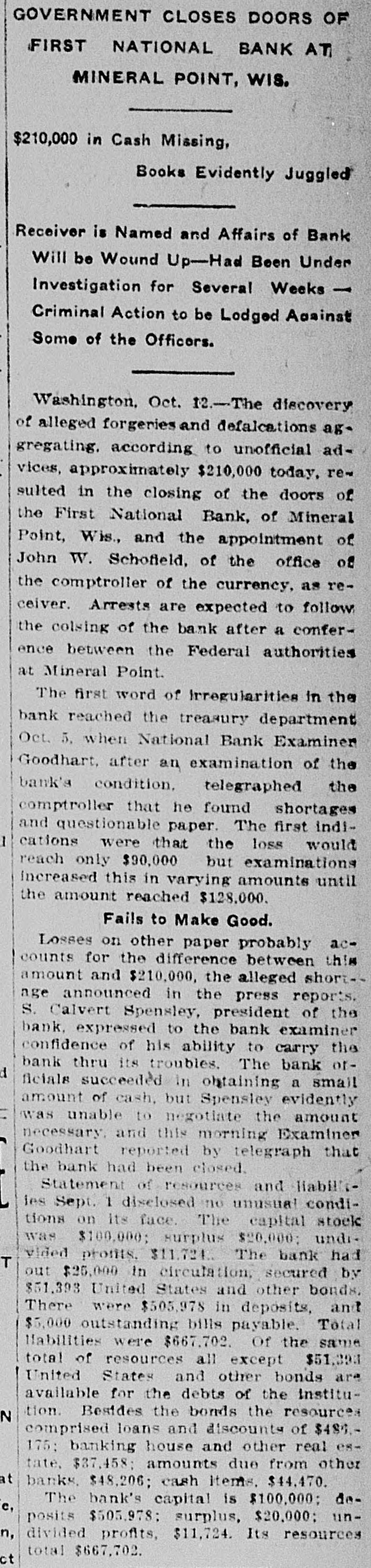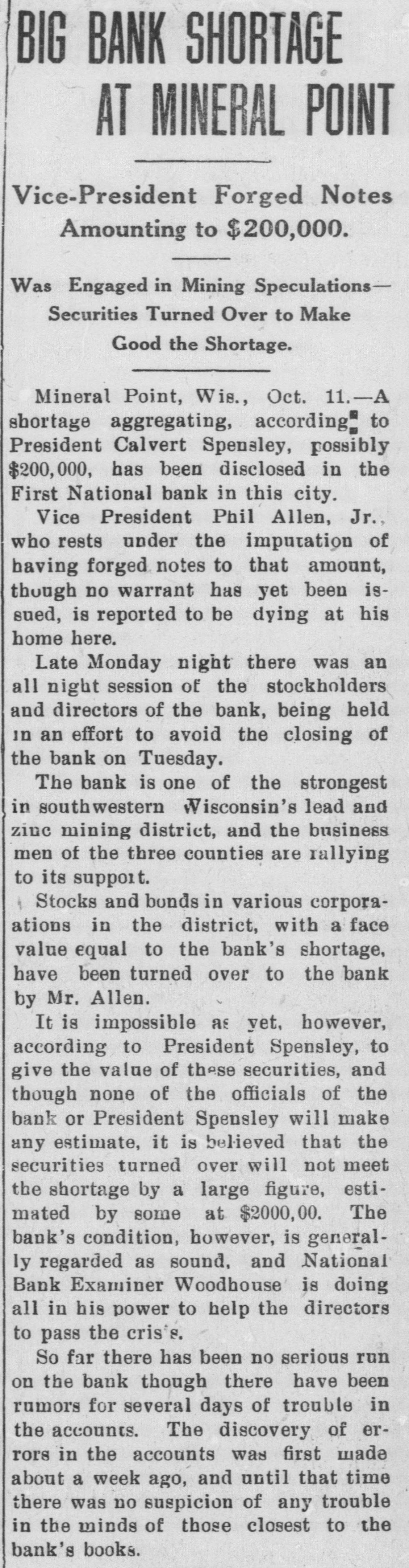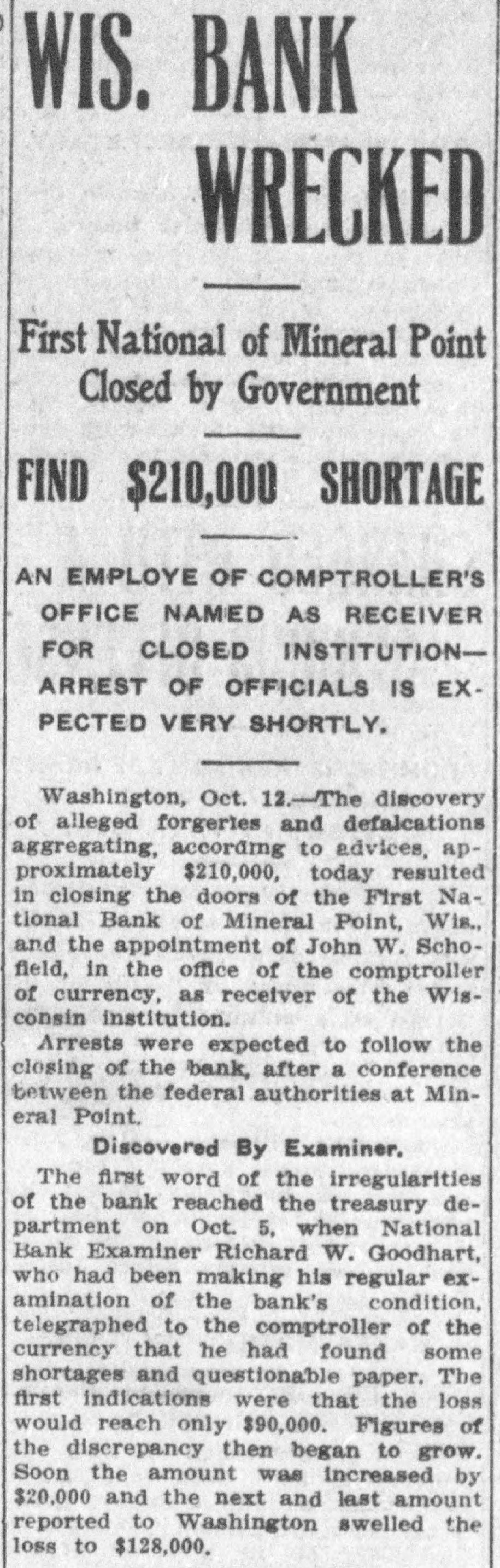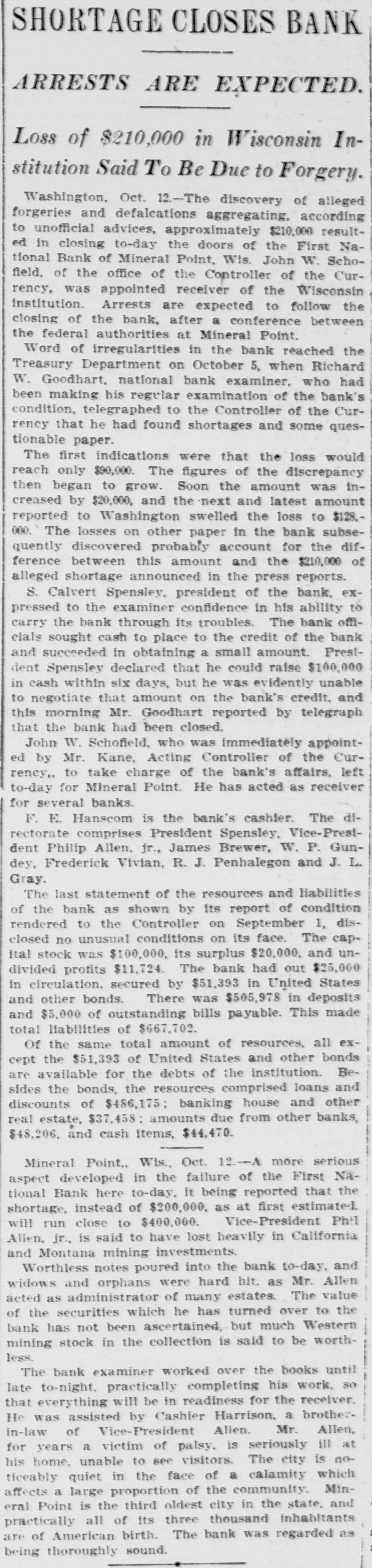 SHORTAGE CLOSES BANK ARRESTS ARE EXPECTED. Loss of $210,000 in Wisconsin Institution Said To Be Due to Forgery. Washington, Oct. 12.-The discovery of alleged forgeries and defalcations aggregating, according to unofficial advices, approximately $210,000 resulted in closing to-day the doors of the First National Bank of Mineral Point, Wis. John W. Schofield, of the office of the Controller of the Currency, was appointed receiver of the Wisconsin institution. Arrests are expected to follow the closing of the bank, after a conference between the federal authorities at Mineral Point. Word of irregularities in the bank reached the Treasury Department on October 5, when Richard W. Goodhart, national bank examiner, who had been making his regular examination of the bank's condition, telegraphed to the Controller of the Currency that he had found shortages and some questionable paper. The first indications were that the loss would reach only $90,000. The figures of the discrepancy then began to grow. Soon the amount was increased by $20,000, and the next and latest amount reported to Washington swelled the loss to $128,000. The losses on other paper in the bank subsequently discovered probably account for the difference between this amount and the $210,000 of alleged shortage announced in the press reports. S. Calvert Spensley, president of the bank, expressed to the examiner confidence in his ability to carry the bank through its troubles. The bank officials sought cash to place to the credit of the bank and succeeded in obtaining a small amount. Prestdent Spensley declared that he could raise $100,000 in cash within six days, but he was evidently unable to negotiate that amount on the bank's credit, and this morning Mr. Goodhart reported by telegraph that the bank had been closed. John W. Schofield, who was immediately appointed by Mr. Kane, Acting Controller of the Currency,, to take charge of the bank's affairs, left to-day for Mineral Point. He has acted as receiver for several banks. F. E. Hanscom is the bank's cashier. The directorate comprises President Spensley, Vice-Prestdent Philip Allen. jr., James Brewer, W. P. Gundey, Frederick Vivian, R. J. Penhalegon and J. L. Gray. The last statement of the resources and liabilities of the bank as shown by its report of condition rendered to the Controller on September 1, disclosed no unusual conditions on its face. The capital stock was $100,000, its surplus $20,000, and undivided profits $11,724. The bank had out $25,000 in circulation. secured by $51,393 in United States and other bonds. There was $505,978 in deposits and $5,000 of outstanding bills payable. This made total liabilities of $667,702. Of the same total amount of resources, all except the $51,393 of United States and other bonds are available for the debts of the institution. Besides the bonds, the resources comprised loans and discounts of $486,175 : banking house and other real estate, $37,458: amounts due from other banks, $48,206. and cash items, $44,470. Mineral Point., Wis., Oct. 12.-A more serious aspect developed in the failure of the First National Bank here to-day, it being reported that the shortage, instead of $200,000, as at first estimated. will run close to $400,000. Vice-President Phil Allen, jr., is said to have lost heavily in California and Montana mining investments. Worthless notes poured into the bank to-day, and widows and orphans were hard hit. as Mr. Allen acted as administrator of many estates. The value of the securities which he has turned over to the bank has not been ascertained, but much Western mining stock in the collection is said to be worthless. The bank examiner worked over the books until late to-night, practically completing his work, so that everything will be in readiness for the receiver. He was assisted by Cashier Harrison, a brotherin-law of Vice-President Allen. Mr. Allen, for years a victim of palsy, is seriously ill at his home, unable to see visitors. The city is noticeably quiet in the face of a calamity which affects a large proportion of the community. Mineral Point is the third oldest city in the state, and practically all of its three thousand inhabitants are of American birth. The bank was regarded as being thoroughly sound.