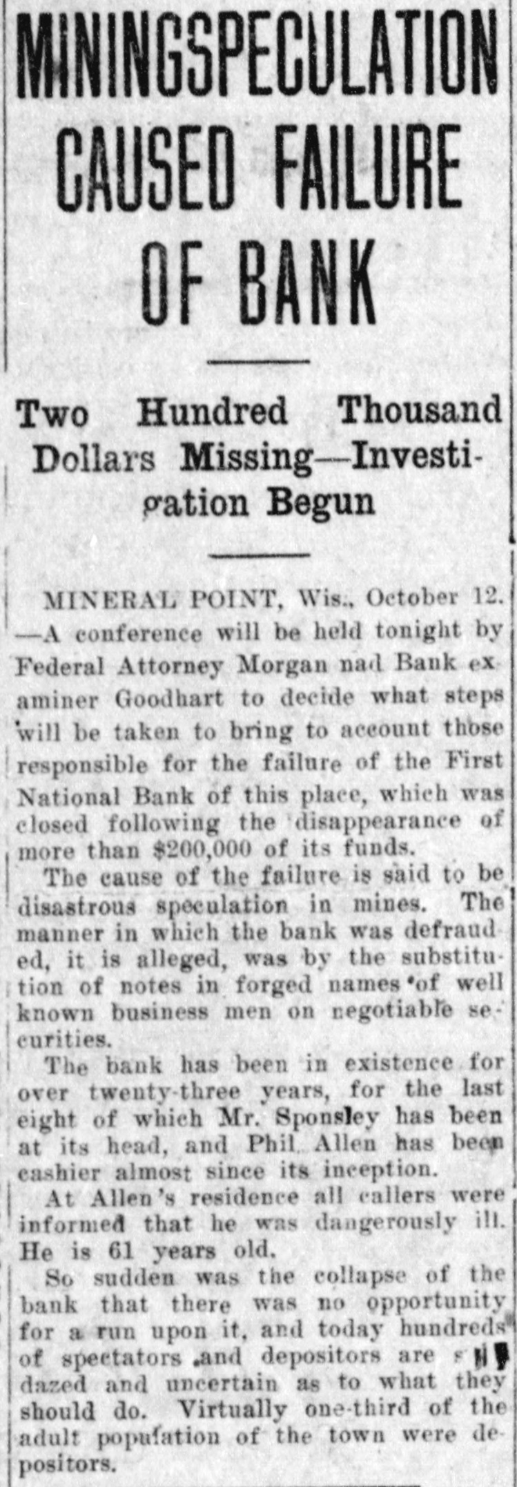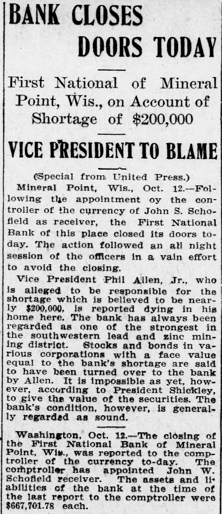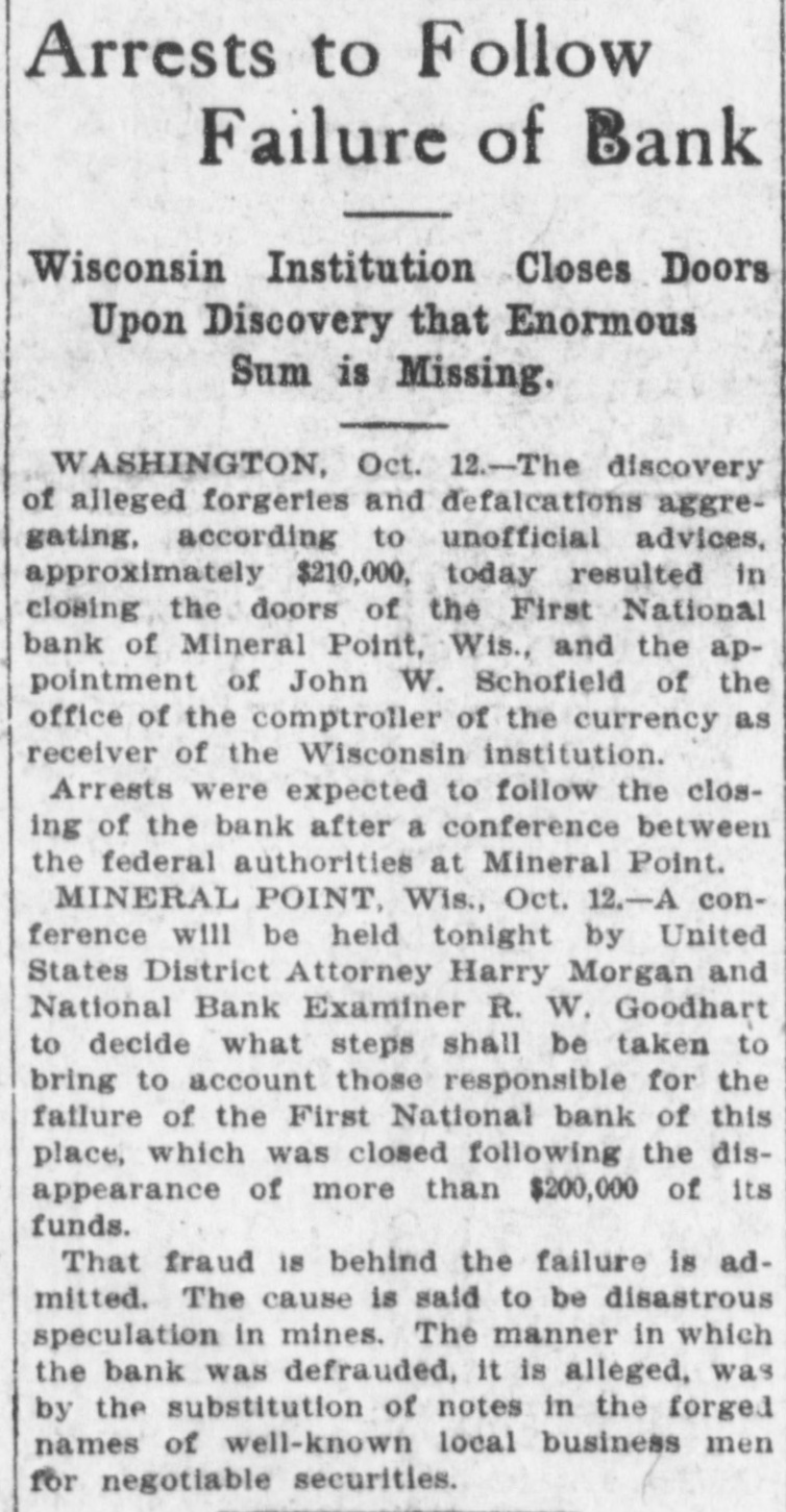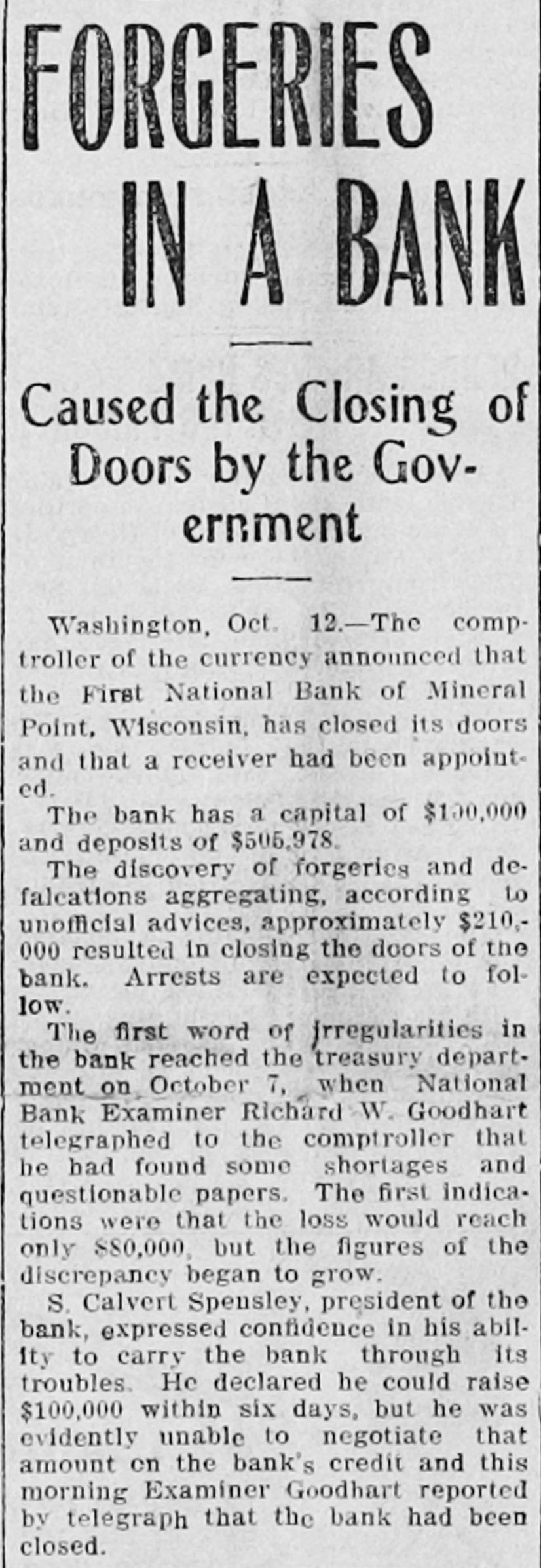 SHORTAGE CLOSES BANK ARRESTS ARE EXPECTED. Loss of $210,000 in Wisconsin Institution Said To Be Due to Forgery. Washington, Oct. 12.-The discovery of alleged forgeries and defalcations aggregating, according to unofficial advices, approximately $210,000 resulted in closing to-day the doors of the First National Bank of Mineral Point, Wis. John W. Schofield, of the office of the Controller of the Currency, was appointed receiver of the Wisconsin institution. Arrests are expected to follow the closing of the bank, after a conference between the federal authorities at Mineral Point. Word of irregularities in the bank reached the Treasury Department on October 5, when Richard W. Goodhart, national bank examiner, who had been making his regular examination of the bank's condition, telegraphed to the Controller of the Currency that he had found shortages and some questionable paper. The first indications were that the loss would reach only $90,000. The figures of the discrepancy then began to grow. Soon the amount was increased by $20,000, and the next and latest amount reported to Washington swelled the loss to $128,000. The losses on other paper in the bank subsequently discovered probably account for the difference between this amount and the $210,000 of alleged shortage announced in the press reports. S. Calvert Spensley, president of the bank, expressed to the examiner confidence in his ability to carry the bank through its troubles. The bank officials sought cash to place to the credit of the bank and succeeded in obtaining a small amount. Prestdent Spensley declared that he could raise $100,000 in cash within six days, but he was evidently unable to negotiate that amount on the bank's credit, and this morning Mr. Goodhart reported by telegraph that the bank had been closed. John W. Schofield, who was immediately appointed by Mr. Kane, Acting Controller of the Currency,, to take charge of the bank's affairs, left to-day for Mineral Point. He has acted as receiver for several banks. F. E. Hanscom is the bank's cashier. The directorate comprises President Spensley, Vice-Prestdent Philip Allen. jr., James Brewer, W. P. Gundey, Frederick Vivian, R. J. Penhalegon and J. L. Gray. The last statement of the resources and liabilities of the bank as shown by its report of condition rendered to the Controller on September 1, disclosed no unusual conditions on its face. The capital stock was $100,000, its surplus $20,000, and undivided profits $11,724. The bank had out $25,000 in circulation. secured by $51,393 in United States and other bonds. There was $505,978 in deposits and $5,000 of outstanding bills payable. This made total liabilities of $667,702. Of the same total amount of resources, all except the $51,393 of United States and other bonds are available for the debts of the institution. Besides the bonds, the resources comprised loans and discounts of $486,175 : banking house and other real estate, $37,458: amounts due from other banks, $48,206. and cash items, $44,470. Mineral Point., Wis., Oct. 12.-A more serious aspect developed in the failure of the First National Bank here to-day, it being reported that the shortage, instead of $200,000, as at first estimated. will run close to $400,000. Vice-President Phil Allen, jr., is said to have lost heavily in California and Montana mining investments. Worthless notes poured into the bank to-day, and widows and orphans were hard hit. as Mr. Allen acted as administrator of many estates. The value of the securities which he has turned over to the bank has not been ascertained, but much Western mining stock in the collection is said to be worthless. The bank examiner worked over the books until late to-night, practically completing his work, so that everything will be in readiness for the receiver. He was assisted by Cashier Harrison, a brotherin-law of Vice-President Allen. Mr. Allen, for years a victim of palsy, is seriously ill at his home, unable to see visitors. The city is noticeably quiet in the face of a calamity which affects a large proportion of the community. Mineral Point is the third oldest city in the state, and practically all of its three thousand inhabitants are of American birth. The bank was regarded as being thoroughly sound.